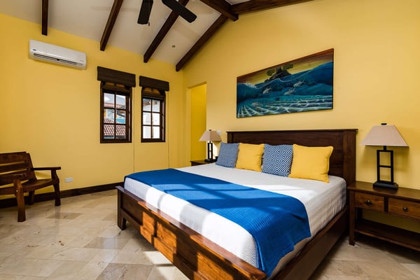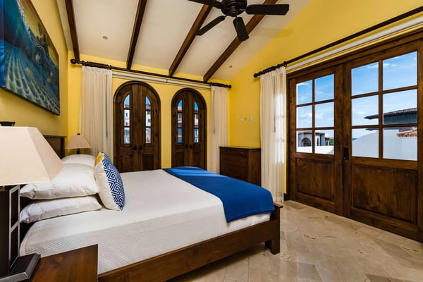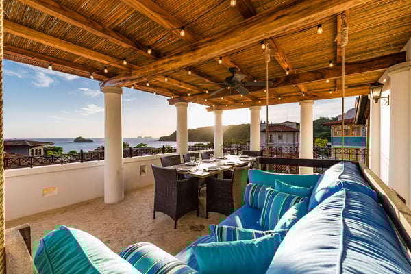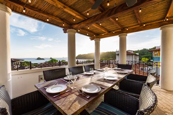 Nearby construction may result in noise disturbances. For further details on how this might affect your stay, please reach out to a villa specialist. Located in the Plaza Carlota flats in the middle of downtown Las Catalinas, this flat was built for entertaining. The natural social hub of the home begins in the flat’s open living space, which, while cozy and inviting, is really just an entryway to the home’s crown jewel: a covered rooftop terrace. It’s bright, airy lighting and fresh ocean breeze can comfortably seat up to eight. Enjoy views of the ocean, mountains, and local neighborhood on an oversized couch swing. Bedrooms on either side of the home each have their own little outdoor space (a juliette balcony) and ensuite bathrooms. For more room, a pull out queen sofa bed in the living room can easily sleep two more people. At sunset, the covered terrace becomes an ideal venue to host dinner parties. Using the full kitchen just below, a private chef can be arranged to prepare dinner for the evening, letting you fully enjoy the glowing pink, orange sky with your guests.
