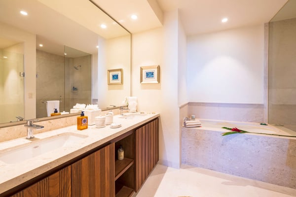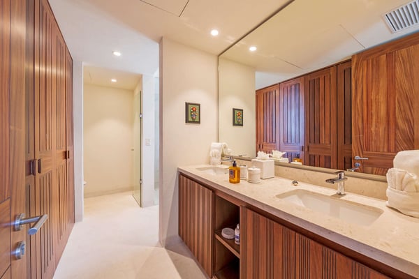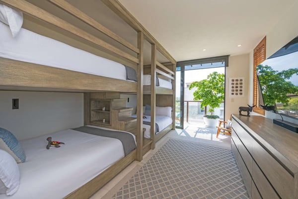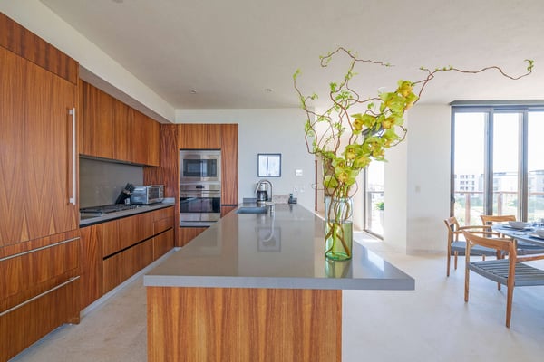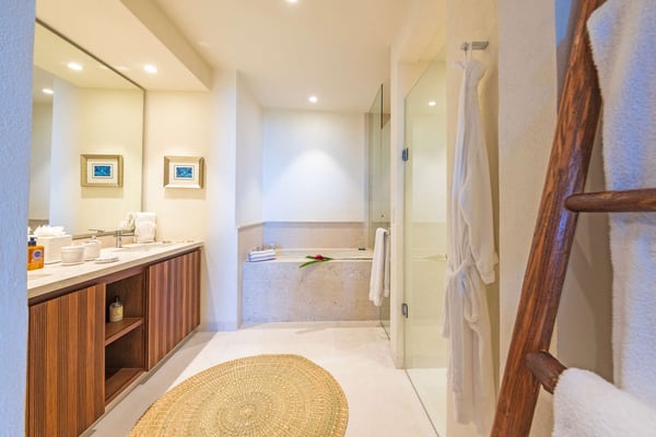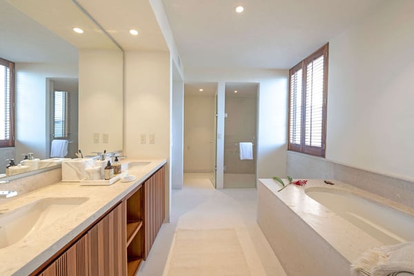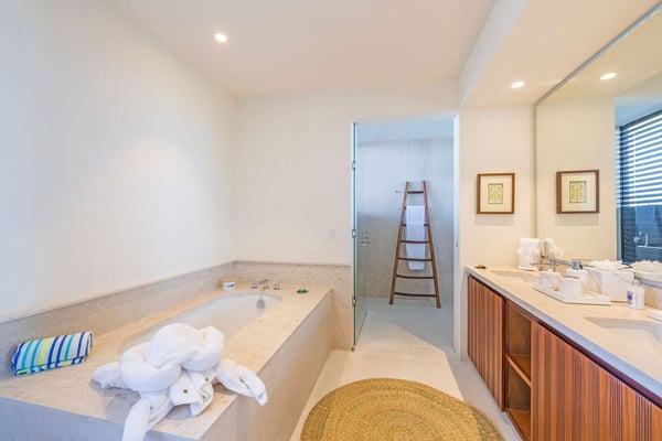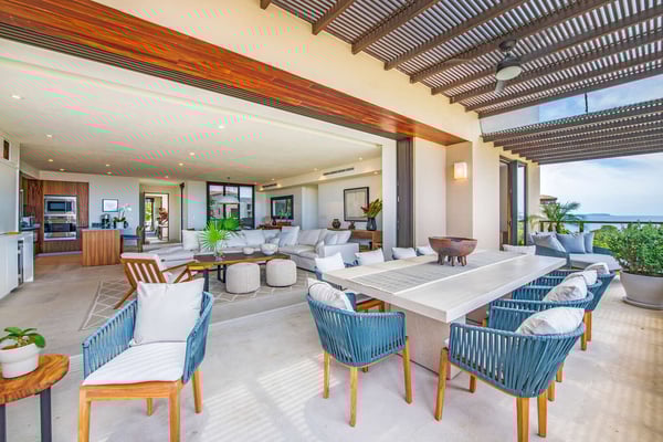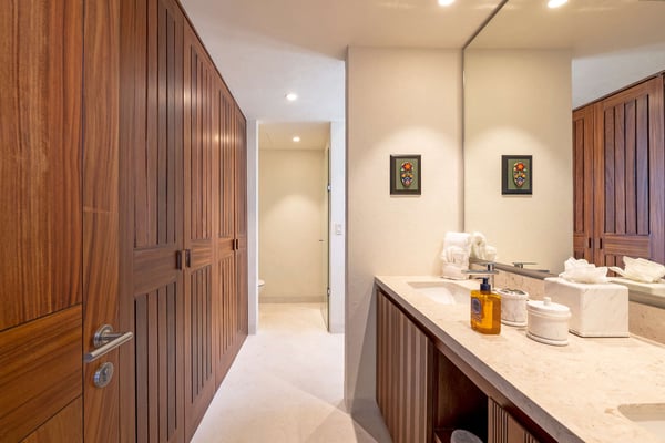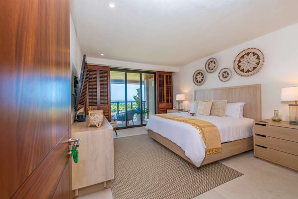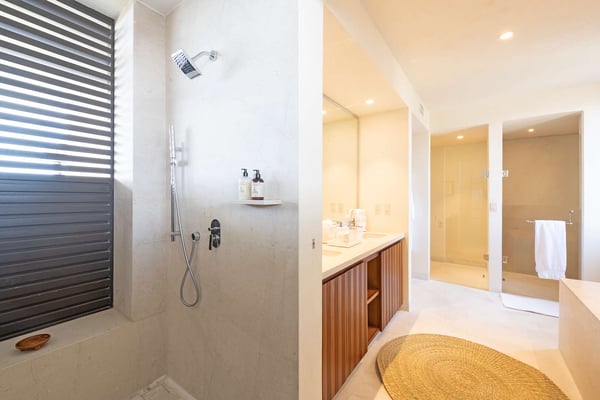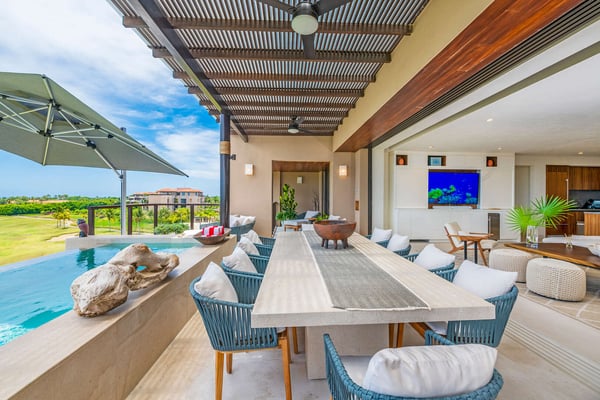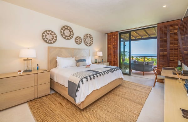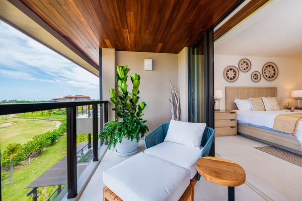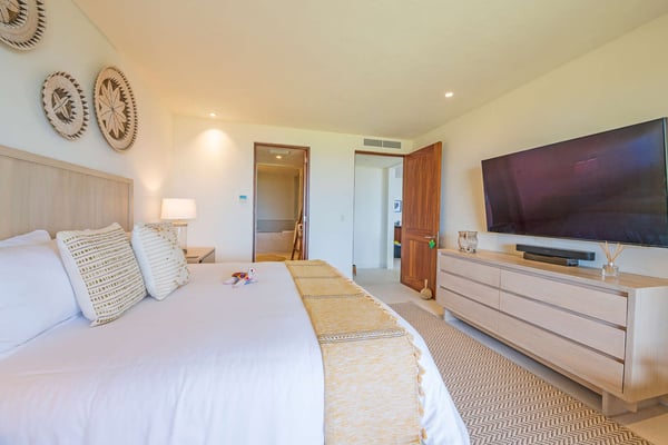 The Premier Golf Membership grants access to Pacifico Golf Course ($), Bahia Golf Course ($), the Tennis Centre ($), the Fitness Center ($), El Surf Club based on min. consumption fee ($), St.Regis Beach Club based on availability and min. consumption fee ($), Pacifico Beach Club, Sufí Ocean Club and Kupuri Beach Club. Contact one of our Villa Specialists for more information. Condo Carey is ideally situated alongside the 18th hole of the Jack Nicklaus Signature Bahía Golf Course, within the prestigious gates of Punta Mita, home to the world-renowned Four Seasons resort and a collection of exceptional dining options. This elegant residence offers a unique blend of contemporary sophistication with stunning ocean views from its two master bedrooms, each featuring an en-suite bathroom and a luxurious outdoor shower. The expansive private terrace, complete with a plunge pool, seamlessly connects the separate living and dining areas, providing an ideal setting for relaxation and entertainment.