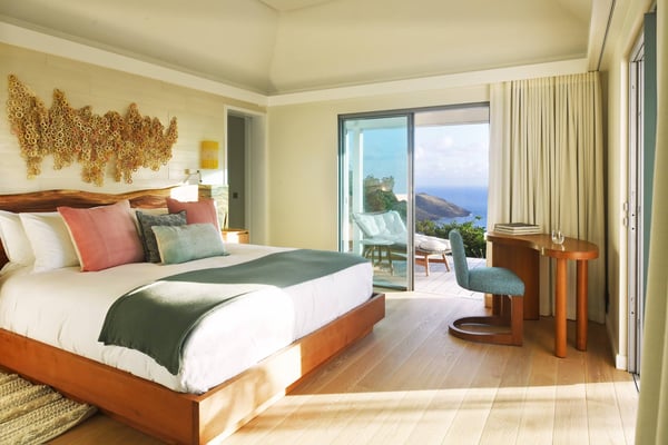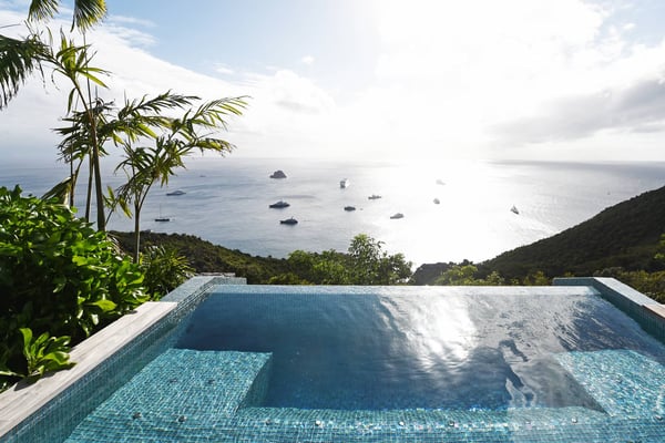 As you enter Villa Fleur de Mer, the gentle sound of water cascading down beside the walkway signals that it is time to relax. You have arrived at the modern version of true colonial grandeur, richly appointed with fine furniture and art--and with a view like no other, an unforgettable expanse of sea and sky so captivating that you can hardly tear yourself away to look at anything else. To update a traditional style, Villa Fleur de Mer is not isolated from nature but integrated with it. A tyrant bird hops across the terrace in pursuit of an errant butterfly. This is a home equally well adapted to the weary traveller seeking peace and quiet or to the host with visions of elegant dinner parties. Step out onto the terrace and imagine yourself sitting down to breakfast at the table between the pool and the palm grove, the most extraordinary view on the entire island stretched out before you. Across the vast expanse of turquoise water, you can make out the islands of Saba and Statia on the horizon. Below you, sailboats out of Gustavia harbour ply the calm sea toward Colombier Beach or Tintamarre. Turn and gaze across the courtyard, through the silhouette of a gaiac tree, you have a view to the east as well, a true panorama. After a pleasant morning spent poolside, you may retreat from the noonday sun into the open living room, still just steps from the refreshing waters of the travertine-tiled infinity pool, one of the largest on the island. Or you can find a shady spot on the master bedroom terrace, surrounded by a drift of bougainvillea blossoms. The master bedroom offers the comfort of a grand four-poster bed. His-and-hers dressing rooms lead into separate bathrooms, complete with two rain-head showers, one inside and the other outside, sheltered by flowering bird-of-paradise plants. Between the master bedroom and the main house of Villa Fleur de Mer, you find the library, furnished with dark wood shelves lined with books, a sumptuous sofa, a flatscreen television and a surround-sound stereo. As throughout the house, the walls are adorned with fine prints of Caribbean flora and fauna. Cross the courtyard from the living area to the four-bedroom suites, each with its own private bath and terrace. These bedrooms offer expansive views to the north and east, from Anse de Flamands and the tiny islands offshore to the far-off hilltops of the island's cote sauvage. The rooms are tastefully decorated with Kenzo fabrics and colonial furniture, and the bathrooms welcome you with soothing tones of polished limestone. Villa Fleur De Mer's elegant dining room provides seating for twelve, with the adjoining kitchen hidden from view in a nod to the refinement of colonial tradition--a use of space perfectly designed for catered parties. The most discerning chef will feel at home in the well-appointed kitchen, with dual SubZero refrigerators, a wine cooler and icemaker, twin Bosch dishwashers and a Lacanche Cote d'Or range. The gas grill on the terrace just outside the kitchen will come to mind whenever you pass the Boucherie de St. Jean on your way home. The cabinets are stocked with service for dozens of guests. Follow a path through the garden to find a hidden, self-contained guest bath accessible without passing through any of the bedrooms. And just steps away, one of the island's best-equipped fitness rooms awaits the motivated with a full complement of Cybex and Life Fitness machines, including twin top-of-the-line Flex Deck treadmills. Whereas many villas' exercise rooms are merely an afterthought, this one clearly is not, with mirrored walls, a full bath, stereo and intercom, a private terrace and of course an exquisite view of the Atlantic.