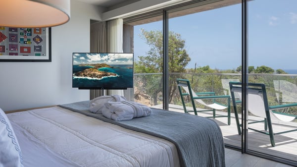 Located in Lorient on a hillside, the luxurious Villa Felicita is a superb contemporary property with an outstanding ocean view in the heart of lush tropical vegetation. With upscale amenities, this seven-bedroom home is the privileged and exclusive place for an exceptional stay in St. Barts. Built on three levels over several buildings, the luxurious villa Felicita is a true architectural gem. In a contemporary style and a decoration by the famous designer Jean-Michel Wilmotte, this house opens widely onto the ocean and offers upscale equipment in a very refined setting. The large living room furnished with sofas, armchairs and off-white-coloured benches in a chic atmosphere lets the gentle trade winds blow in. The dining room can accommodate up to twelve people around a large indoor dining table, where guests can enjoy meals prepared by a private chef in the well-equipped professional kitchen. And for idyllic evenings under Saint Barths’ sky, there are a playing area with a foosball table as well as a cinema room perfect for movie nights in a cozy atmosphere. The front terrace of Villa Felicita is truly dreamy and beautiful. An incredible heated infinity swimming pool stretches along the main building, as a prelude to the ocean. The outdoor dining room accommodates up to twelve guests for succulent alfresco dining under the Caribbean stars. The large deck is furnished with lounge chairs and soft cushions in a heavenly setting of palm trees mixed with Caribbean hills. In the heart of tropical nature, sunbathing and reading sessions in front of the ocean make your stay an unforgettable moment out of time. The sumptuous vacation rental Felicita is composed of seven air-conditioned bedrooms with king or queen-size beds and en-suite bathrooms. They are spread over three levels on several buildings, and open onto magnificent ocean views; the seventh room, ideal for staff or for a teenager, opens onto a beautiful view over the hills. An elevator is also at your disposal to reach the other levels with greater ease and comfort. Sports lovers will appreciate the air-conditioned fitness room with upscale equipment. Between sky, hills and sea, the luxurious Villa Felicita combines a great quality of services with noble materials in a most refined décor, for an unforgettable stay in Saint-Barths.