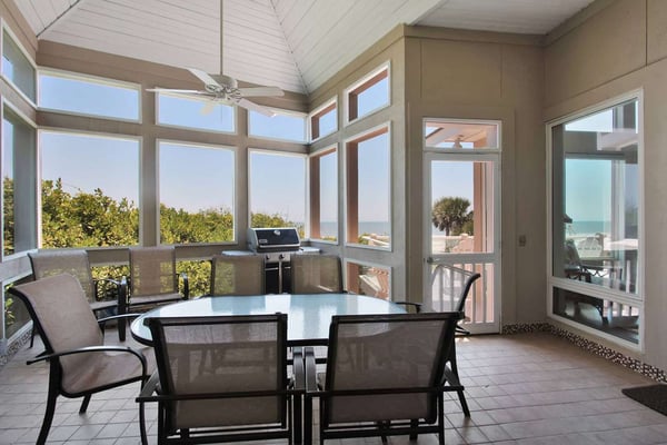 Located on the beautiful island of Hilton Head, Palmetto Dunes offers an array of activities for the entire family to enjoy, such as bike trails, tennis, boating, shopping, golf, kayaking and paddleboarding. The Dunes are also home to loggerhead turtle nests, dolphins and a variety of bird species such as herons and ospreys. This amazing Hilton Head oceanfront home offers spectacular ocean views and luxurious furnishings. Twelve steps lead to the entry where you will find a great room with a sectional couch with a sleeper sofa, decorative chair, wall-mounted flat-screen TV, DVD, stereo, powder room, bar area with a sink, granite, refrigerator, and ice maker. This level has five bedrooms. The first has a king bed, a flat-screen TV with a built-in DVD player, a door to the pool area, an ocean view, and a private bath. The next two bedrooms have queen beds, flat-screen TVs with built-in DVD players, and private baths. The fourth bedroom has a queen bed, a twin bed, a flat-screen TV with a built-in DVD player, and a private bath. Next is a bedroom with 2 queens, a flat-screen TV with a built-in DVD player, a private bath, and doors leading to the pool and spa. A dual staircase leads to the second floor of this beautiful home. The main living area, kitchen, dining area, and primary plus a powder room are located on the second floor. The main living area features a sleeper sofa, a matching sofa, two decorative chairs, plenty of seating, and a door to a spacious balcony overlooking the Atlantic. The beautiful living room also has a wall-mounted plasma flat-screen TV with a DVD player. The kitchen/dining area features two stoves, two dishwashers, all stainless steel, granite countertops, and a laundry room with a full-size washer and dryer. There is seating at the dining bar for seven, plus a formal dining table for nine. Off the dining area is a screened porch overlooking the pool and ocean with a propane grill. Two minutes from the Palmetto Dunes golf course The enormous master suite is furnished with a king bed, flat-screen TV with a built-in DVD player, a door to the oceanfront balcony and a large walk-in closet. The magnificent primary bath has a luxurious shower with body sprays and a rainfall showerhead plus a jacuzzi tub. A spiral staircase from the master leads to a private observation loft overlooking the ocean.
