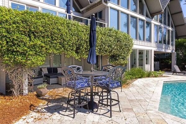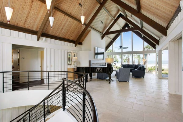 Hilton Head is a small island, popular with golfers, 95 miles from Charleston and 40 miles from Savannah, Georgia. Apart from almost 30 golf courses, it also offers 12 miles of stunning sugar white beaches, marinas and subtropical forests. Here you can hire bikes, beach comb, jog, swim or bird watch in the delightful surroundings of this beautiful tropical island. Amazing oceanfront 5,300 square foot home…..your ideal vacation getaway! The home is perfect for entertaining with six bedrooms, six and a half baths, two large living areas with large TVs (82 inches and 65 inches) and relaxing sitting areas to enjoy the beachfront life. Featuring spectacular ocean views, a large pool with a waterfall feature and outdoor seating with private access to the beach! Main Floor: The two-story entry welcomes you to the home. A wall of windows brings the light into the cozy living room with a large TV, sectional couch and wet bar. Walk out directly to the pool deck. There is travertine tile throughout the entry and living room spaces. On the main floor are three bedrooms with the fourth bedroom set up with a king bed, the fifth bedroom with two Schoolhouse twin bunk beds with stairs and one additional twin trundle and the sixth bedroom with a queen bed. All bedrooms have large plank-styled floors, en suite bathrooms, TVs and closet and drawer storage. The spacious laundry room is also on this level with a matching GE washer and dryer. Top Floor: A curved staircase brings you to the top floor where you will be awed by the +20-foot cathedral ceilings with wood beams that create a natural, light-filled experience. Then take in the view of the beach from the living and dining/kitchen space and the sound of the waves from the deck on this level. The living room takes advantage of the high ceilings with an 82-inch TV mounted over the fireplace mantel, grand piano and comfortable space to enjoy time together or enjoy the view. The dining room has a handcrafted, live-edge custom wood table that seats 14. This leads into the kitchen with a large island, Dacor stainless steel and built-in appliances and well-stocked kitchenware to enjoy a culinary adventure. Step out of the kitchen onto the deck which overlooks the pool. Grill your meal and dine al fresco at the deck table. In addition, there is an office/den space off the kitchen that has a pull-out queen-size sofa and TV. On this floor, there are three bedrooms, all with cathedral ceilings. The first bedroom is the master suite with a king bed and sitting area. The master bathroom has a tray ceiling with an oversized shower and his and her vanities and closets. The second bedroom has a king bed and en suite bathroom. The third bedroom has two side-by-side queen beds and an en suite bathroom with two separate vanities. All bedrooms have TVs and ample storage space. Main Floor Pool Deck: There is room to enjoy the outdoors with a covered patio area that has table-top seating for 6 and a second covered patio area with sectional seating and outdoor toys all leading to the large pool. The upper pool seating area is above the main pool which allows for a gentle waterfall. Nestled below the shade of the palm trees near the beach are loungers. The private path to the beach has a sunning area with more loungers…..and the sound of the waves where you will feel like you are on your own private beach.