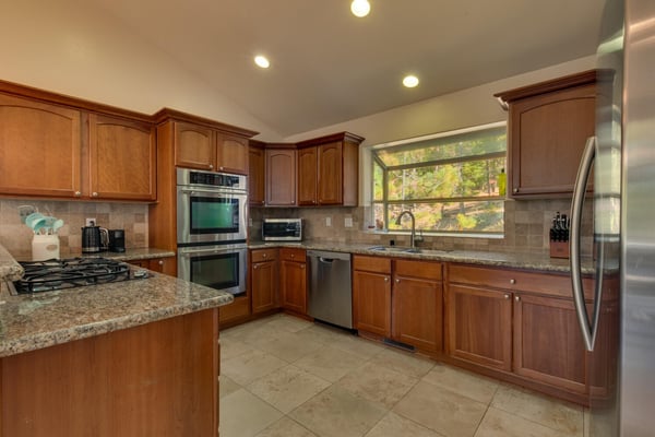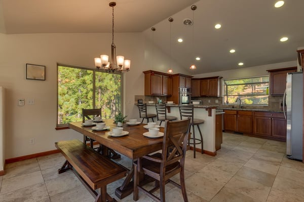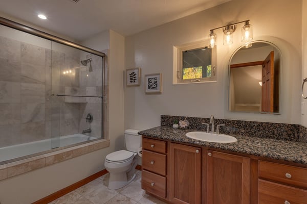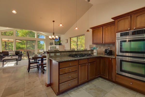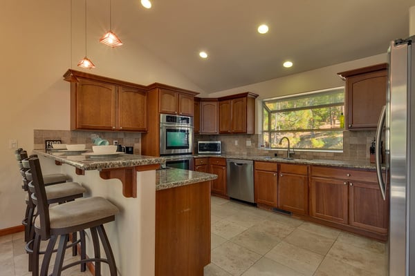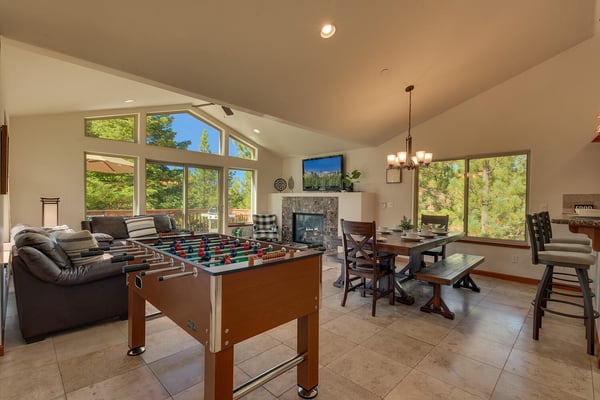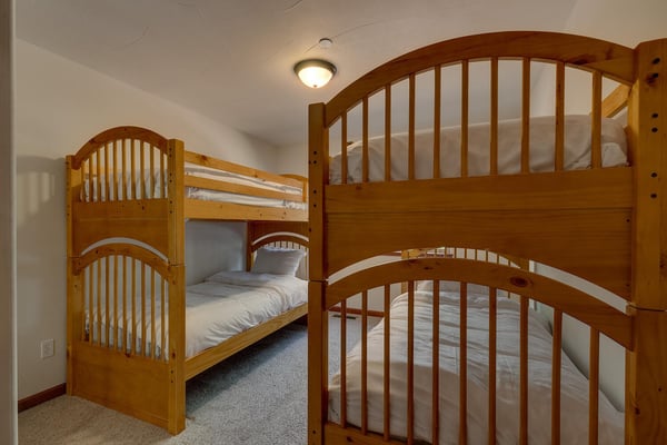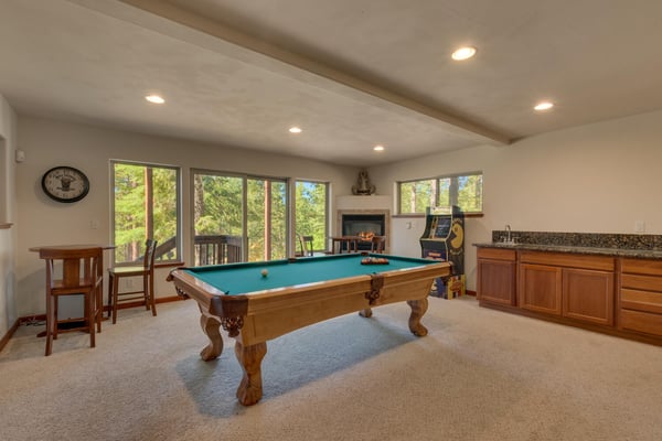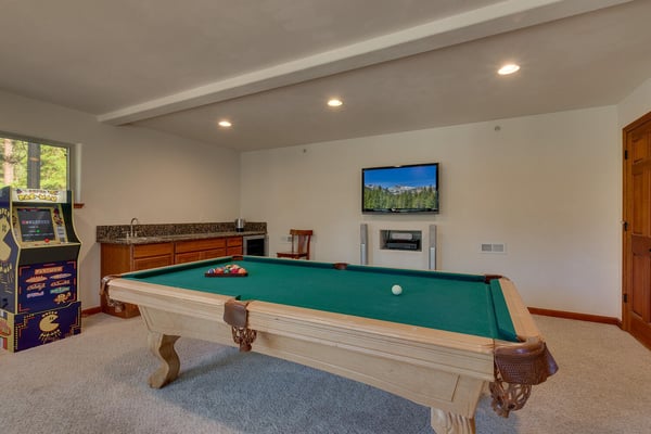 Upon entering into the great room and you’ll notice the owner has thought of every detail with high-end furnishings and oversize television hung above a stacked stone fireplace while large cathedral windows bring tons of natural light in. Chefs will enjoy preparing dinner in the spacious kitchen complete with stainless appliances. After dinner is served, head over to the foosball table to settle the score or better yet, downstairs to the lower living room complete with pool table, classic upright arcade and wet bar. If someone goes missing, there’s a good chance you will find them down here. When you’re ready to call it a night, head to one of the four bedrooms including the ever-so-spacious master bedroom complete with king bed and en suite. There are two bedrooms, each with queen beds plus a couple twin over twin bunks in bedroom number four.