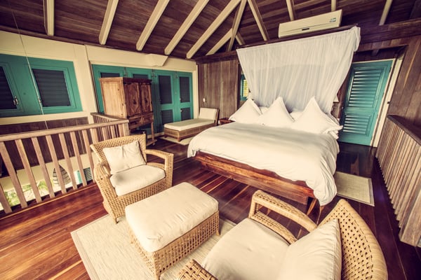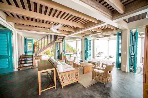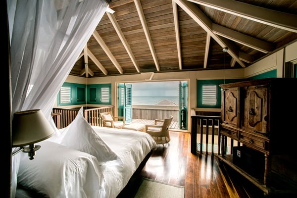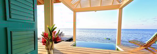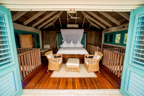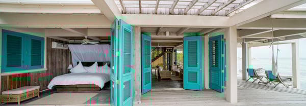 Indulge yourself in our exquisite two-story, two-bedroom ocean-front grand villa. Gaze at the sparkling Caribbean from the remarkable second-story view from your second story view; or at the end of one of two private docks. Your upstairs master bedroom has an open-air design, hardwood floors, two balconies with incredible sunrise and sunset views and a private bath. Downstairs guests will be busy appreciating a 360-degree view of the Caribbean, with doors on all sides opening directly to the Sea. This villa is clearly distinguishable by its grand size. Casa Estrella also features a personal plunge pool, alfresco showers, and king-size beds dressed in Egyptian cotton linens. The downstairs bedroom can be furnished with two twin beds upon request. 2600+ square feet.