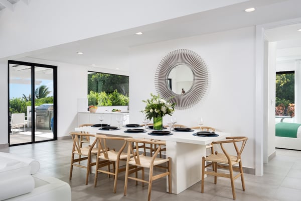 Sandy Estate is both Sandy Shore and Sandy Bottom, which can be rented together and serviced as an 8-bedroom beachfront estate. Located on the south shore of Providenciales, this charming, contemporary property overlooks the turquoise bay of Caicos. Designed by local architect Ron Shaw, this Frank Lloyd Wright-inspired villa is powered entirely by solar panels: welcome to the first villa in ‘Provo’ to adopt renewable energy! Villa Sandy Bottom, a four-bedroom suite, offers unparalleled ocean views. It includes a living room, a dining room and an open-plan kitchen. Everything is assembled with a chic interior design, going hand in hand with the luxury of the Caribbean. This beachfront villa offers you three floors to explore. At the pool level, three suites including a king bed, kitchen, living room and dining room overlook the pool where you can enjoy the pool bar and outdoor kitchen. Down at the beach, guests will find a beach lounge and a furnished oceanfront fireplace. The primary bedroom is on the second floor. The latter offers a breathtaking view of the Bay of Caicos, but also a panoramic view of the Flamingo Lake to the north (and yes, you can find beautiful flamingos!). On the third floor, the shared living room with unparalleled comfort will allow you to enjoy the views of Turtle Trail, Flamingo Lake to the north and Caicos Bay to the south. A paradise in ‘Provo’. Sandy Bottom Villa is a four-bedroom all-suite property with Phenomenal Ocean Views that boasts an open concept Living, Dining And Kitchen area that fabulously connects its interior Chic Design to Luxurious outdoor Caribbean Living. Sandy Shore is a 4-bedroom all-suite beachfront villa located on the Southside of Providenciales in the Turtle Tail region. The villa boasts an open-concept kitchen and living room area, perfect for entertaining while also allowing guests to truly appreciate the best of the Turks and Caicos, with incredible ocean views of the island’s Caicos Banks. The villa has one master suite with a king bed and ocean views, while bedrooms 2, 3, and 4 enjoy tropical garden views and private walk-out decks. Sandy Shore’ exterior pool deck offers guests ample lounge space and furnishings, and a shallow lounge pool, perfect for guests of all ages. From the pool deck, follow the villa’s own local stone rock pathway directly to the beach lounge. While no beaches in the Turks and Caicos are private, Sandy Shore is about as private as it gets, with only a few other homes sharing the same beach and next to no foot traffic. The ocean entry is sandy and shallow. The bay where the villa is located protects the villa and waterfront year-round from big waves and heavy winds. Within the bay, depths do not exceed 5′, so the Cays (islands) seen from the beach can be walked out to with ease. Guests of Sandy Shore enjoy an on-call management team ready to assist with any concierge requests, such as booking excursions or your own private massage or yoga session at the villa. Amenities include beach kayaks, high-speed wifi throughout, a large 5-burner gas grill, laundry facilities, and a fully air-conditioned interior. The villa also comes with a daily housekeeping service and an on-call management team.