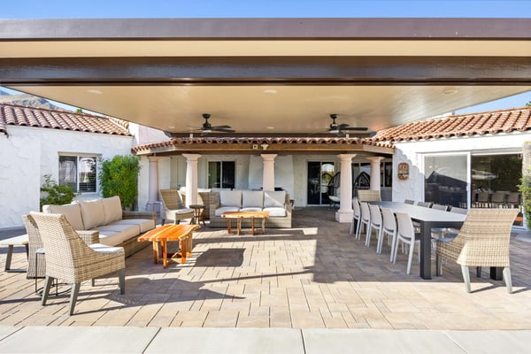 Let worries slip away at Ciao Bella Estates, a six-bedroom, seven-bathroom Palm Springs luxury home that sleeps 12. Experience top-tier golf courses, unique boutiques, delicious eats, and desert fun under the soaring San Jacinto mountains. Guests will love that this pet-friendly home entertains the whole group with a billiard room, pool, and tennis court! Spanish architecture, modern design, and colourful motifs mix throughout this historic two-story home. In the luxurious living room, a piano, a gas fireplace, and a spacious sectional create an intimate space for the entire party to gather. A slider door connects to the secluded patio. Spend the day worshipping the sun beside the pool and sitting spa or lounging in the shade with a book and a cold drink on the outdoor couch. The built-in grill calls for a lunchtime barbecue and eating alfresco at the 12-person outdoor table! After relaxing, prepare for a friendly game on the tennis court or the pool table in the billiards room. With two kitchens—one equipped with two refrigerators and a Thermador six-burner flat cooktop—guests have plenty of space to cook a sumptuous feast. The dining table seats 12 and there is additional seating in the breakfast nook. As the day winds down, relax in the family room on the plush sectional while watching the 85” Smart TV while enjoying the wood-burning fireplace. A washer and dryer in the laundry room are convenient for longer stays. Of the five guest bedrooms on this floor, 3 have queen beds, 1 has a king bed, and 1 has 2 twin beds. There is a primary bedroom at the front of the house with a king bed, a private bathroom, bar, and access to the pool. Up on the top floor, discover one bedroom with a king bed, a private bathroom, and mountain views. Plus a Bridal Room with a day bed. Both have balconies overlooking the entire estate. Multiple living spaces and a private patio and pool make Ciao Bella Estates ideal for large groups looking to make memories in Palm Springs. Located in the historic movie colony, this home is within walking distance to downtown. There’s parking for up to 6 cars in the driveway, so guests can easily explore the nearby areas. Book this California oasis today! City of Palm Springs No. 5553