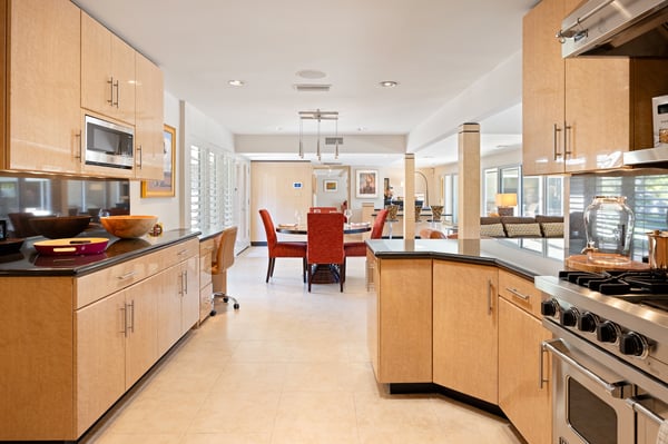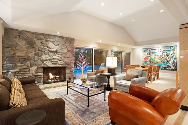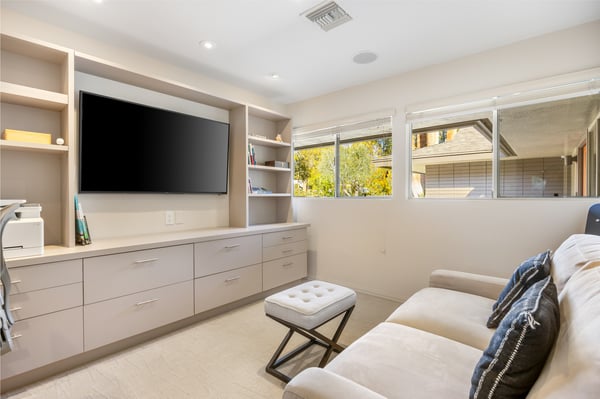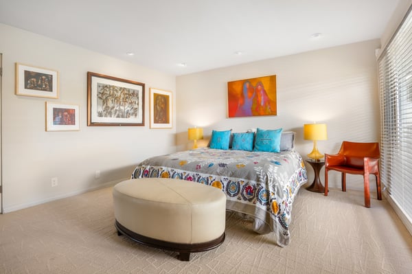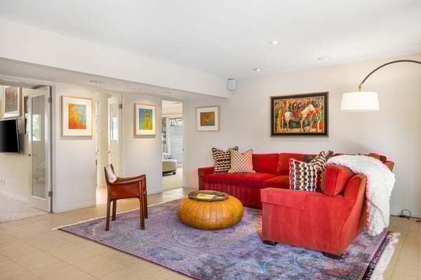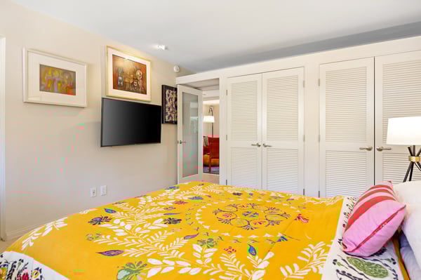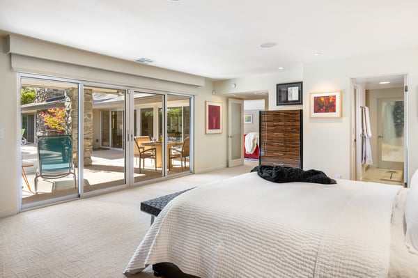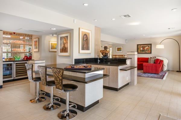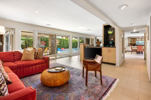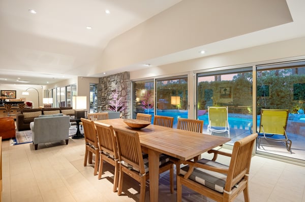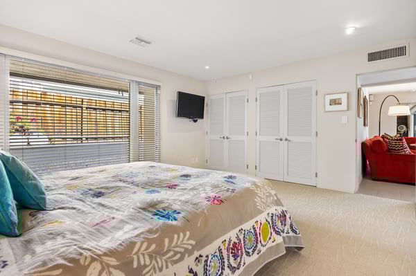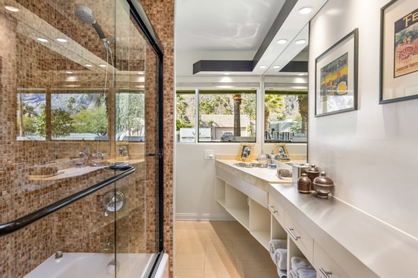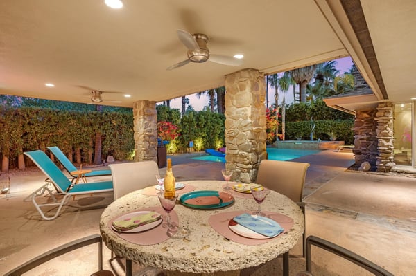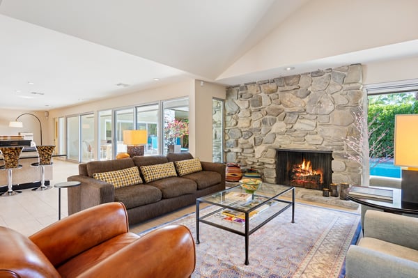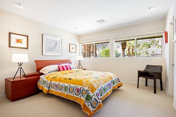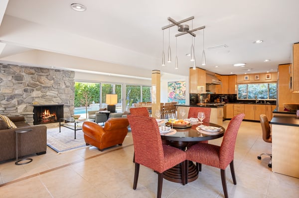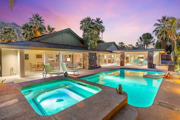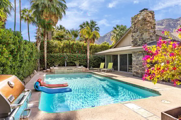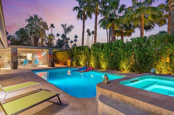 Experience the ultimate getaway at 17 Palms! This artful oasis boasts a mid-century modern design and offers luxurious accommodations with 3 bedrooms and 3 bathrooms that sleep 6. The highlight of this impeccable property is the outdoor space, featuring a private pool, sitting spa, and a covered patio. Whether looking to relax or entertain, 17 Palms is the perfect destination for any California dream vacation. Step into this art-filled mid-century modern home in sunny Palm Springs. This stylish abode boasts unique artwork and tasteful pops of colour throughout the great room, which effortlessly blends the living, dining, and kitchen areas for easy communication between spaces. A cozy living area features plush furnishings facing a stunning stacked stone fireplace and a 65" TV for ultimate relaxation. The spacious kitchen is a chef's dream, with high-end appliances and ample counter space for meal prep. A casual dining area adjacent to the kitchen comfortably seats 4, while the formal dining area accommodates 8. With 2 sliding glass doors leading out to the covered patio, enjoy the beautiful mix of indoor and outdoor spaces. The wet bar features all the essentials for entertaining friends and family, including a beverage cooler, sink, and 3-stool bar top. An additional sitting area adorned with a luxurious red sectional couch provides the perfect spot for socializing. Beyond this is an elegant primary bedroom with a king bed, an impressive private bathroom, and patio access. There are also 2 equally inviting guest bedrooms, one with a king bed and the other with a queen. A versatile den with a dedicated workspace and small sitting area features a 60" TV and a full-sized sleeper sofa for extra accommodations. With beautiful California weather, guests will love hosting on the spacious covered patio boasting an alfresco dining table and convenient gas grill. Take a dip in the refreshing pool, sunbathe on the 2 exposed loungers, or unwind in the attached sitting spa with a cocktail. Tall hedges and glorious palm trees ensure privacy while also providing beauty and shade. Exquisite details await at every turn in 17 Palm, a remarkable Palm Springs home. With on-site parking for 2 vehicles in the garage and 1 in the driveway, it's easy to explore local shops, restaurants, and bars—Joshua Tree National Park is less than 1 hour away! City of Palm Springs No. 5596