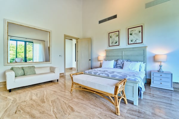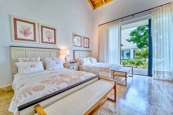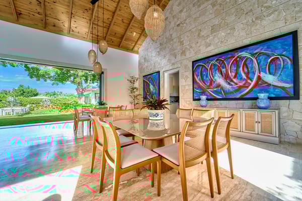 All guests must register with the Casa de Campo Concierge office, and for a small daily fee ($30 per adult per night & $15 per child per night), are granted access to resort areas and amenities. Casa de Campo Resort facilities and amenities include golf courses ($), the fitness centre ($), racquet center ($), restaurants ($) and bars ($). Contact Rental Escapes for more information about pricing. Casa Ceiba is a newly built luxury villa, thoughtfully designed to offer elegance, comfort, and modern amenities within 1,050 square meters of space. At its heart stands a magnificent centenary Ceiba tree, creating a tranquil centerpiece complemented by vaulted wooden ceilings and sophisticated furnishings. The spacious main living room invites relaxation in a refined setting, while the formal dining area, featuring two large tables for up to 16 guests, is ideal for hosting gatherings. An air-conditioned studio with a 75″ TV provides a private space for entertainment or unwinding. The villa’s outdoor spaces are crafted for both relaxation and entertaining. A lush garden surrounds the inviting swimming pool, offering a serene retreat. The expansive gazebo, fully equipped with a kitchen, TV, and full bathroom, doubles as an outdoor living and dining area, ensuring a seamless blend of comfort and style for any occasion.