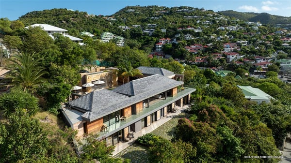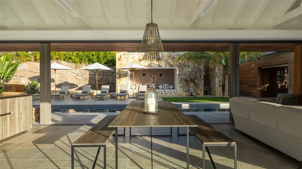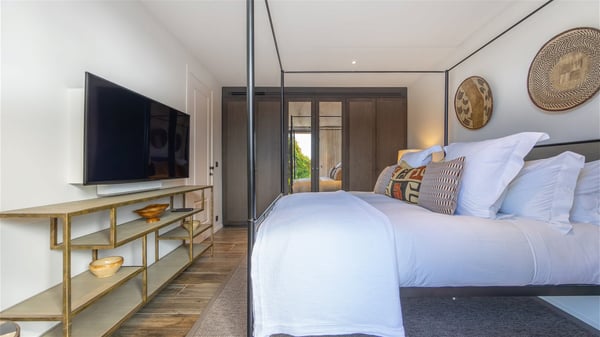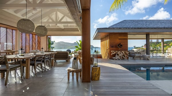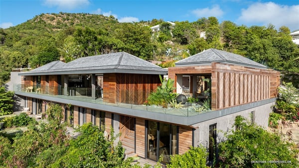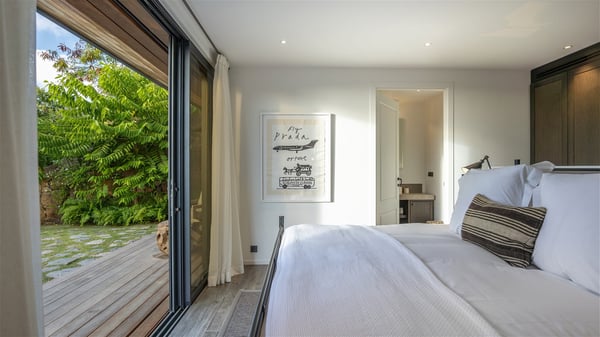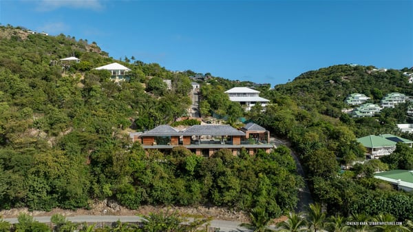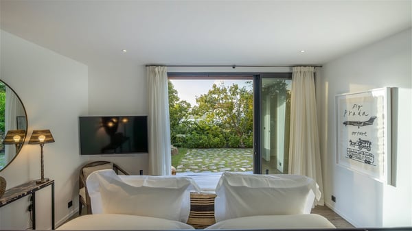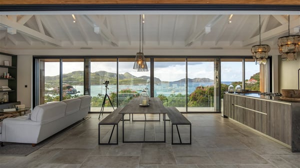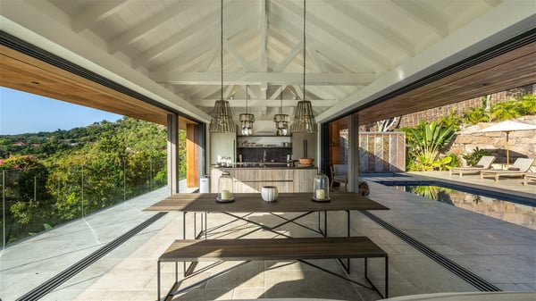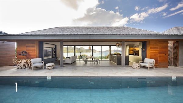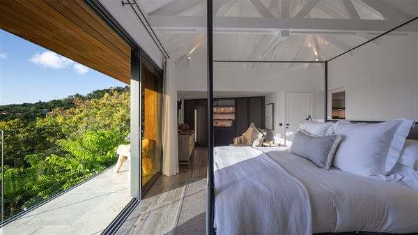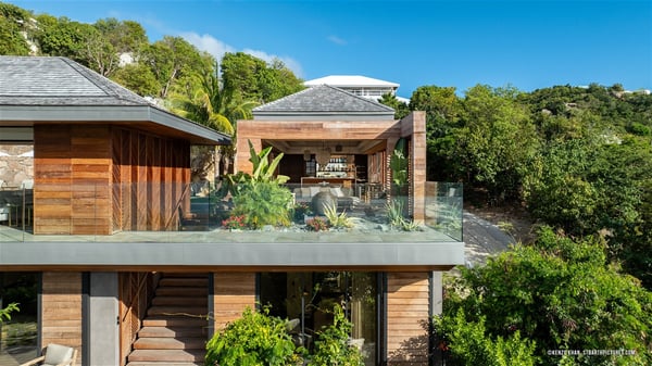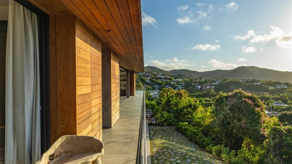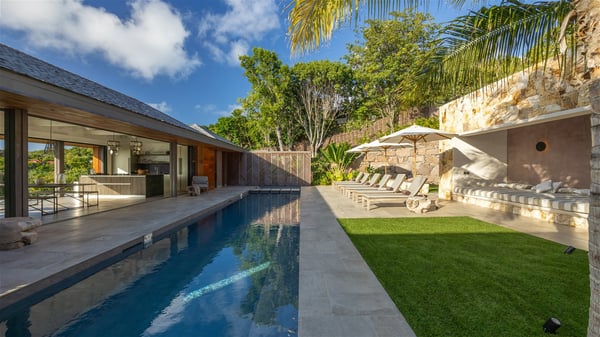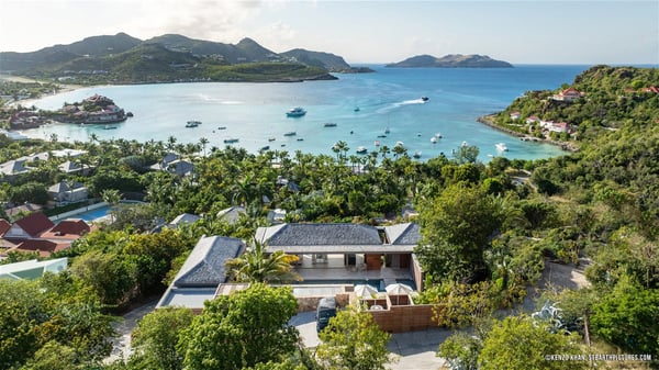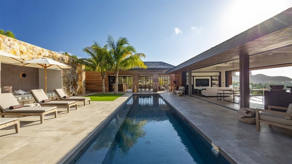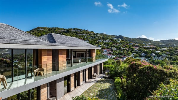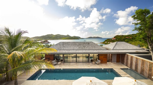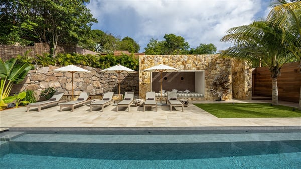 Villa Maud is a sumptuous property located in St-Jean facing the sparkling bay. Featuring five bedrooms, a swimming pool, and a fitness room, this villa in St-Barths welcomes you into spacious, bright spaces and offers upscale amenities. Ideally located in St-Barths, the villa rental Maud is the dream location for an unforgettable stay for up to ten people in the beautiful Caribbean. Designed over two levels connected by a staircase, villa Maud overlooks St-Jean Bay and the iconic Eden Rock. Its exceptional view creates a paradisiacal and luxurious atmosphere you’ll love enjoying. Luxurious and spacious, this rental in St-Barths invites you into its large, open living area overlooking the bay, with a lounge facing a large HD screen, a dining area, and a well-equipped American kitchen. Perpendicular to this main building, a spacious second lounge with sofas and a bar is set facing the bay, with beautiful carved wooden cladding on the side wall allowing soft, filtered light to shine through, creating a cocoon-like ambiance. Accessible from the main living area, you'll discover the magnificent terrace with a heated swimming pool, sun loungers, umbrellas, and palm trees for delightful relaxing sessions in a very private atmosphere. On the back wall made of blonde stone, there is a charming alcove with benches covered with cushions. A peaceful and romantic area with its charming lawn and barbecue, this sunny terrace is accessible through large glass doors leading from the two lounges. Parking spaces are available at the rear. Villa Maud consists of five air-conditioned bedrooms with HD screens and ensuite bathrooms. In utmost comfort, they are spread over the two levels, with one bedroom with a king-size bed, a seating area, a lovely terrace, and a great view on the main level, while the other four ones on the lower level with terraces in a cozy decor. One of them features twin beds, which are perfect for a family stay. A well-equipped fitness room is also located on this lower level. Amidst the natural beauty of the Caribbean, the villa rental Maud in St-Jean is the ideal place to stay for luxurious family or friends vacations.