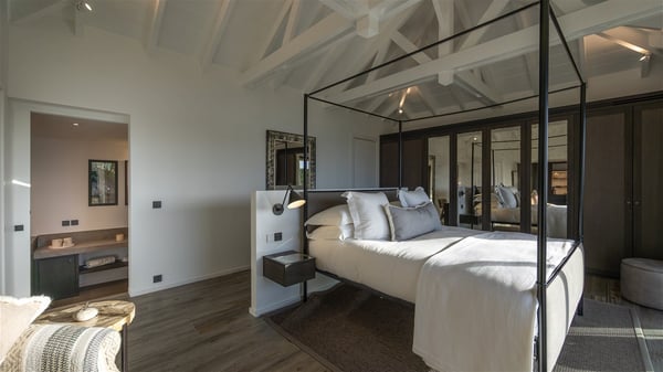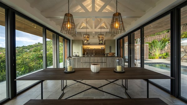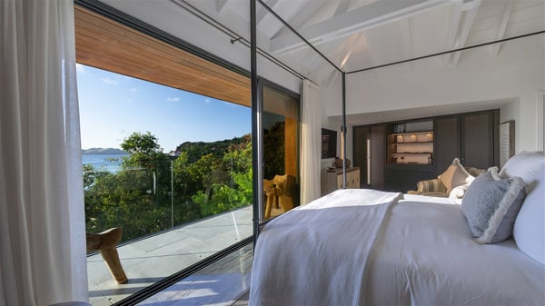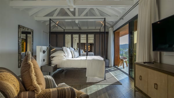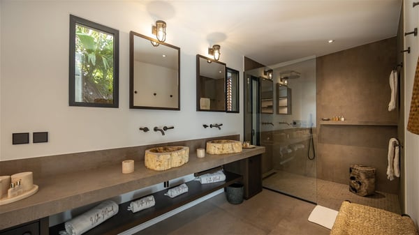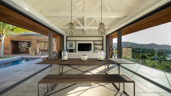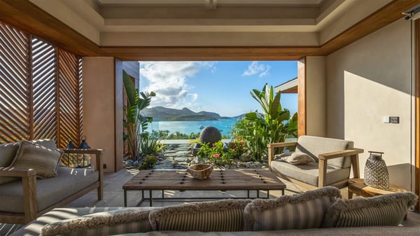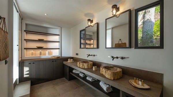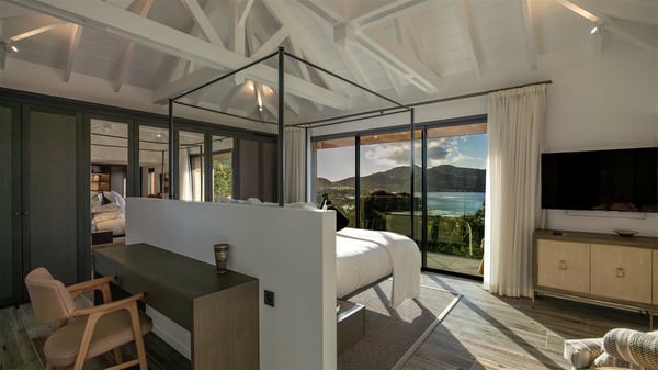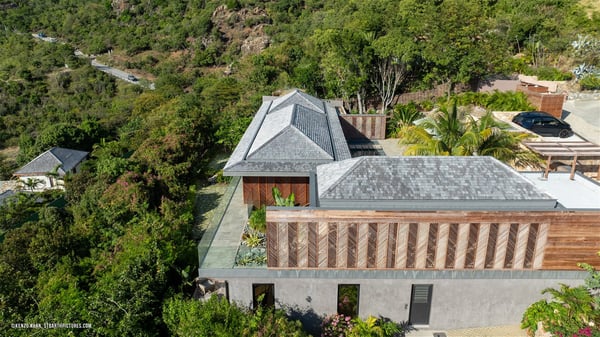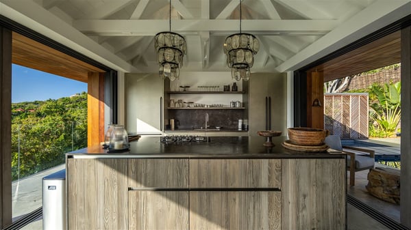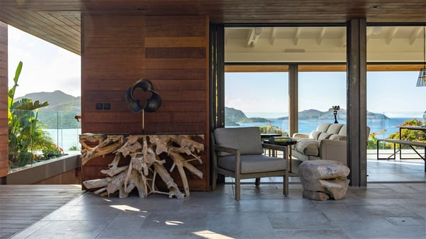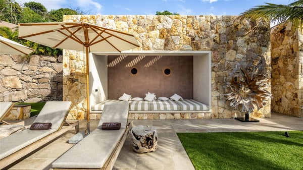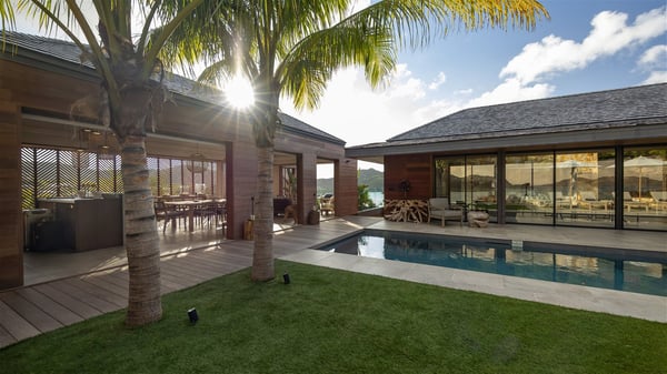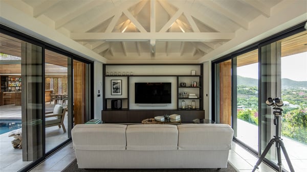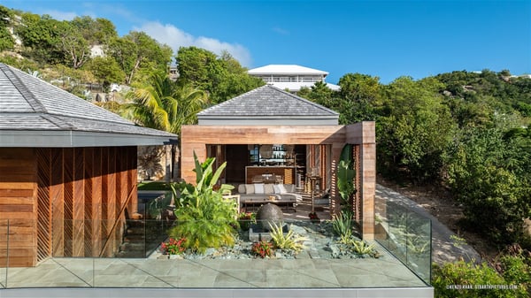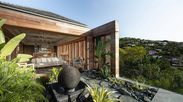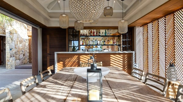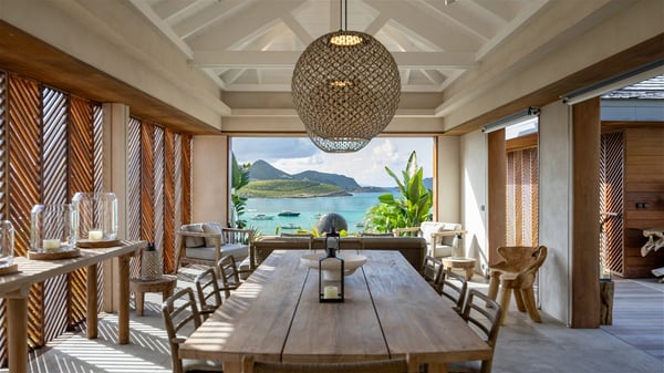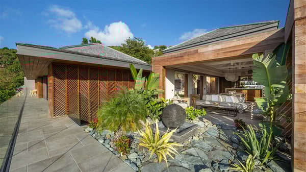 Villa Maud is a sumptuous property located in St-Jean facing the sparkling bay. Featuring five bedrooms, a swimming pool, and a fitness room, this villa in St-Barths welcomes you into spacious, bright spaces and offers upscale amenities. Ideally located in St-Barths, the villa rental Maud is the dream location for an unforgettable stay for up to ten people in the beautiful Caribbean. Designed over two levels connected by a staircase, villa Maud overlooks St-Jean Bay and the iconic Eden Rock. Its exceptional view creates a paradisiacal and luxurious atmosphere you’ll love enjoying. Luxurious and spacious, this rental in St-Barths invites you into its large, open living area overlooking the bay, with a lounge facing a large HD screen, a dining area, and a well-equipped American kitchen. Perpendicular to this main building, a spacious second lounge with sofas and a bar is set facing the bay, with beautiful carved wooden cladding on the side wall allowing soft, filtered light to shine through, creating a cocoon-like ambiance. Accessible from the main living area, you'll discover the magnificent terrace with a heated swimming pool, sun loungers, umbrellas, and palm trees for delightful relaxing sessions in a very private atmosphere. On the back wall made of blonde stone, there is a charming alcove with benches covered with cushions. A peaceful and romantic area with its charming lawn and barbecue, this sunny terrace is accessible through large glass doors leading from the two lounges. Parking spaces are available at the rear. Villa Maud consists of five air-conditioned bedrooms with HD screens and ensuite bathrooms. In utmost comfort, they are spread over the two levels, with one bedroom with a king-size bed, a seating area, a lovely terrace, and a great view on the main level, while the other four ones on the lower level with terraces in a cozy decor. One of them features twin beds, which are perfect for a family stay. A well-equipped fitness room is also located on this lower level. Amidst the natural beauty of the Caribbean, the villa rental Maud in St-Jean is the ideal place to stay for luxurious family or friends vacations.
