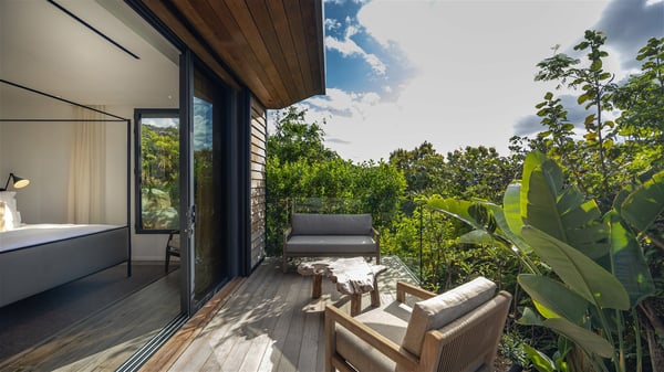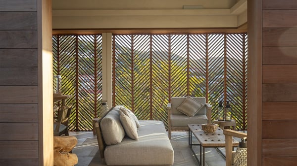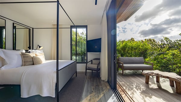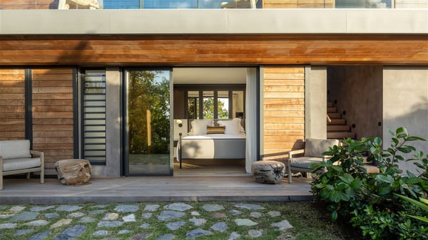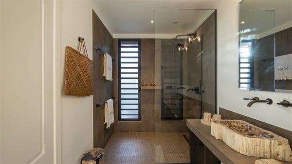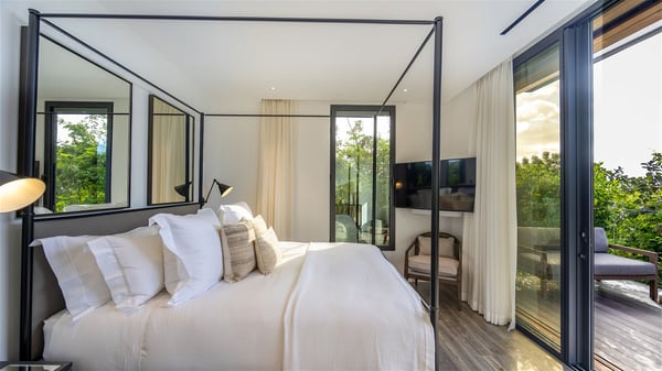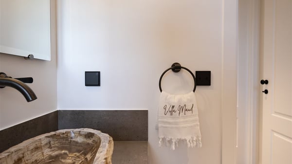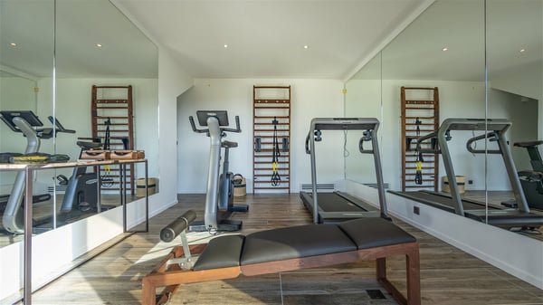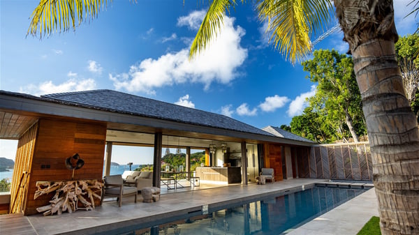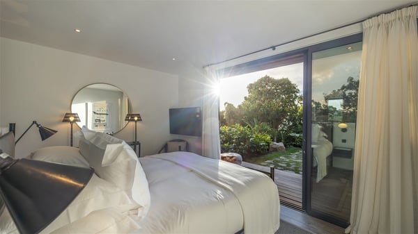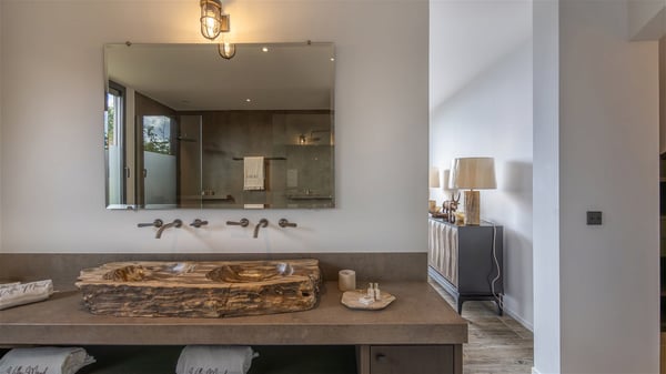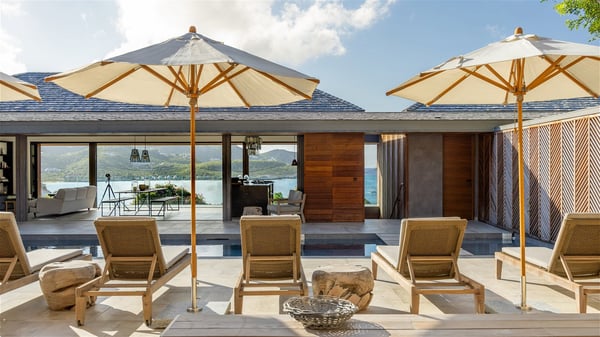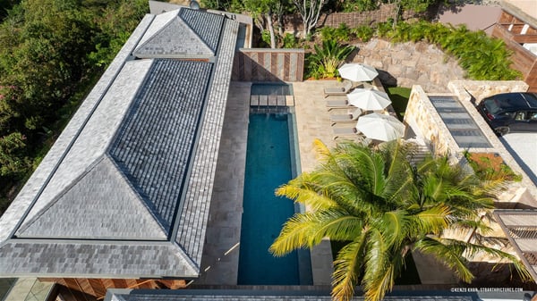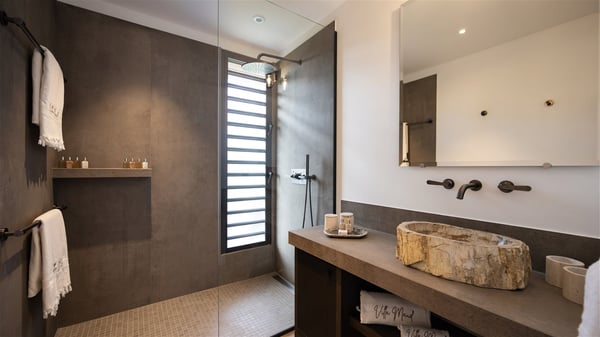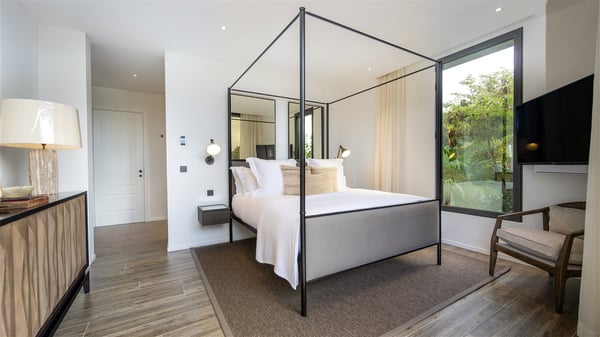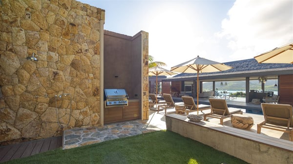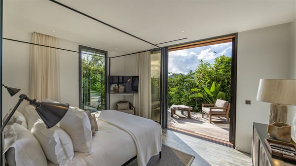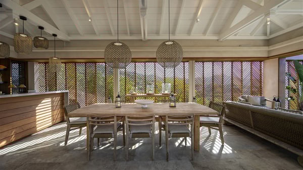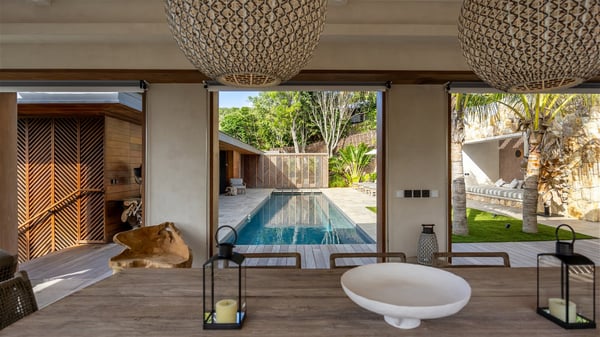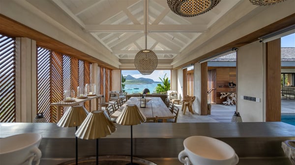 Villa Maud is a sumptuous property located in St-Jean facing the sparkling bay. Featuring five bedrooms, a swimming pool, and a fitness room, this villa in St-Barths welcomes you into spacious, bright spaces and offers upscale amenities. Ideally located in St-Barths, the villa rental Maud is the dream location for an unforgettable stay for up to ten people in the beautiful Caribbean. Designed over two levels connected by a staircase, villa Maud overlooks St-Jean Bay and the iconic Eden Rock. Its exceptional view creates a paradisiacal and luxurious atmosphere you’ll love enjoying. Luxurious and spacious, this rental in St-Barths invites you into its large, open living area overlooking the bay, with a lounge facing a large HD screen, a dining area, and a well-equipped American kitchen. Perpendicular to this main building, a spacious second lounge with sofas and a bar is set facing the bay, with beautiful carved wooden cladding on the side wall allowing soft, filtered light to shine through, creating a cocoon-like ambiance. Accessible from the main living area, you'll discover the magnificent terrace with a heated swimming pool, sun loungers, umbrellas, and palm trees for delightful relaxing sessions in a very private atmosphere. On the back wall made of blonde stone, there is a charming alcove with benches covered with cushions. A peaceful and romantic area with its charming lawn and barbecue, this sunny terrace is accessible through large glass doors leading from the two lounges. Parking spaces are available at the rear. Villa Maud consists of five air-conditioned bedrooms with HD screens and ensuite bathrooms. In utmost comfort, they are spread over the two levels, with one bedroom with a king-size bed, a seating area, a lovely terrace, and a great view on the main level, while the other four ones on the lower level with terraces in a cozy decor. One of them features twin beds, which are perfect for a family stay. A well-equipped fitness room is also located on this lower level. Amidst the natural beauty of the Caribbean, the villa rental Maud in St-Jean is the ideal place to stay for luxurious family or friends vacations.