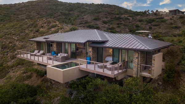 With uninterrupted views of the sparkling sea, Whale Point is situated on Oil Nut Bay’s dramatic Atlantic Ridge. This ocean view rental on Virgin Gorda’s south shore is an intimate escape, offering simple yet sumptuous ocean side living at its finest. Two luxurious master suites, each with their own ensuite bathrooms, flank an open concept great room, fully-loaded kitchen and indoor dining area. Sun lovers will revel in the expansive deck with ample room for lounging and dining, as well as the gorgeous plunge pool suspended above the Caribbean Sea. Enjoy watching whales off your deck or walk to the Beach Club.