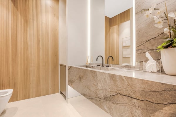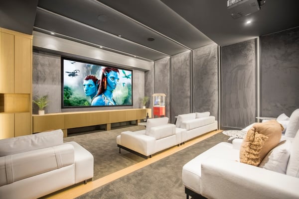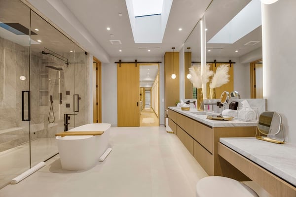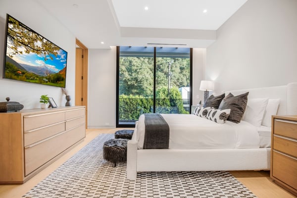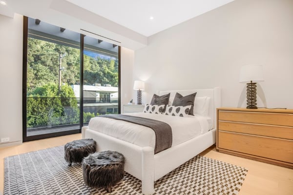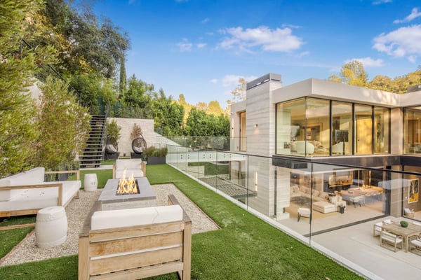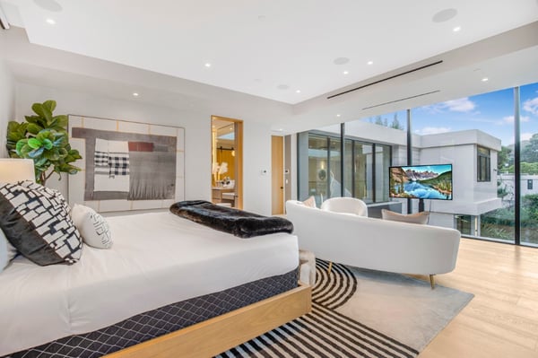 This 3-level one-of-a-kind estate is an extraordinary fusion of design and elegance. Spanning approximately, 8000 sf and situated on a sprawling 22,000 sf lot, this gated and private 5 BD + 7.5 BA modern marvel has been constructed with extreme attention to detail using only the finest materials available and providing almost every amenity and convenience imaginable. Grand entrance with floating staircase welcomes you to a spacious open floorplan, adorned with soaring ceilings, skylights, and floor-to-ceiling Fleetwood doors. Walls of glass upstairs and down bathe the warm interiors in natural light and seamlessly connect the indoor/outdoor spaces. Designer double kitchen is perfectly placed for hosting guests and comes equipped with built-in Miele appliances, center island, breakfast bar and hi-end European fixtures. All rooms open to jaw-dropping expansive outdoor oasis that includes a 2-level terraced backyard and fully landscaped and lighted hillside that is site to be seen. This haven for relaxation and entertainment is accentuated with lush foliage, beautiful fountains, sleek porcelain stone, Ipe wood decking, multiple firepits, outdoor kitchen/bar, and sparkling saltwater pool & spa. The primary suite is a true sanctuary with walls of glass, stunning views, stone fireplace, and private bridge to upper-level backyard. The sumptuous primary bath boasts an over-sized steam shower, soaking tub, and double vanity complete with Taj Mahal stone countertops and Gessi wall-mounted fixtures. Connected to the opulent bathroom is your dream walk-in closet complete with LED lighted cabinets and lighted onyx countertop. Lower level adds additional entertainment space by housing a 150-bottle wine cellar, fully equipped gym, recreation room, lighted onyx bar, and state-of-the-art movie theater. Additional features include sizable sun-filled guest bedrooms w/ gorgeous ensuite bathrooms, formal office, first-class elevator, generous 3-car garage, Lutron lighting system, and integrated smart home automation. Imported Italian stone, wood paneled ceilings, European oak/porcelain floors, and trimless LED lights further elevate the interiors and blend all rooms together to create an ambiance of luxury and sophistication throughout. HSR24-003489
