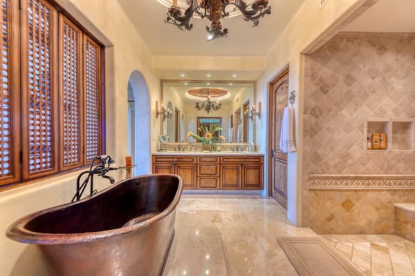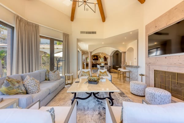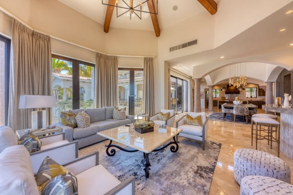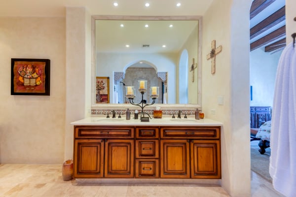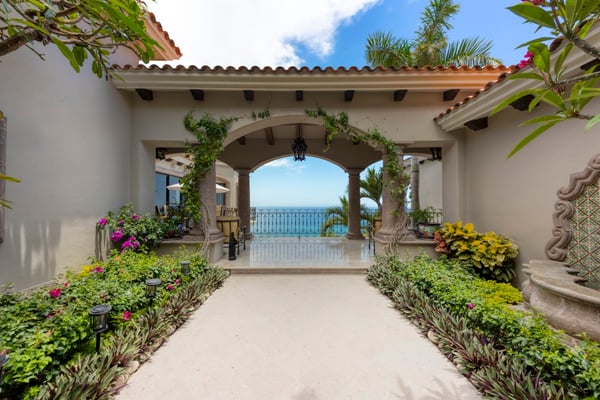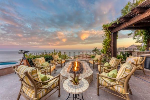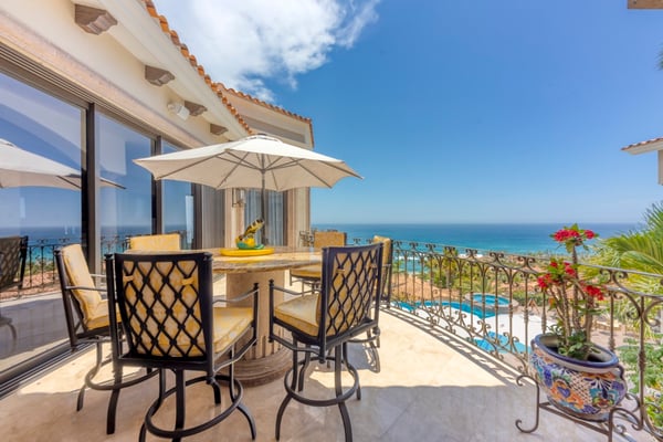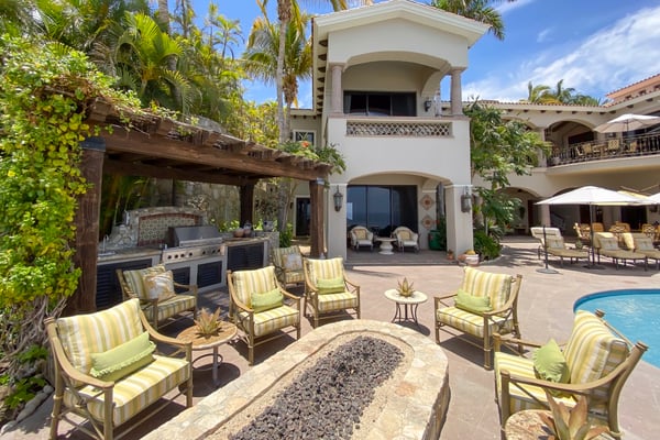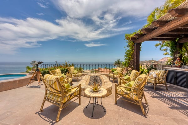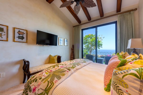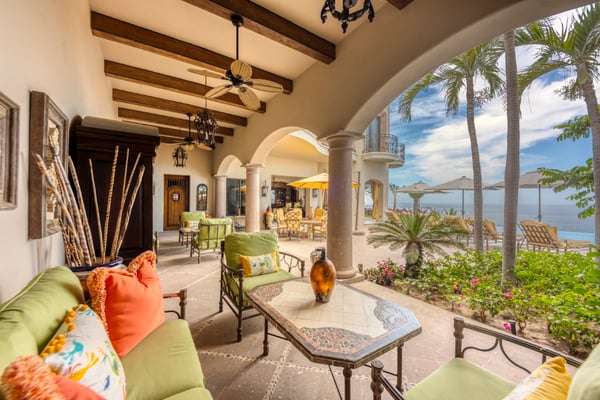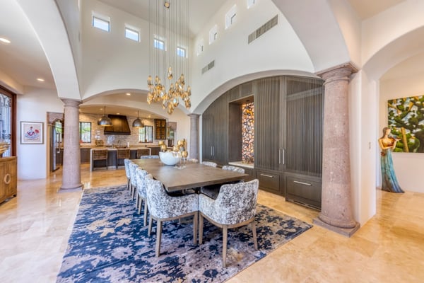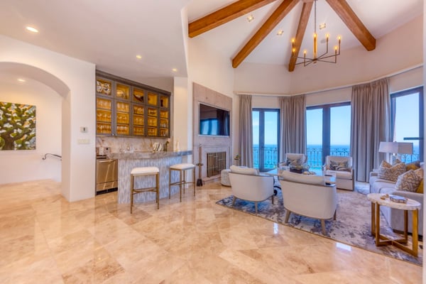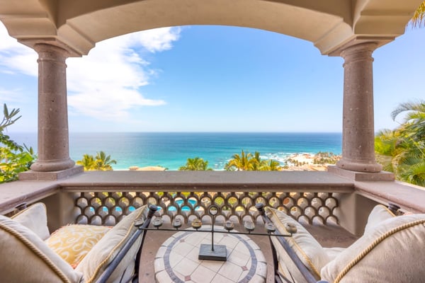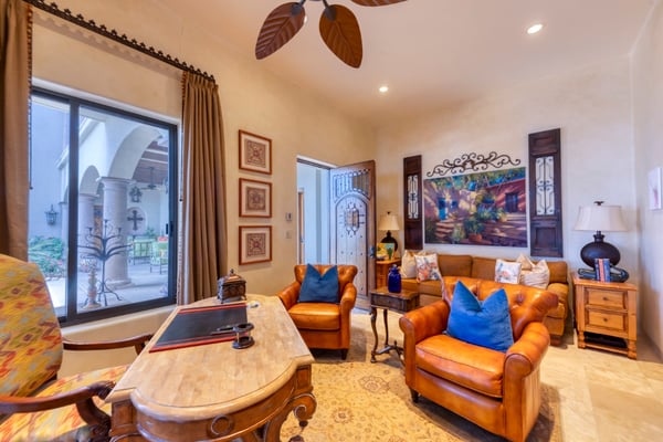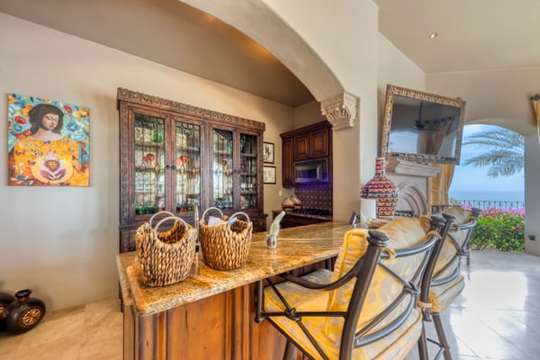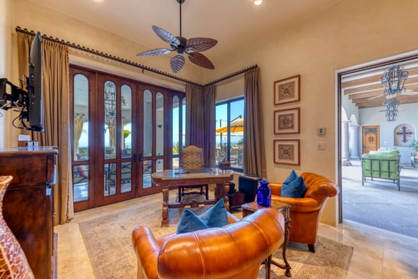 Villa Nobleza, a luxurious villa nestled in Villas Del Mar, Los Cabos, embodies the elegance of a Spanish palace with its exquisite leather appointments, wood trims, wrought iron chandeliers, and expansive bay windows offering breathtaking views. This two-story mansion boasts spacious living and dining areas, a gourmet kitchen, private loggias off most bedrooms, and bathrooms featuring stunning soaking tub designs. The interiors, adorned with high-beamed ceilings, hand-carved wood furnishings, and bright textiles, pave the way to an inviting outdoor space centered around an infinity pool and spa, a sizeable firepit, and a verandah furnished brightly for guest comfort. With five bedrooms and seven bathrooms, Villa Nobleza offers a luxurious stay in Los Cabos, with an additional convertible office space serving as a sixth bedroom. Guests can take advantage of an array of amenities, from the dedicated butler and personal chef ensuring a seamless stay, to the adjacent One & Only Palmilla’s facilities, and the 27-hole Jack Nicklaus-designed golf course nearby. This stunning Los Cabos villa rental redefines opulence and comfort, promising a memorable Mexican escapade.