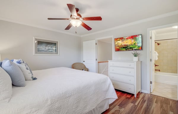 Seabreeze Sanctuary is a spacious three-bedroom, three-bath family vacation property highlighted with a spacious screen porch and large deck. With both ocean and pool views as a backdrop, your family will thoroughly enjoy meals or a board game on the furnished screened porch. From the upper deck, you can soak up the sun while watching the kids splash in the aqua blue water or choose one of the many loungers surrounding the pool. Then, when your family is ready to ride the waves, the surf is only steps away from Seabreeze Sanctuary and easily accessible down a boardwalk. The living area features a remodelled kitchen with new cabinets, countertops, and appliances. The updated flooring in the living area provides a clean look with a comfortable, plush leather sofa and many new furnishings. The dining area has seating for six at the circular table. One of the many special amenities offered at Seabreeze Sanctuary is the huge sliding door and window in the living area looking out towards the ocean. There are three bedrooms, each with a fully renovated bath and updated cabinets and tiling. The primary bedroom offers a king bed with direct access to the open deck with ocean views and features a large walk-in shower as well as a walk-in closet. The guest bedroom on the second floor features a king bed. The first-level bedroom is unique in that it is large enough to accommodate two queen beds. Finally, Seabreeze Sanctuary offers a covered carport plus a private outdoor shower and changing room. Beach Club Villa at Wild Dunes is a fantastic community and one of the best-maintained at Wild Dunes. It is the only oceanfront community along the Charleston coast that offers three-bedroom townhomes with direct ocean views. Finally, as a guest at Wild Dunes, your family will be able to enjoy precision golf at the Wild Dunes Harbor Golf Course, the world-famous Wild Dunes Links Golf Course, the Sand and Sea Spa, bicycle rentals and several restaurants located on site within the community. Best of all Seabreeze Sanctuary is only 14 miles from Historic Charleston.