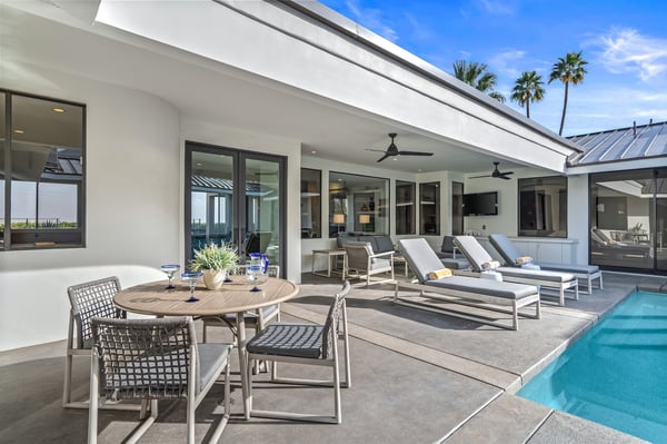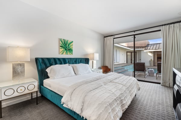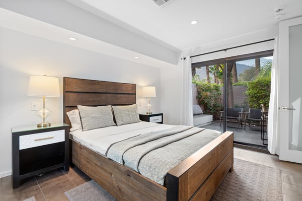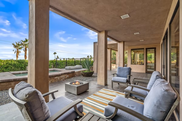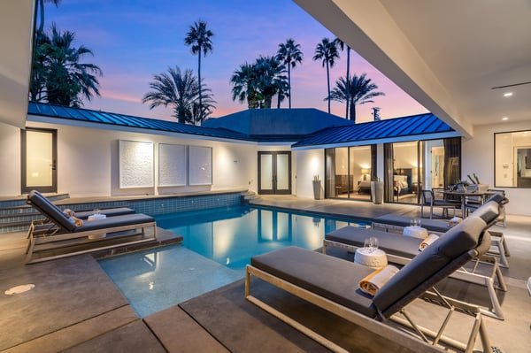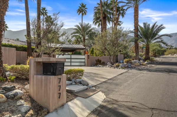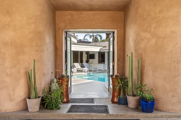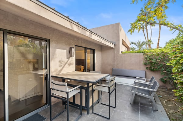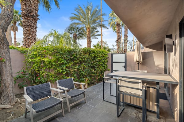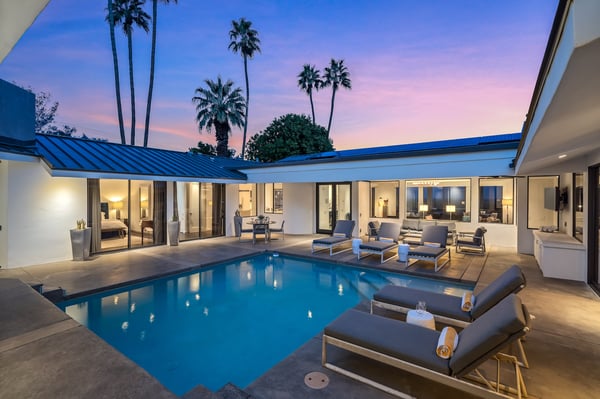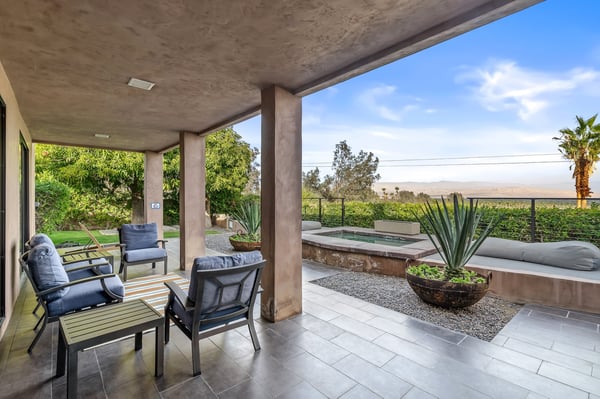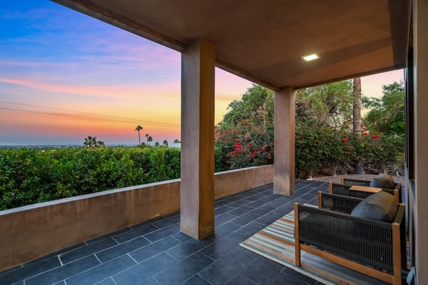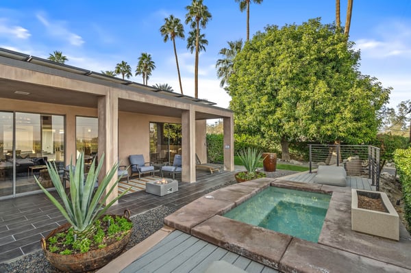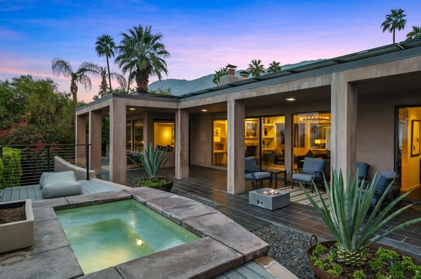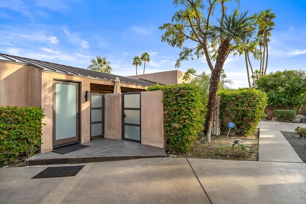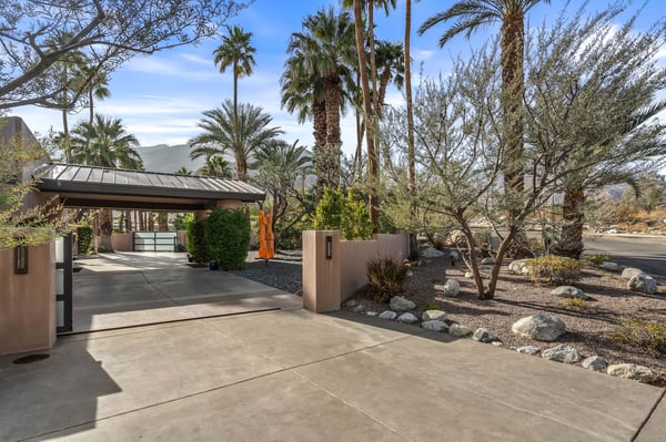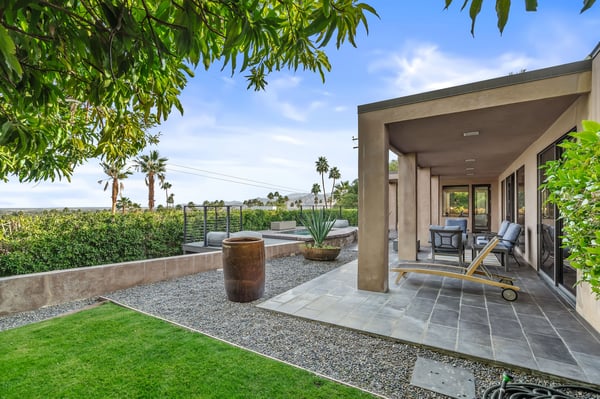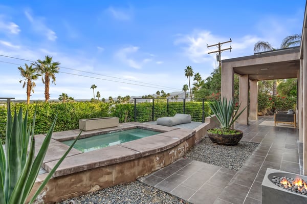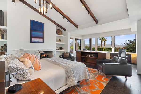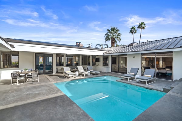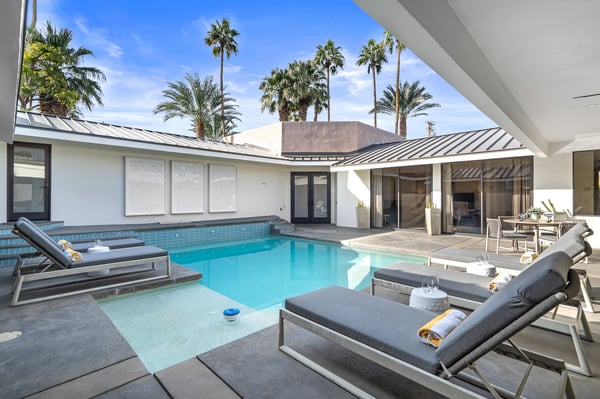 Perched above a shimmering valley, Palm Springs Confidential is an elegant retreat designed to blend relaxation with natural beauty. This modern 4-bedroom, 5-bathroom Main House and Casita accommodate 8, surrounded by majestic mountains and swaying palm trees. With a private backyard boasting a sparkling pool, outdoor kitchen, and ample space, this luxurious oasis promises an unforgettable desert getaway. Glass French doors open to a radiant courtyard, where a shimmering pool is framed by cozy loungers and a charming bistro table, welcoming guests to this stunning property. A covered porch offers respite from the sunshine with plush furnishings. Inside offers a harmonious blend of elegance and warmth, with tall A-frame ceilings and exposed wood beams in the great room. Settle into the inviting sectional and matching blue armchairs for heartwarming nights surrounded by loved ones or unwind on the chaise lounge next to the fireplace to watch TV. A nearby table invites lively card games for 4. A private outdoor patio off the living area boasts a firepit and lavish sitting spa with remarkable sunrise and sunset views. For barbecue enthusiasts, the outdoor kitchen's natural gas grill, beverage cooler, and spacious dining table make alfresco meals a must. Explore a true culinary haven in the indoor kitchen, stocked with high-end appliances, including a Viking SubZero refrigerator and F. Bertazzoni 6-burner gas stove and double oven. Enjoy a glass of wine at the wet bar before sitting down to dinner in the sunny dining alcove that seats 10. When it's time to unwind, there are 2 luxurious guest bedrooms with king beds, private bathrooms, and access to the pool, as well as 1 lovely primary bedroom boasting a king bed, fireplace, sitting area, and workspace. Its private bathroom features a dual-headed shower with a floor-to-ceiling window view of a tranquil yet private rock garden. A shared bathroom with a shower and sauna leads out to the pool, while the washer and dryer add convenience. The Casita provides a delightful hideaway with a cozy living area, well-equipped kitchenette, queen bed, private bathroom, and outdoor patio with stunning desert-mountain views. Palm Springs Confidential is the perfect Palm Springs Retreat! On-site parking for on the covered driveway makes it easy to explore the area, including a quick 7-minute drive to downtown Palm Springs for boutique shopping, exquisite dining, and lively nightlife. City of Palm Springs No. 041670