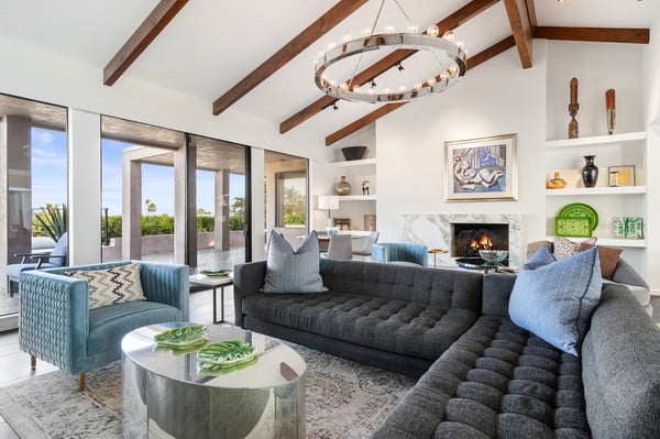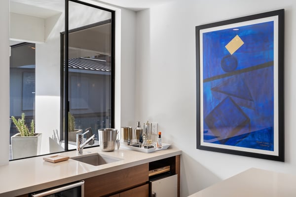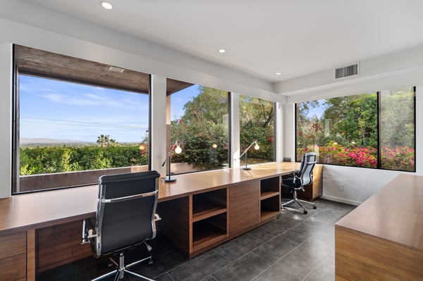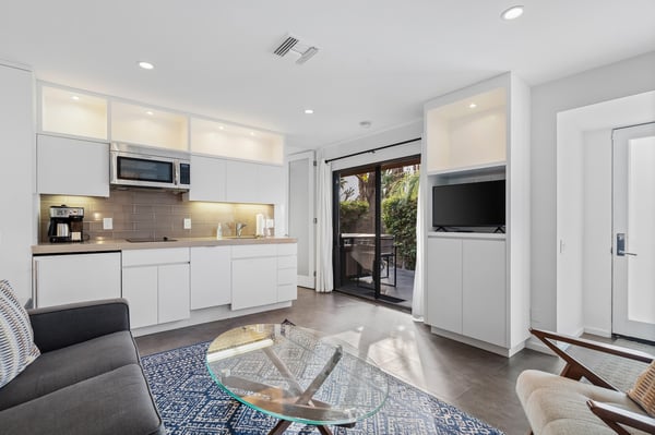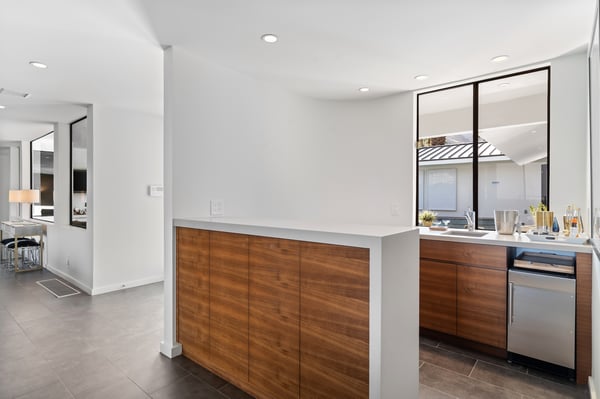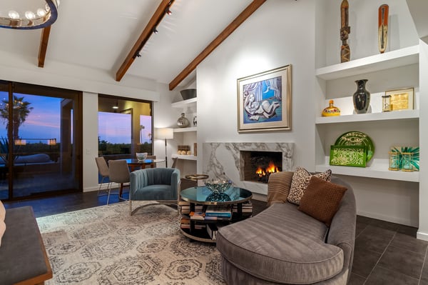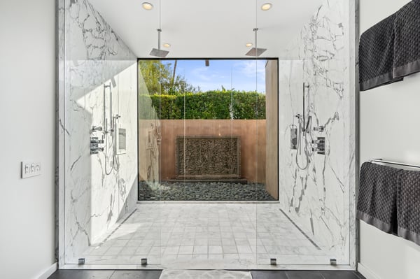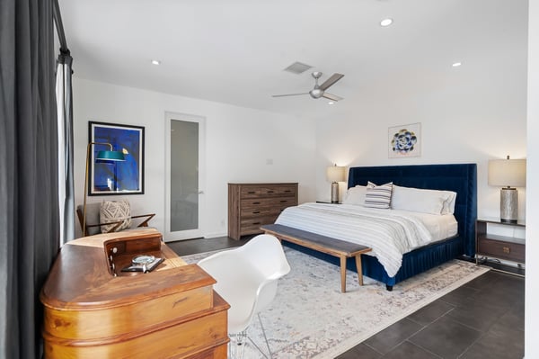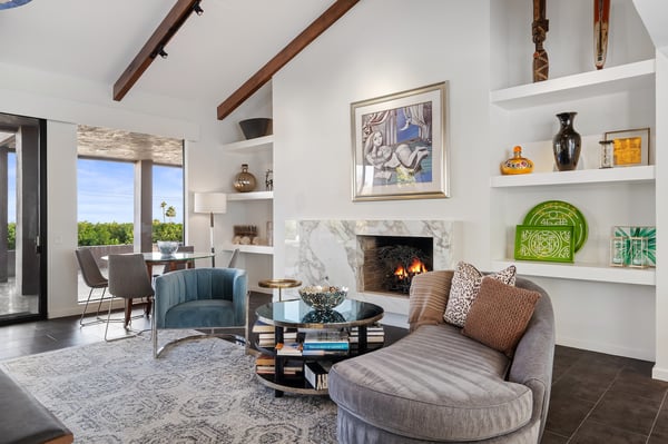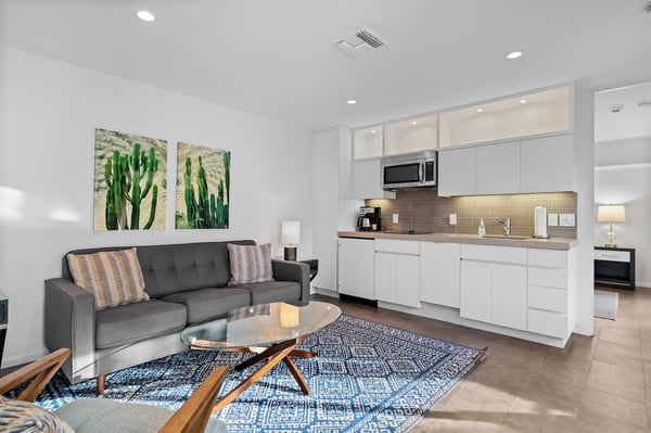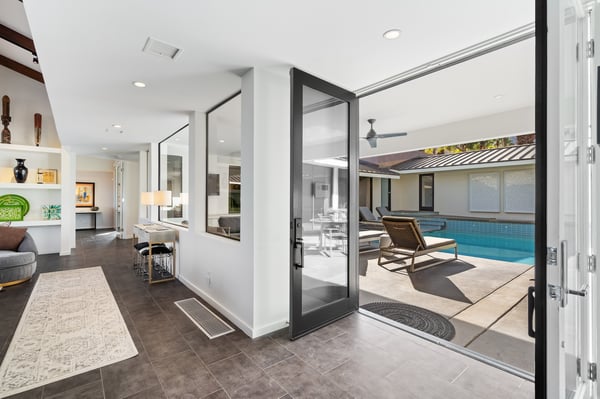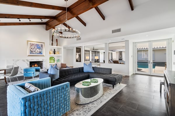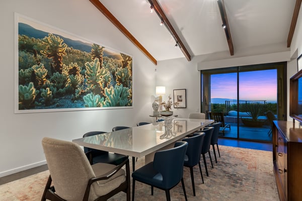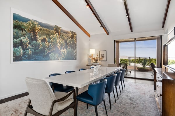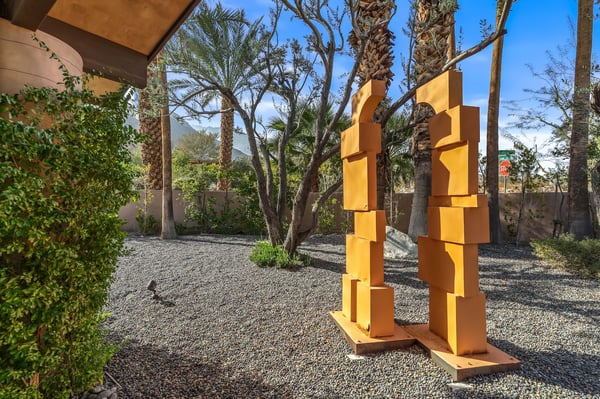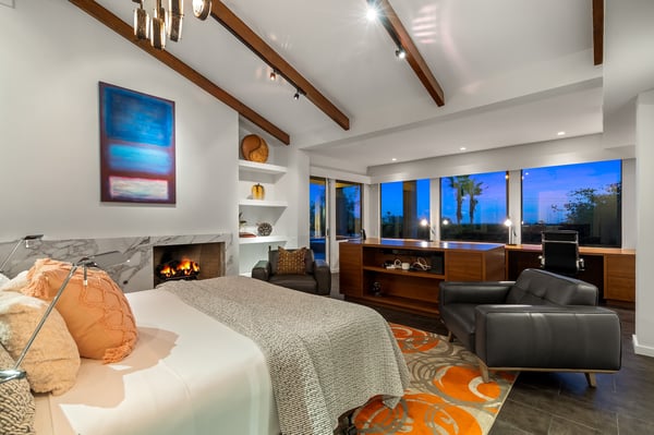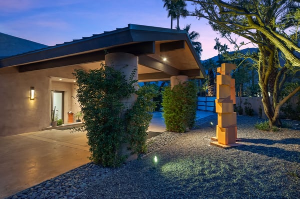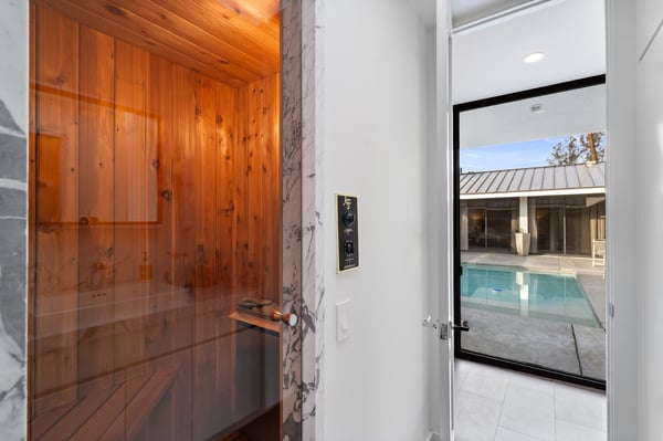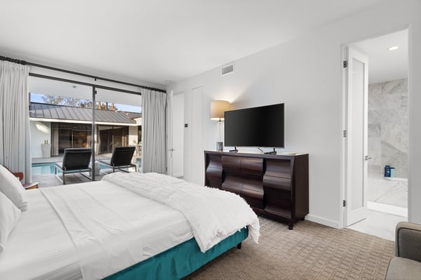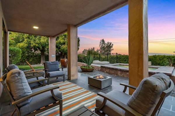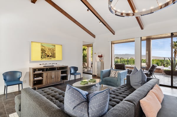Perched above a shimmering valley, Palm Springs Confidential is an elegant retreat designed to blend relaxation with natural beauty. This modern 4-bedroom, 5-bathroom Main House and Casita accommodate 8, surrounded by majestic mountains and swaying palm trees. With a private backyard boasting a sparkling pool, outdoor kitchen, and ample space, this luxurious oasis promises an unforgettable desert getaway. Glass French doors open to a radiant courtyard, where a shimmering pool is framed by cozy loungers and a charming bistro table, welcoming guests to this stunning property. A covered porch offers respite from the sunshine with plush furnishings. Inside offers a harmonious blend of elegance and warmth, with tall A-frame ceilings and exposed wood beams in the great room. Settle into the inviting sectional and matching blue armchairs for heartwarming nights surrounded by loved ones or unwind on the chaise lounge next to the fireplace to watch TV. A nearby table invites lively card games for 4. A private outdoor patio off the living area boasts a firepit and lavish sitting spa with remarkable sunrise and sunset views. For barbecue enthusiasts, the outdoor kitchen's natural gas grill, beverage cooler, and spacious dining table make alfresco meals a must. Explore a true culinary haven in the indoor kitchen, stocked with high-end appliances, including a Viking SubZero refrigerator and F. Bertazzoni 6-burner gas stove and double oven. Enjoy a glass of wine at the wet bar before sitting down to dinner in the sunny dining alcove that seats 10. When it's time to unwind, there are 2 luxurious guest bedrooms with king beds, private bathrooms, and access to the pool, as well as 1 lovely primary bedroom boasting a king bed, fireplace, sitting area, and workspace. Its private bathroom features a dual-headed shower with a floor-to-ceiling window view of a tranquil yet private rock garden. A shared bathroom with a shower and sauna leads out to the pool, while the washer and dryer add convenience. The Casita provides a delightful hideaway with a cozy living area, well-equipped kitchenette, queen bed, private bathroom, and outdoor patio with stunning desert-mountain views. Palm Springs Confidential is the perfect Palm Springs Retreat! On-site parking for on the covered driveway makes it easy to explore the area, including a quick 7-minute drive to downtown Palm Springs for boutique shopping, exquisite dining, and lively nightlife. City of Palm Springs No. 041670