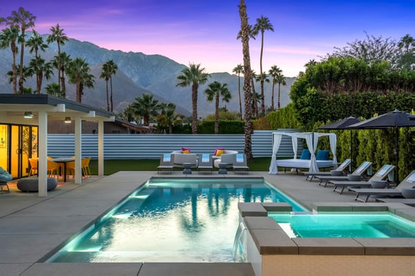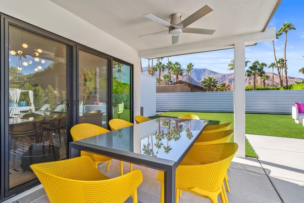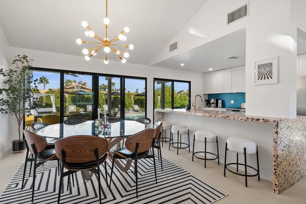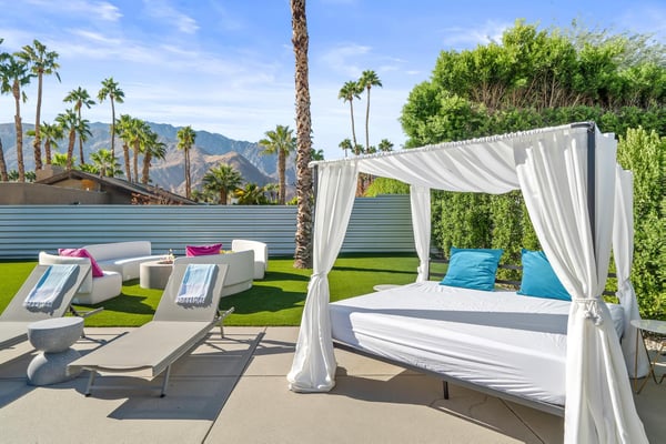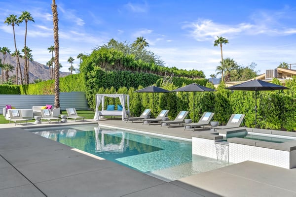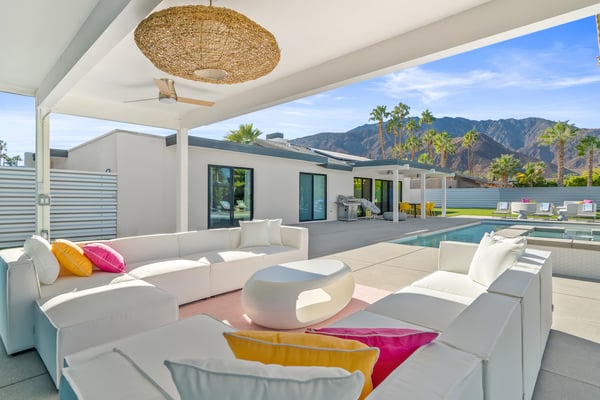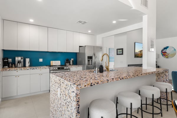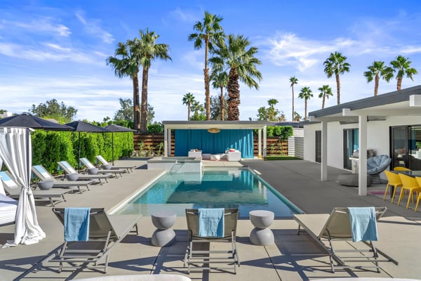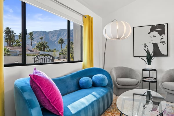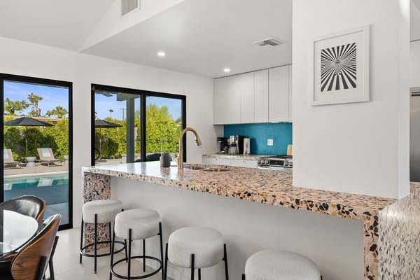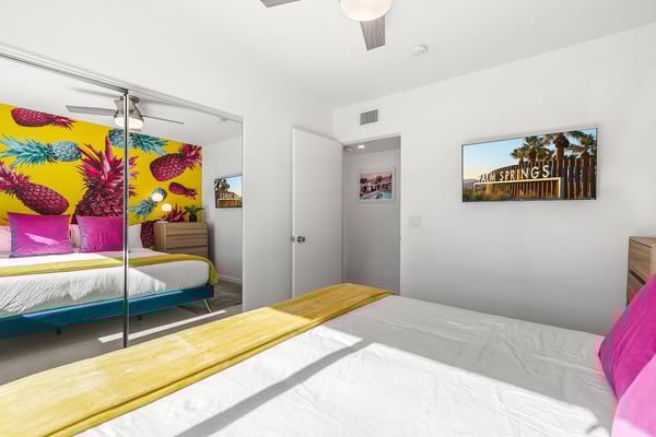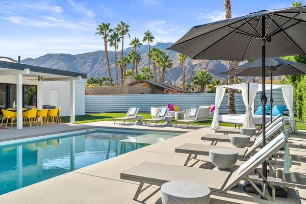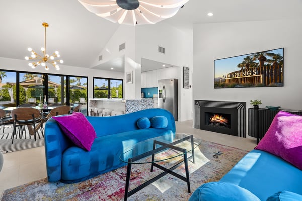 Fabulous fun awaits at The Tipsy Kitten Guest House, a spectacular Palm Springs retreat boasting 3 bedrooms and 2 bathrooms that accommodate 8 guests. Nestled near downtown Palm Springs, enjoy days prowling boutiques, teeing off on golf courses, or experiencing the exciting nightlife of this famous desert town. Although with such an enchanting backyard—including a pool, hot tub, outdoor living room, and fire pit—guests may prefer to spend every second relaxing on the property! Bright and bold, the interior of this single-story home splashes of colourful hues paired against black and white accents for a whimsical, contemporary design. In the living space, recline on the velvet couches to watch TV or share a bottle of wine with friends while the gas fireplace warms up chilly evenings. The open kitchen, featuring eye-catching terrazzo countertops, has everything guests need to craft multi-course meals or morning mimosas. Up to 8 can dine around the dining table, with 4 additional seats at the breakfast bar. Out the sliding glass doors, discover paradise in the form of a sunlit pool and hot tub, surrounded by views of palm trees and majestic mountaintops. Stretch out for a midday catnap on the umbrella-shaded loungers or the king-sized, canopied daybed. Under the pavilion, relax on 2 comfortable couches as the overhead fans offer a lazy breeze. A firepit with comfy seating, a propane grill, and an 8-person table make this idyllic backyard the perfect place to gather day or night! When it’s time to turn in for the evening, guests can retire to the primary bedroom with a king bed, private bathroom, and a slider to the backyard. There are 2 additional guest bedrooms—with 2 queen beds in the first bedroom and 1 king bed in the second. Every bedroom features a TV and beautiful décor, and a washer and dryer offer convenience for extended stays. Experience a Palm Springs getaway filled with laid-back luxury and intoxicating fun at The Tipsy Kitten Guest House. On-site parking and a Tesla EV charger make exploring the area easy or taking a day trip to Joshua Tree National Park. Book this delightful home today! Dogs are allowed with a maximum of 2 dogs under 35 lbs each. There is a pet fee of $150, plus tax. City of Palm Springs No. 064102