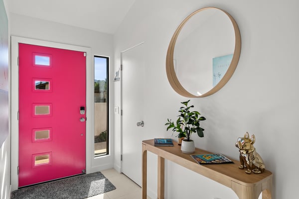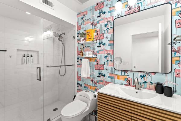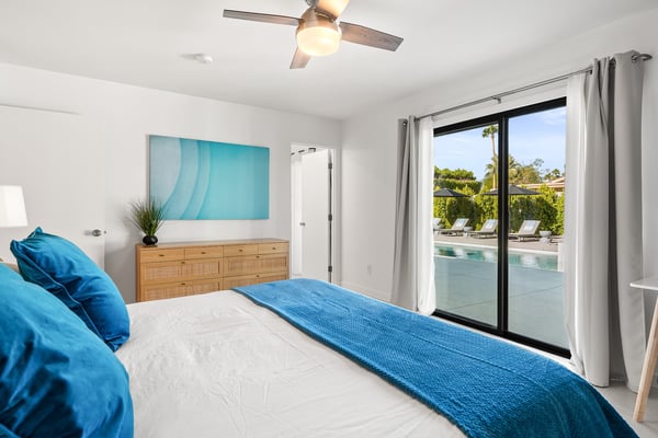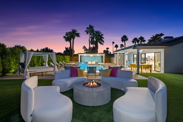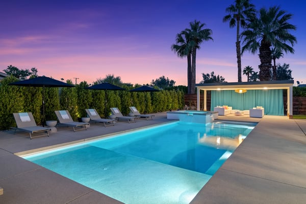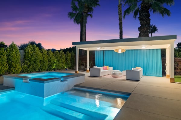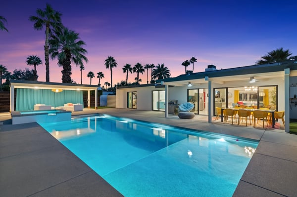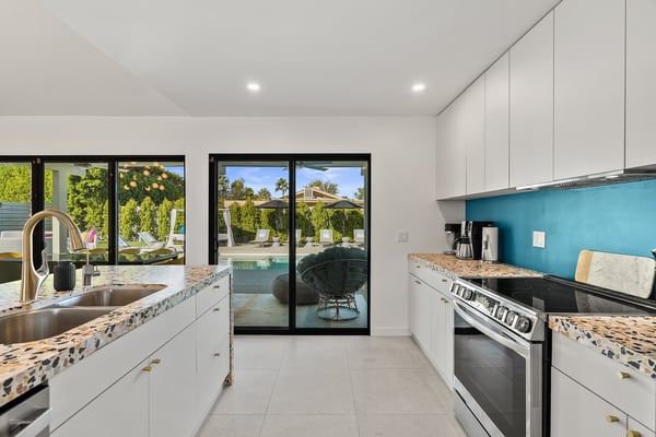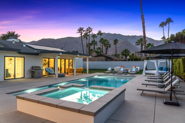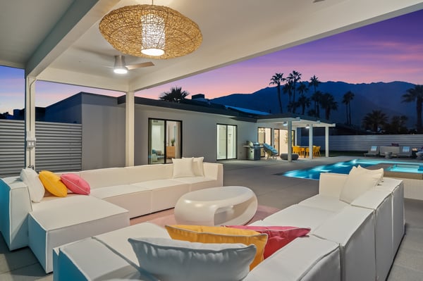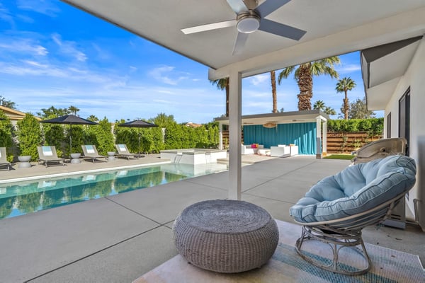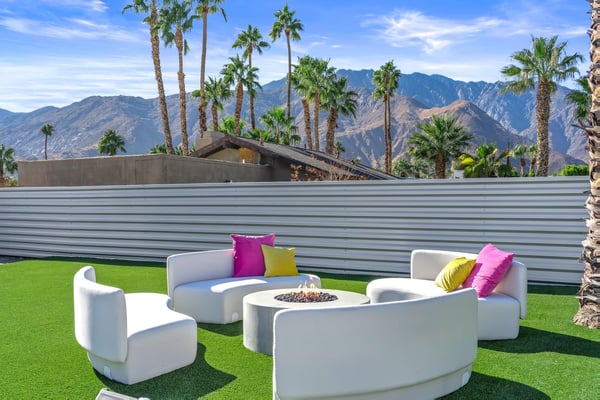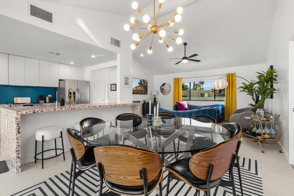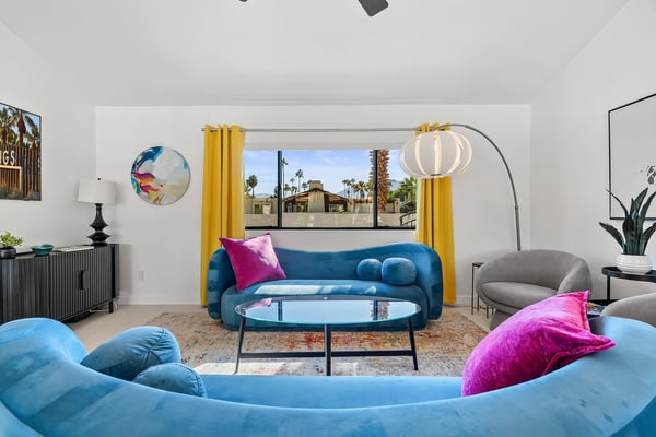 Fabulous fun awaits at The Tipsy Kitten Guest House, a spectacular Palm Springs retreat boasting 3 bedrooms and 2 bathrooms that accommodate 8 guests. Nestled near downtown Palm Springs, enjoy days prowling boutiques, teeing off on golf courses, or experiencing the exciting nightlife of this famous desert town. Although with such an enchanting backyard—including a pool, hot tub, outdoor living room, and fire pit—guests may prefer to spend every second relaxing on the property! Bright and bold, the interior of this single-story home splashes of colourful hues paired against black and white accents for a whimsical, contemporary design. In the living space, recline on the velvet couches to watch TV or share a bottle of wine with friends while the gas fireplace warms up chilly evenings. The open kitchen, featuring eye-catching terrazzo countertops, has everything guests need to craft multi-course meals or morning mimosas. Up to 8 can dine around the dining table, with 4 additional seats at the breakfast bar. Out the sliding glass doors, discover paradise in the form of a sunlit pool and hot tub, surrounded by views of palm trees and majestic mountaintops. Stretch out for a midday catnap on the umbrella-shaded loungers or the king-sized, canopied daybed. Under the pavilion, relax on 2 comfortable couches as the overhead fans offer a lazy breeze. A firepit with comfy seating, a propane grill, and an 8-person table make this idyllic backyard the perfect place to gather day or night! When it’s time to turn in for the evening, guests can retire to the primary bedroom with a king bed, private bathroom, and a slider to the backyard. There are 2 additional guest bedrooms—with 2 queen beds in the first bedroom and 1 king bed in the second. Every bedroom features a TV and beautiful décor, and a washer and dryer offer convenience for extended stays. Experience a Palm Springs getaway filled with laid-back luxury and intoxicating fun at The Tipsy Kitten Guest House. On-site parking and a Tesla EV charger make exploring the area easy or taking a day trip to Joshua Tree National Park. Book this delightful home today! Dogs are allowed with a maximum of 2 dogs under 35 lbs each. There is a pet fee of $150, plus tax. City of Palm Springs No. 064102