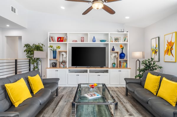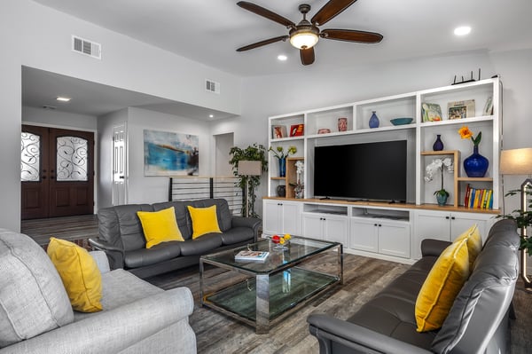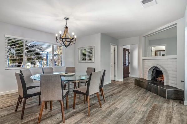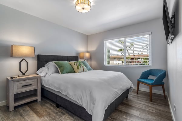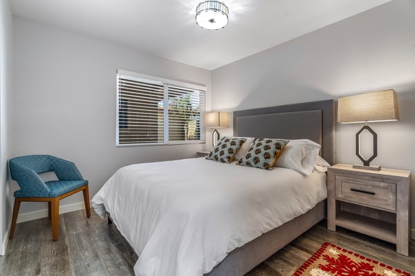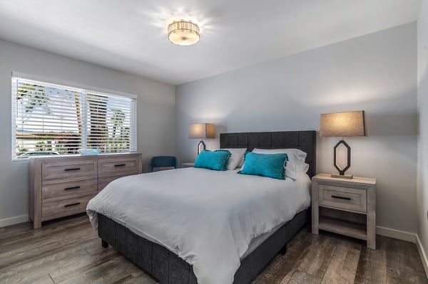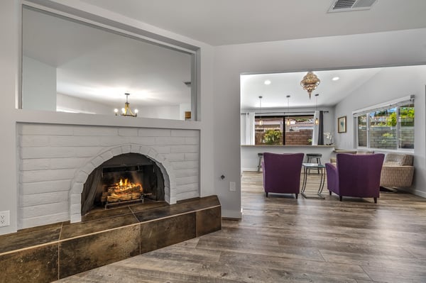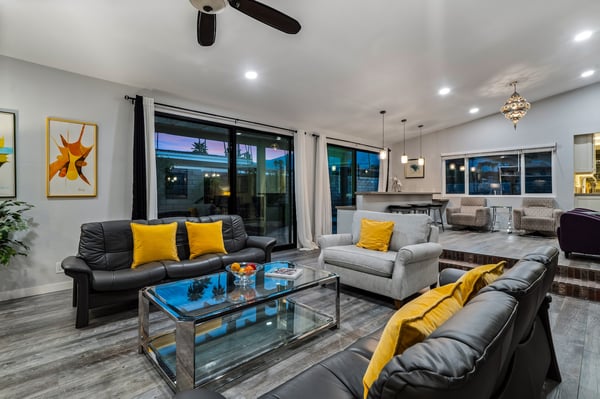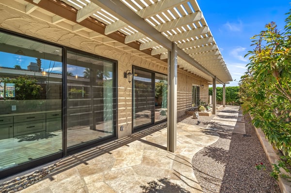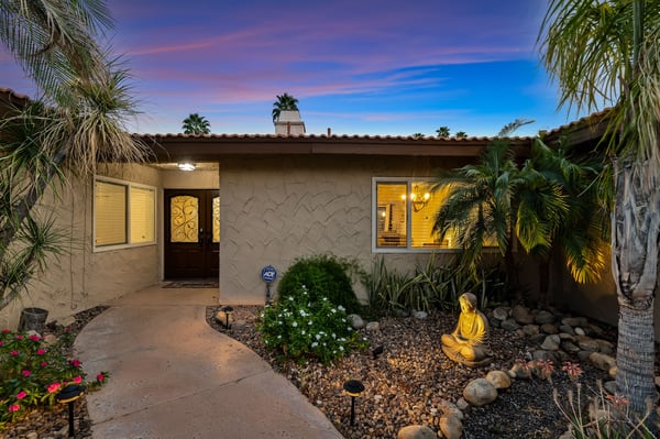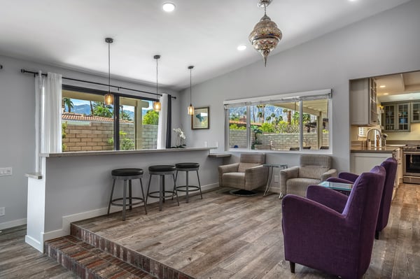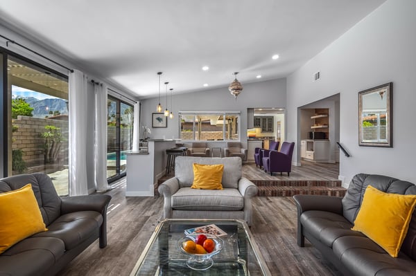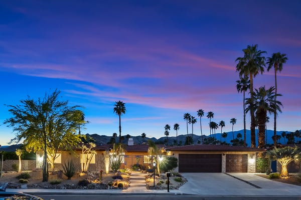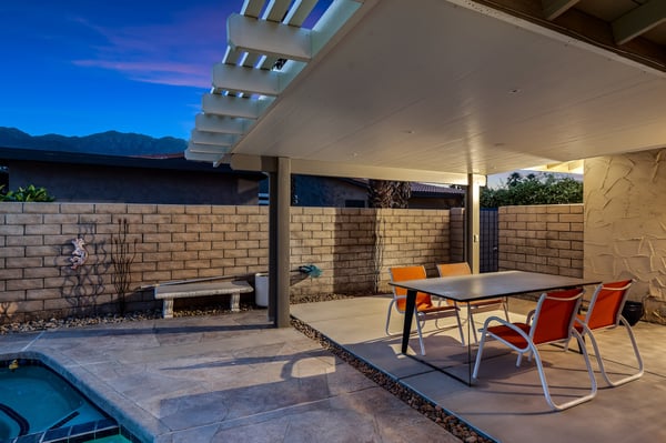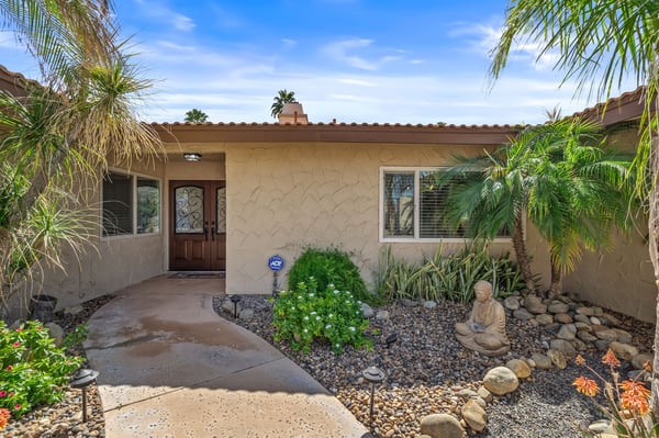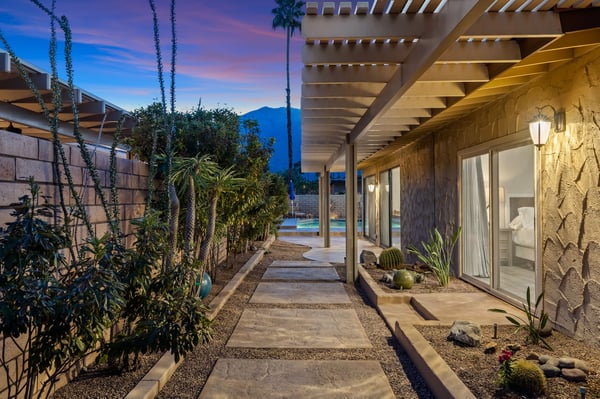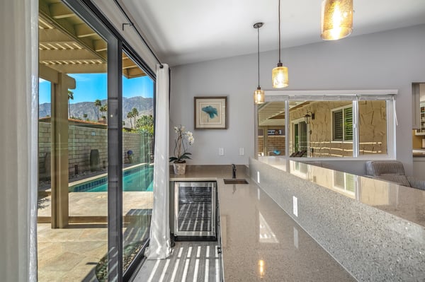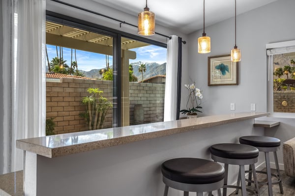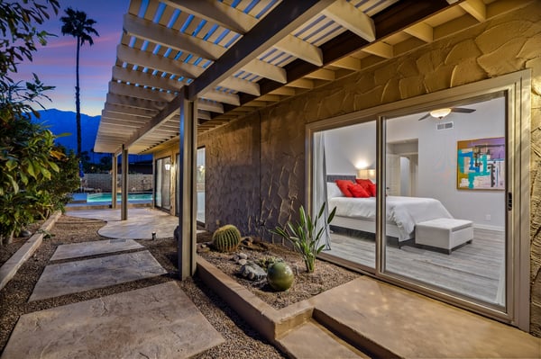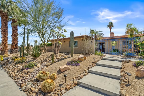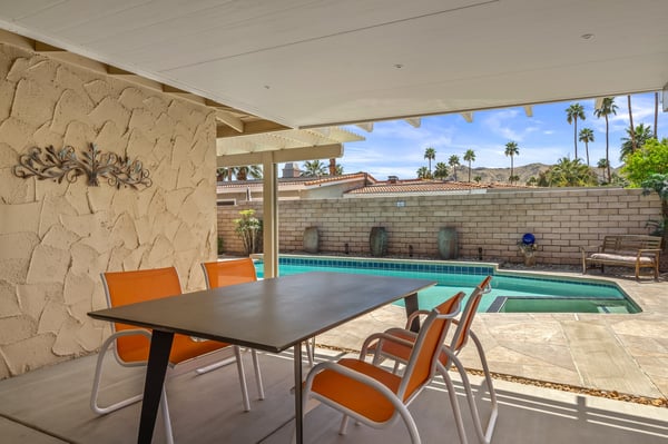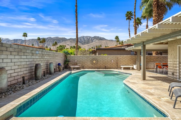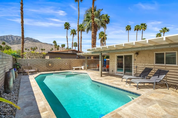 Discover blue skies and relaxing vibes at Azure Gate Retreat. This 4-bedroom, 2.5-bathroom home sleeps up to 8 guests in beautiful Palm Springs. Explore the breathtaking scenery of Joshua Tree National Park and Coachella Valley, tee off at a top-tier golf course, or take an architecture tour. When not out and about, guests will love sunning by the sparkling private pool or indulging in a peaceful soak in the sitting spa. As its name suggests, guests enter this beautiful mid-century modern property through a blue gate set on landscaped grounds. Inside the single-story home, find a renovated interior adorned with chic furniture and dashes of bright colours. A few steps offset the living space, offering a distinct gathering space with 2 soft couches and an armchair surrounding a 70” Smart TV. Nearby is a second sitting area with 4 club chairs and a 3-stool wet bar—enjoy mixing cocktails or mocktails after a day of fun. Around the corner is a dining space with a gas fireplace and a round 8-seat table. The fully equipped kitchen has Samsung appliances and plenty of counter space for guests to prepare meals and snacks. Step through the sliding glass doors off the kitchen or living space into the sun-drenched, walled-in backyard, accented by towering palm trees and the San Jacinto Mountains. An inviting private pool promises a refreshing swim, or guests can lounge on the chaise chairs, in the sitting spa, or at the shaded 4-seat table. Follow the paver path to a second patio area lined by thick hedges with a 3-seat table and wicker loveseat—a perfect spot to enjoy a quiet morning cup of coffee. At bedtime, guests can retire to the primary bedroom with a king bed, Smart TV, private bathroom, and glass slider. There are also 3 lovely guest bedrooms, each with a queen bed. For convenience, there is a washer and dryer. Enjoy a Palm Springs escape at Azure Gate Retreat, and easily explore local attractions with on-site parking. Book today for a fabulous getaway! City of Palm Springs No. 45082