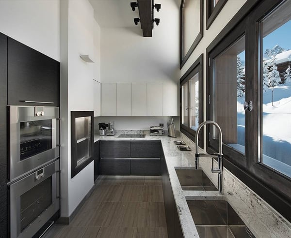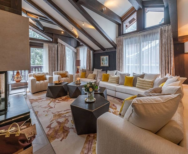 Chalet Belle Vie has been thoughtfully designed to blend sophisticated finishes and innovative materials with cutting-edge amenities. Inspired by the snowy alpine surroundings, textures and shimmering details throughout the chalet echo the magic of the mountains. The highlight is the magnificent spa and swimming pool area, featuring a ten-meter pool, a tranquil steam room, a Jacuzzi, and a dedicated massage room, all offering a serene retreat after a day on the slopes. A sculpted staircase at the chalet core leads to a lush rooftop garden, while the interiors are bathed in natural light and crafted for both peaceful relaxation and grand entertaining. The chalet's refined colour palette and bespoke materials, including textured stones, intricate mosaics, and rich ceramics, create inviting spaces to read, unwind, and recharge, all while enjoying spectacular mountain views from every corner.