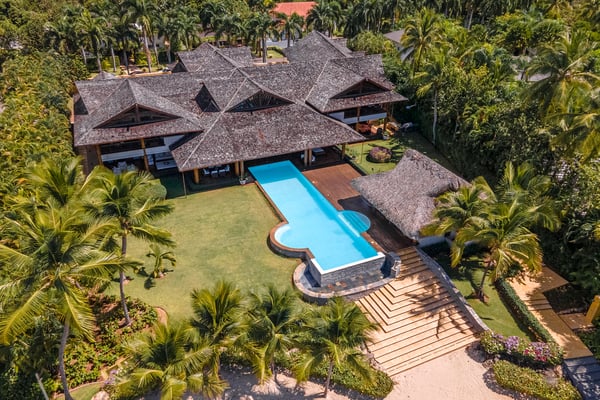 All guests must register with the Casa de Campo Concierge office, and for a small daily fee ($30 per adult per night & $15 per child per night), are granted access to resort areas and amenities. Casa de Campo Resort facilities and amenities include golf courses ($), the fitness centre ($), racquet center ($), restaurants ($) and bars ($). Contact Rental Escapes for more information about pricing. Casa Bahia Azul is one of Casa de Campo’s most impressive private oceanfront estates. Designed as a dramatic tropical pavilion, the villa unfolds around soaring double-height living spaces, warm wood finishes, and open-air corridors that invite ocean breezes and natural light throughout. From the moment you enter, crystal chandeliers, handcrafted furnishings, and rich hardwood floors set the tone for refined yet relaxed island living. The heart of the home is a spectacular open-plan great room, seamlessly connecting indoor lounges, dining areas, and outdoor terraces. Floor-to-ceiling sliding doors open to a stunning infinity-edge pool, and a private stretch of beach just steps away. Each bedroom features vaulted ceilings and tranquil views of either the ocean or lush tropical gardens. The primary suite stands out with its expansive layout, elegant canopy bed, and a private terrace overlooking the water. A chef’s kitchen and formal dining space make entertaining effortless, while shaded outdoor lounges and a beachfront deck create the ultimate setting. A private pier extends into the calm turquoise waters, ideal for boat arrivals, paddleboarding, or simply enjoying the sea from your own secluded dock. Surrounded by towering palms and vibrant gardens, Casa Bahia Azul offers complete privacy while being just minutes from Casa de Campo’s golf courses, marina, restaurants, and spa.