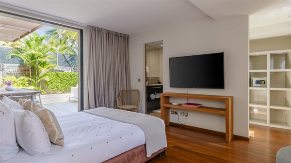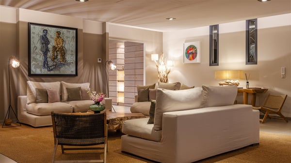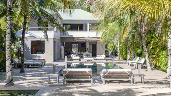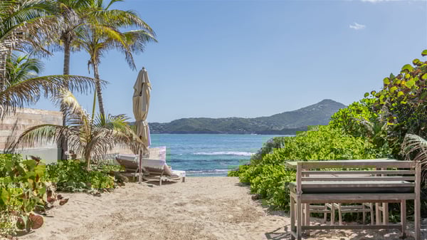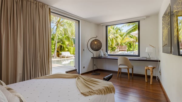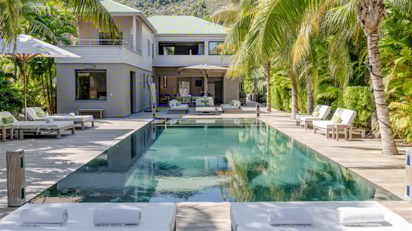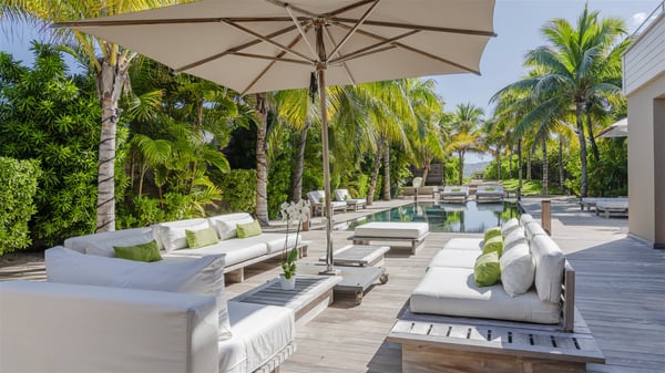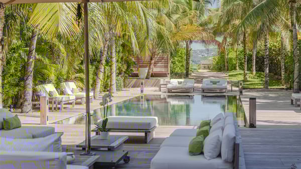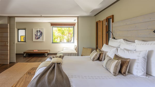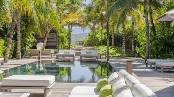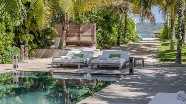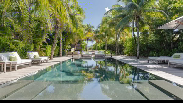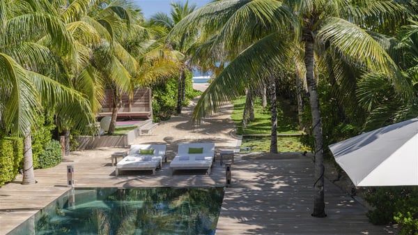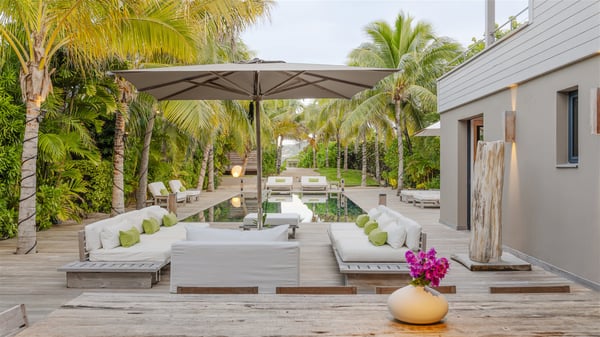 Located on the beach of Anse les Cayes, the sumptuous rental Villa K is a very modern property nestled in the heart of coconut trees behind the dune. A true gem designed by the architectural company Patrick Raffeneau, Villa K is an outstanding four-bedroom vacation home, perfect for an unforgettable stay in Saint Barths. The contemporary and elegant rental Villa K is built on two levels and has its own pathway which leads to the fine sand of the beach popular with surfers, Anse des Cayes. The large living room opens onto the terrace and is furnished with comfortable sofas. The well-equipped kitchen is perfectly functional for private chef services for any festive events. It has a breakfast bar with six raw wooden stools reminiscent of the exquisite sea driftwood touches found throughout the villa. At the front, there is a beautiful terrace in a refined design around a splendid heated swimming pool surrounded by lounge chairs and daybeds. Sand-coloured umbrellas provide shaded areas on the deck which opens onto a path leading to the beach. The welcoming dining room can accommodate up to ten guests on the terrace for pleasant alfresco dinners. In the heart of the lush vegetation of palm and coconut trees, the atmosphere is peaceful, perfect for relaxation and rest. A lovely fountain and a koi pond add a fresh and refined touch to this sunny terrace located only a few steps from the dune and the beach, which is protected by rocky reefs and perfect for fording and exploring. The superb Villa K welcomes you and your guests in four luxurious air-conditioned bedrooms with king or queen-size beds and private bathrooms. Two of them are located on the first floor and offer a beautiful view over the ocean from their terraces. The other two bedrooms are on the first floor and open onto the large deck with a swimming pool. Both sophisticated and modern, furnished with carved wooden furniture and refined fabrics, Villa K is the perfect place for families and groups of friends wishing to spend a great stay or wedding parties in the splendour of the Caribbean.