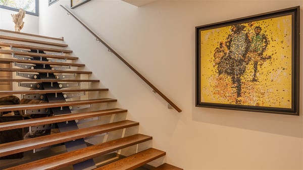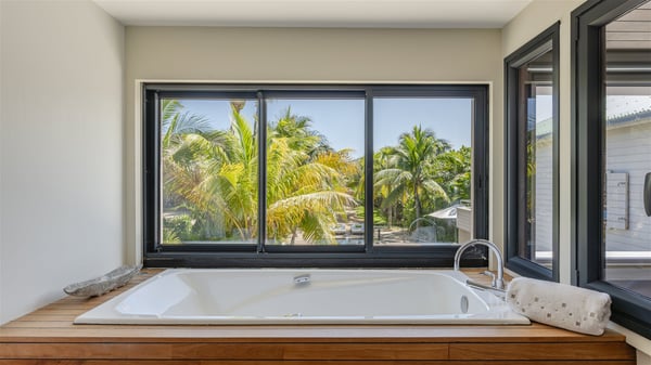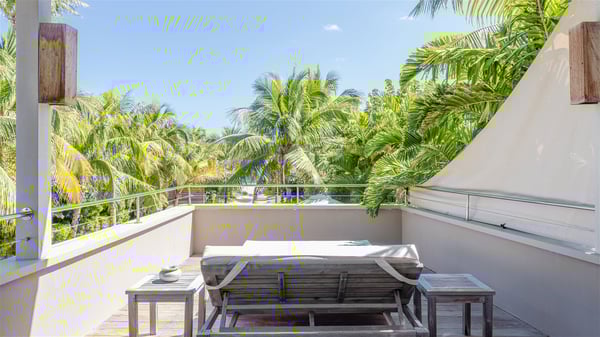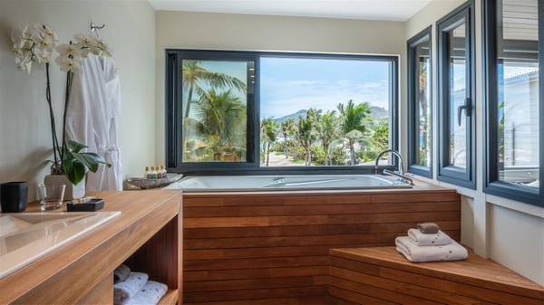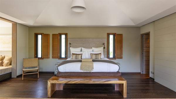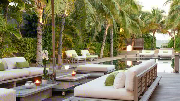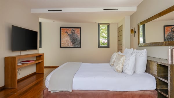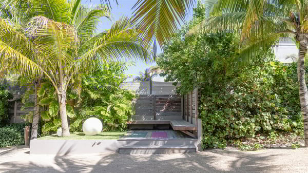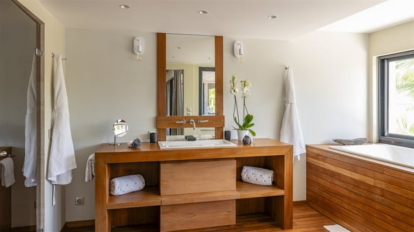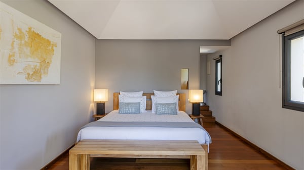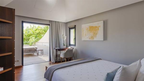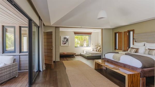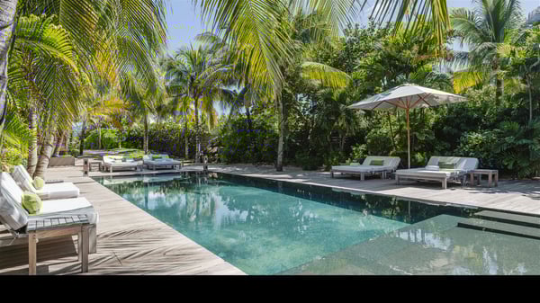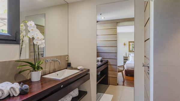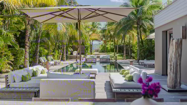 Located on the beach of Anse les Cayes, the sumptuous rental Villa K is a very modern property nestled in the heart of coconut trees behind the dune. A true gem designed by the architectural company Patrick Raffeneau, Villa K is an outstanding four-bedroom vacation home, perfect for an unforgettable stay in Saint Barths. The contemporary and elegant rental Villa K is built on two levels and has its own pathway which leads to the fine sand of the beach popular with surfers, Anse des Cayes. The large living room opens onto the terrace and is furnished with comfortable sofas. The well-equipped kitchen is perfectly functional for private chef services for any festive events. It has a breakfast bar with six raw wooden stools reminiscent of the exquisite sea driftwood touches found throughout the villa. At the front, there is a beautiful terrace in a refined design around a splendid heated swimming pool surrounded by lounge chairs and daybeds. Sand-coloured umbrellas provide shaded areas on the deck which opens onto a path leading to the beach. The welcoming dining room can accommodate up to ten guests on the terrace for pleasant alfresco dinners. In the heart of the lush vegetation of palm and coconut trees, the atmosphere is peaceful, perfect for relaxation and rest. A lovely fountain and a koi pond add a fresh and refined touch to this sunny terrace located only a few steps from the dune and the beach, which is protected by rocky reefs and perfect for fording and exploring. The superb Villa K welcomes you and your guests in four luxurious air-conditioned bedrooms with king or queen-size beds and private bathrooms. Two of them are located on the first floor and offer a beautiful view over the ocean from their terraces. The other two bedrooms are on the first floor and open onto the large deck with a swimming pool. Both sophisticated and modern, furnished with carved wooden furniture and refined fabrics, Villa K is the perfect place for families and groups of friends wishing to spend a great stay or wedding parties in the splendour of the Caribbean.