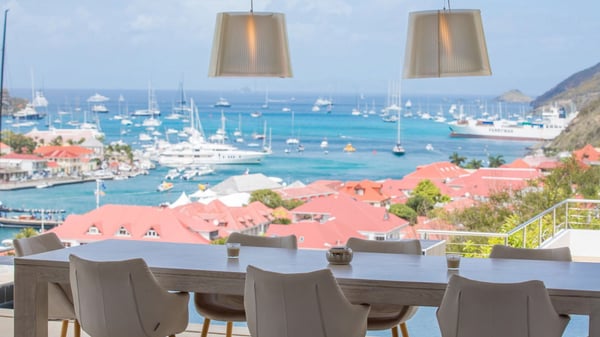 Ideally located on the heights of Gustavia, the rental villa Prestige is an exceptional property with splendid views over the harbour and yachts, the ocean, as well as the fabulous Caribbean sunsets. This three air-conditioned bedroom rental is the perfect vacation spot for a group of friends wishing to enjoy the city’s lively atmosphere while enjoying the luxury and comfort of this sumptuous vacation home in St. Barths. Villa Prestige is centrally located, allowing guests to walk in Gustavia and enjoy shops, restaurants and strolls around the harbour. Newly built and tastefully decorated in a both minimalist and elegant style, Prestige is a spacious property with a large, open and comfortable living room facing the panorama over the ocean and the harbour. White and cream-colour hints create a bright atmosphere perfect for relaxing. The indoor dining room can accommodate up to six guests around the beautiful white table for meals prepared in the lovely well-equipped kitchen. You may prefer to dine alfresco around the outdoor dining table for eight guests in the gentle island breeze, enjoying the exceptional light of St. Barths. At the front, the large terrace is furnished with a beautiful swimming pool where you’ll enjoy relaxing at any time. Sun loungers are harmoniously set up on the large deck facing the view over the harbour, the yachts and the perfect horizon. In the evening, a true light show takes place with the glowing sunsets mixed with the fairy city lights. The rental villa Prestige welcomes you in three beautiful air-conditioned bedrooms with private bathrooms and view over the harbour. Two of them feature king-size beds while the third one is equipped with twin beds. Colours are soft in a mineral palette of white and gray in soothing light. All rooms open onto the view and the large terrace, to enjoy the outdoor living spaces at any time. Only a few steps away from Shell Beach, the vacation villa Prestige is a charming property elegantly combining the lively city way of life with upscale amenities, for an unforgettable stay in St. Barts.