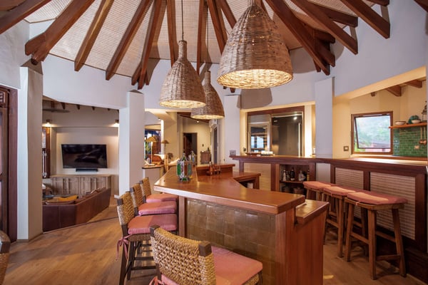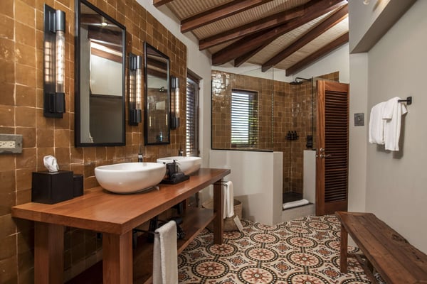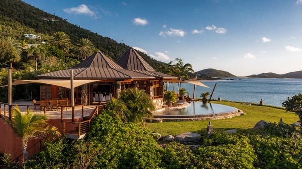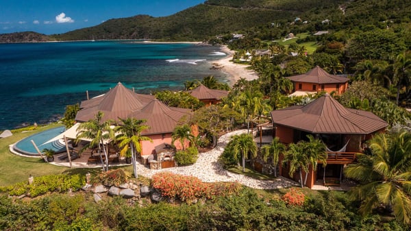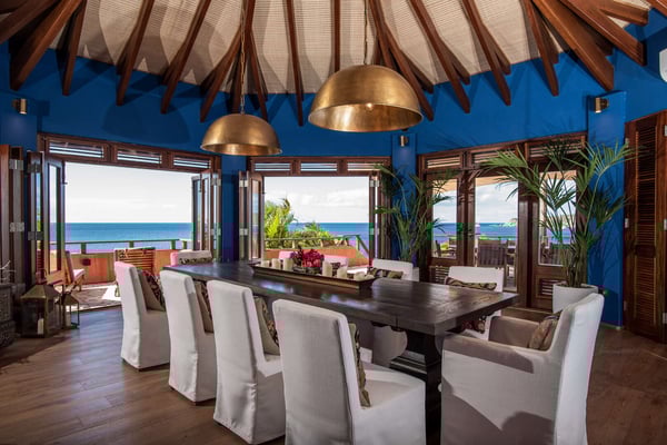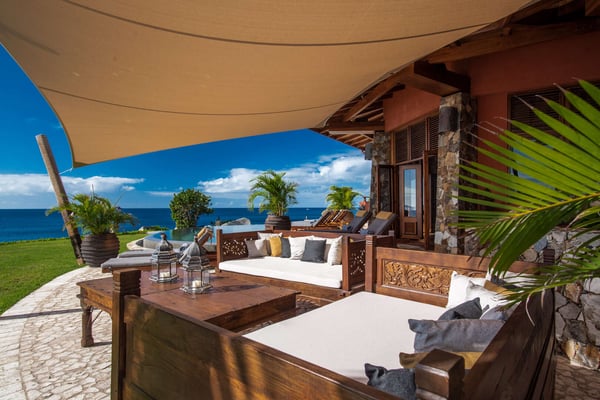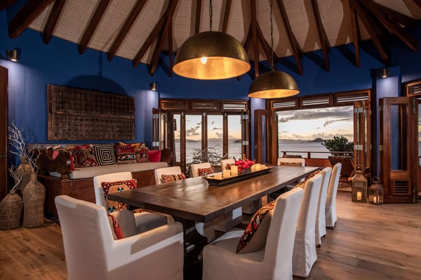 Accommodating 16 guests in total, Baraka Point Estate is the perfect private hideaway with a layout that lends itself to hosting large families, groups of friends, corporate retreats, weddings and special celebrations of any kind. Please discuss your group size with us prior to making a booking so that we can advise you about the configuration of suites and the maximum number of adults and children we can sleep. Designed with the most discerning of travelers in mind, Baraka Point captures the colours of the Caribbean and sets them against hard woods, sumptuous handmade silks and ethnic furnishings from Indonesia, India and China to create a unique blend of styles described as Island Exotica by Coastal Living Magazine. A haven of peace and tranquility, Baraka Point's serpentine path winds through two acres of tropical gardens, out of which rise the villa's distinctive copper peaked pavilions with five king size ocean view suites plus four small children's bedrooms. A fourth, larger pavilion incorporates the spacious living, dining and entertainment areas of the villa while the spa and games room occupy two further pavilions. Open plan and airy, the colors and furnishings of the main pavilion are easy on the eyes while sweeping coral stone terraces are soft on the feet. An infinity pool with panoramic views wraps around the main terrace, and a second alfresco dining terrace with a giant shade sail gives sanctuary from the midday sun. Friends and family can meet in the main pavilion to share time together or retreat to the privacy of their suite for some down time or a siesta. Beyond the pool an emerald green lawn leads to a spectacular seaside deck sunken into boulders providing guests with an idyllic spot to watch magical British Virgin Island sunsets with freshly prepared cocktails and canapes. It is the ultimate chill-out space by the sea.