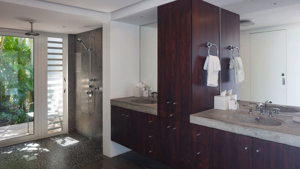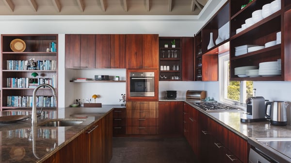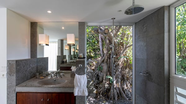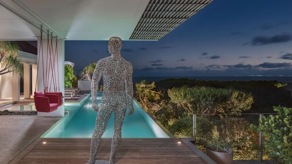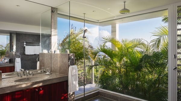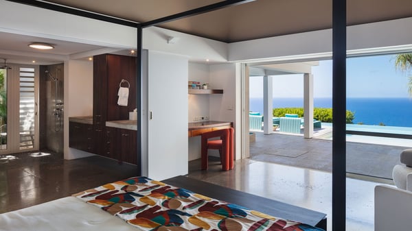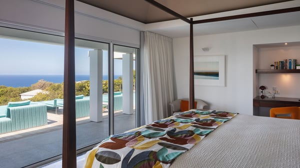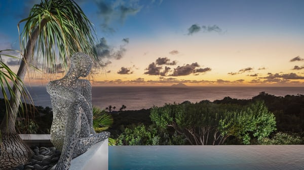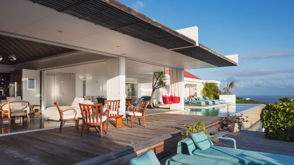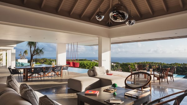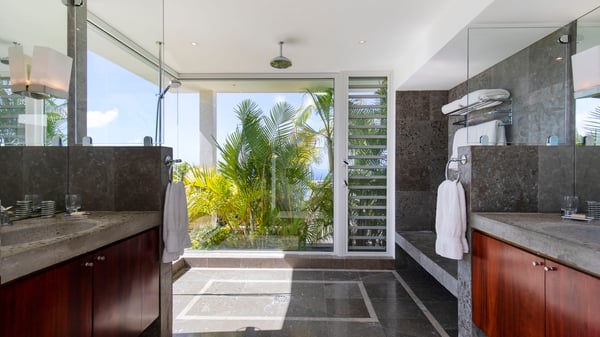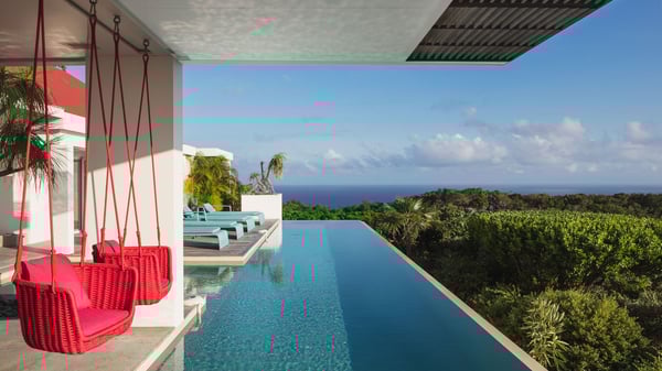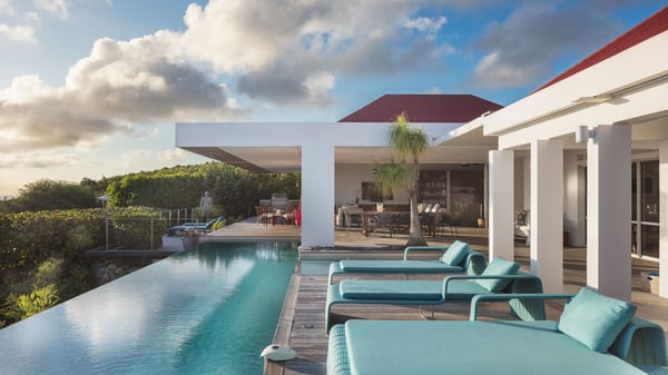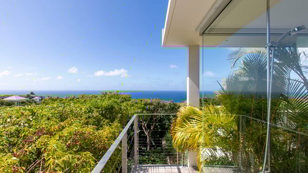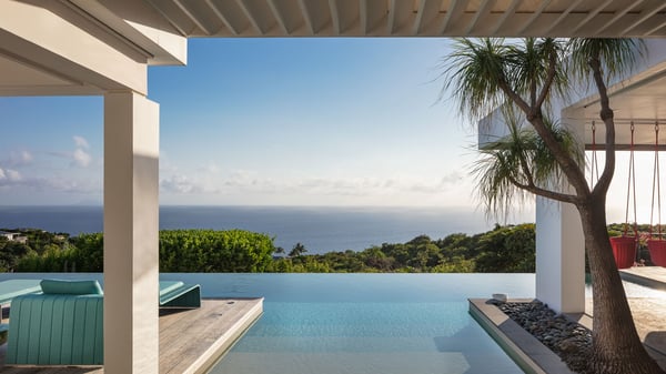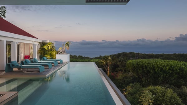 Ideally located on the heights of Gouverneur, the vacation rental villa Bellissima is a magnificent three-bedroom property with an exceptional view over the ocean and the sumptuous sunsets. Between sky and sea, villa Bellissima welcomes families and groups of friends wishing to spend an unforgettable stay in the Caribbean. Built on one level with a main building and a bungalow, Villa Bellissima in St. Barths is a true haven of peace in a very private environment. The living room opens onto the covered terrace, forming a single space between the cozy indoor living room with a sofa and armchairs, in front of a flat screen TV and a library, and the outdoor space with a covered area and a spacious dining room for six guests. The well-equipped kitchen features utmost comfort around a central island with a dining area. The vaulted, whitewashed ceiling brings a pleasant feeling of volume to this most refined and spacious indoor space, where you will enjoy relaxing and admiring the view over the ocean and the terrace. At the front of Villa Bellissima, as an extension of the covered dining room, you will discover a magnificent heated infinity swimming pool with sun loungers. This is the ideal place for pleasant sunbathing or reading sessions in the gentle trade winds that gently blow over the island. A deck with a barbecue is also at your disposal to cook fine dinners under the Caribbean stars. What’s more, the splendid view over the ocean and the horizon in the distance is all the more enchanting since the place is truly a dreamy one. The vacation rental villa Bellissima consists of three beautiful air-conditioned bedrooms with en-suite bathrooms. Two of them are in the main building and are furnished with queen-size beds for one and convertible twin beds for the other. The third bedroom is located in a separate bungalow for utmost privacy and can be accessed from the outside. Spacious, luxurious and equipped with the best amenities, Bellissima is the perfect villa for your next stay in St. Barths.