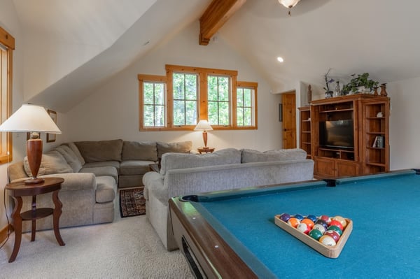 Perched on beautiful wooded grounds, Sierra Gold Homes invites a picturesque mountain getaway. This luxurious, custom-built home is located in the Big Springs area of Northstar Resort, accommodates 8 guests, and boasts 4 bedrooms, 4 full bathrooms, 2 half baths, and over 3,500 square feet of living space. After days exploring the ski runs, hiking trails, or enchanting blue waters of Lake Tahoe, guests will love unwinding by the crackling fireplace or stargazing on the secluded back patio. Stunningly crafted with wood and stone, this 2-story home offers the feeling of a cozy mountain lodge from the moment guests arrive. The first floor features an open layout with a spacious living area tucked beneath a vaulted ceiling with tongue-and-groove detailing. A soft, oversized sectional, wood-burning fireplace, and Fire TV set the scene for cozy nights, savouring cocoa and wine. When hunger strikes, the kitchen is well equipped for snacks and other culinary creations with a double oven, 5-burner stovetop, and a vast island that doubles as a 4-person breakfast bar. To the side is a formal dining area with an 8-seat table and large picture windows framing the lush scenery. During the Summer months, enjoy the gas grill and alfresco dining table for 6 on the shady patio. Retire for the night in either the primary bedroom, replete with a king bed and gas fireplace, or the guest bedroom with a queen bed—both feature private bathrooms and a TV. For convenience, a washer and dryer are near the garage. Upstairs, relax in the comfortable family room with a corner sofa, loveseat, pool table, and TV. This level hosts 2 guest bedrooms with private bathrooms and TVs—the first features a queen bed, and the second has 2 twin beds and a DVD player. In every season, Sierra Gold Home is a perfect base for a Lake Tahoe escape. Parking for 1 car in the garage and 2 in the driveway makes it easy to explore the area. For ski access, the nearest ski lifts are a 5-minute drive away at The Village at Northstar. Guests can also take advantage of the Northstar Shuttle Service. Book today! *Please be advised that this home does not have air conditioning. *Included in your stay is the Northstar Resort guest recreation card. It allows access to the shared pools and recreation center amenities. However, the Northstar Resort charges $10.00 per person, per day to use the recreation center with the guest card. Children under 3 are free. STR Permit #: 9386