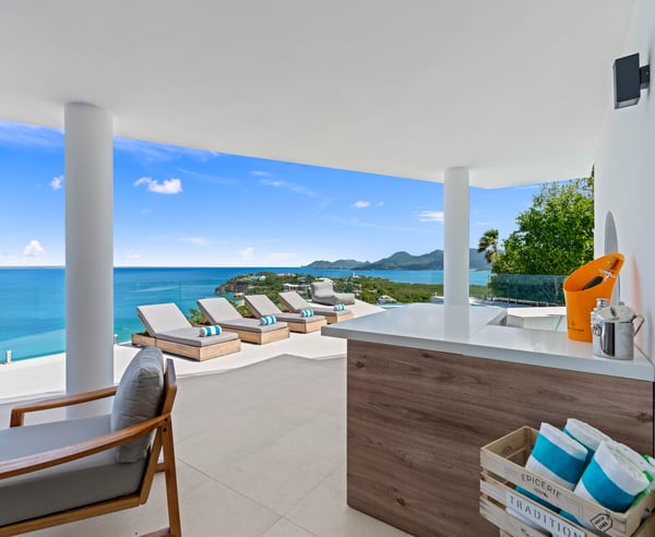 Villa Aqua Rock on St Martin is located in the gated community of Mont Rouge within Terres Basses. Simply spend your day on the pool terrace listening to the sweet songs of the tropical island birds while water from the infinity pool cascades over invisible edges. Designed intricately through the inspiration of modern interiors and enhanced by refined design touches. This fabulous four-bedroom villa is the true definition of tropical bliss. From its elevated perch above Baie Rouge, you will be able to experience the amazing views of the turquoise Caribbean Sea and Atlantic Ocean and take in the gorgeous curves of the St Martin coastline.