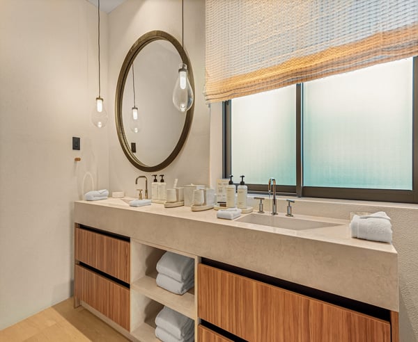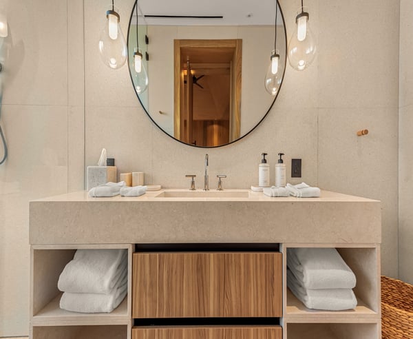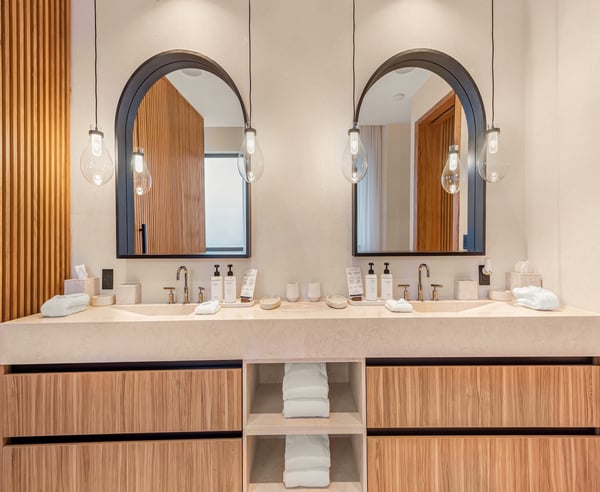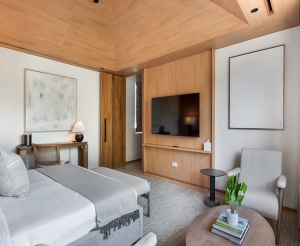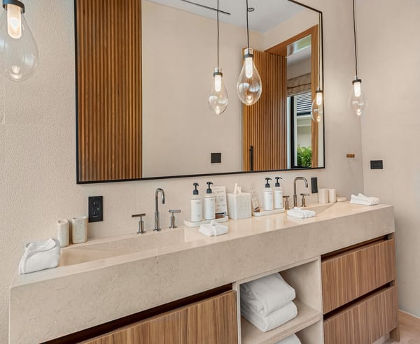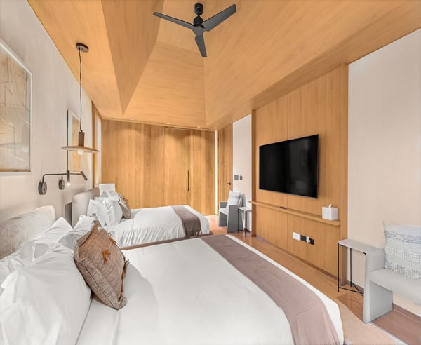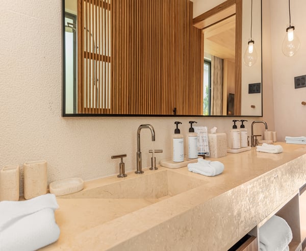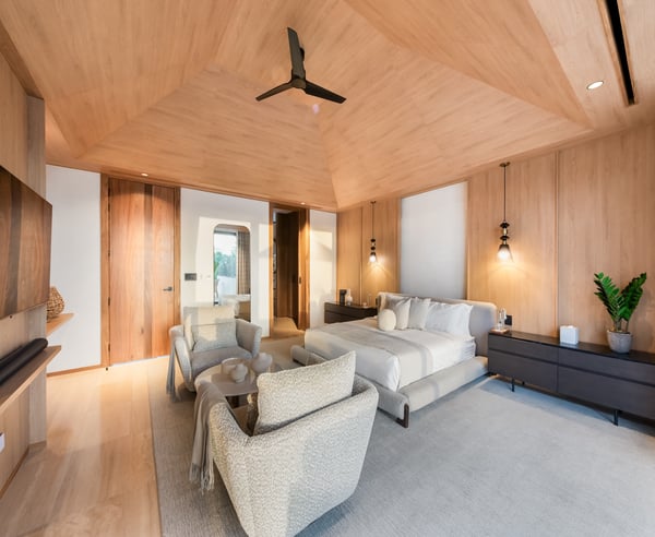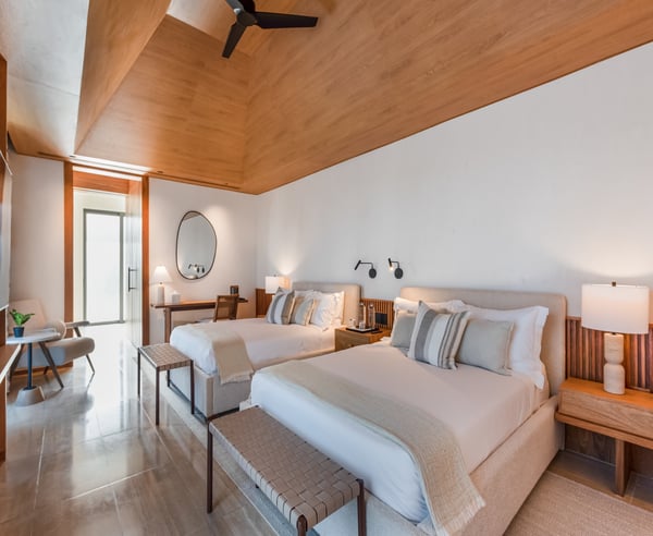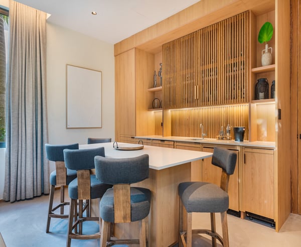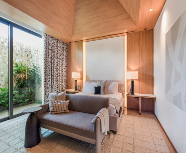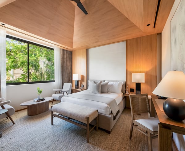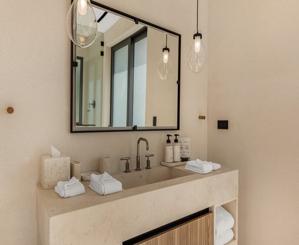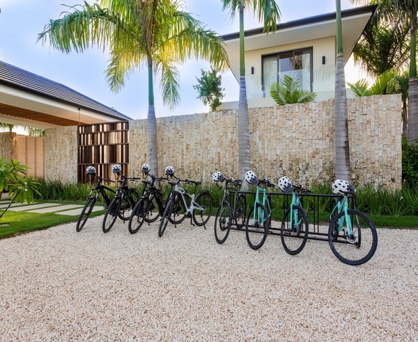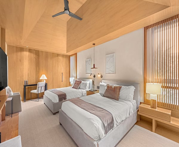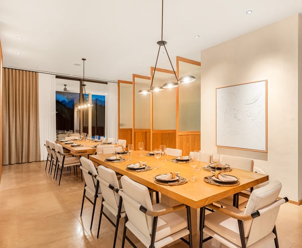 Guests staying within Puntacana Resort & Club will have access to some resort amenities and facilities. Resort amenities and facilities include two golf courses ($), two beach clubs ($), Six Senses Spa ($), restaurants ($), bars ($) and tennis centre ($). Discover La Serenissima, an 8-bedroom architectural sanctuary in Playa Serena, the most exclusive beachfront enclave of Puntacana Resort & Club. Just ten minutes from Punta Cana International Airport, this contemporary villa accommodates up to 16 guests with refined architecture, personalized service, and a dedicated spa. Here, time moves at your pace, whether you're savoring sunset cocktails, experiencing bespoke wellness treatments, or simply embracing the island's tranquil rhythm. La Serenissima embodies tropical modernism with Japandi influences: clean lines, earth-toned palettes, and natural textures that celebrate the island's beauty. The open-air entrance welcomes you with cascading water features, coral stone walls, and tropical hardwood that seamlessly connects indoor and outdoor living. The double-height living room features honey-toned wooden louvers that draw the eye upward to five floating white fixtures. Plush sofas, backless benches, and black leather armchairs create intimate conversation areas around a striking wood and marble coffee table. Every angle reveals views of the lush garden patio and the pool beyond. Two distinct pools define the outdoor experience—each in its own setting. At the entrance, a sleek lap pool invites refreshing morning swims, while in the backyard, an indulgent leisure pool with submerged loungers and optional heating becomes the perfect place to unwind. Shaded terraces offer ideal spots for relaxation, all enhanced by a Sonos system that carries your chosen soundtrack throughout the estate.