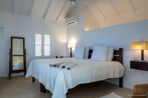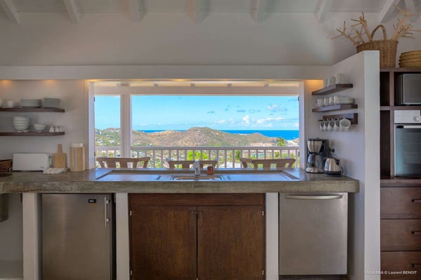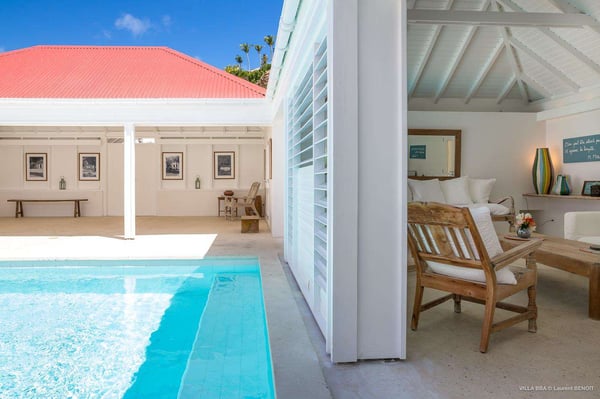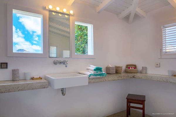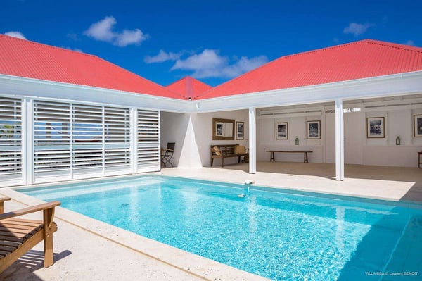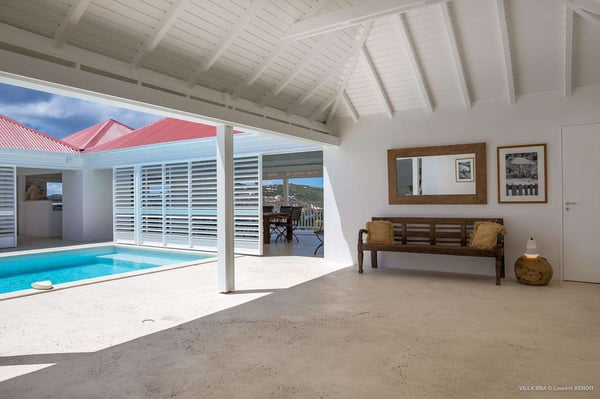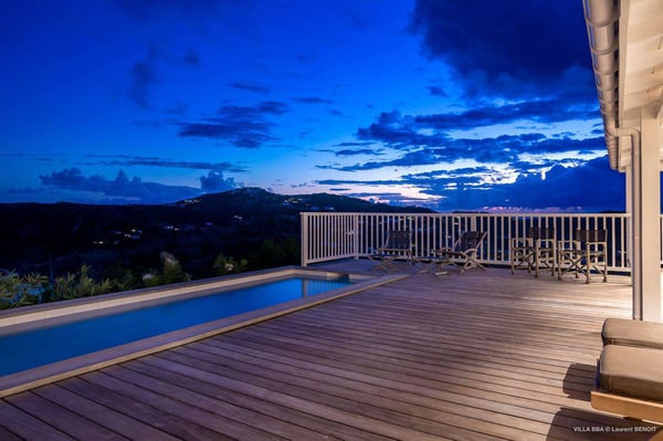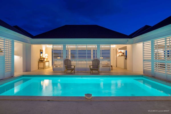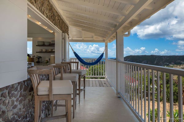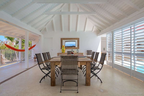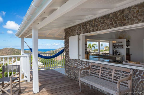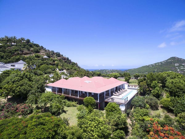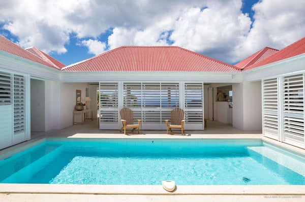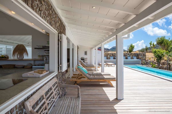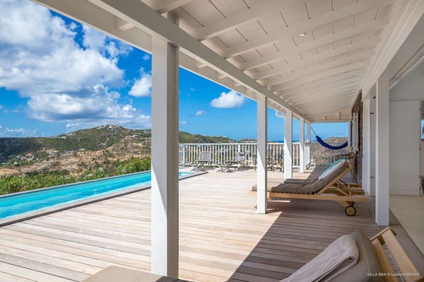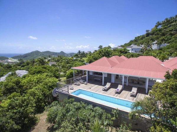 Villa Supersky is a magnificent three-bedroom, two-pool property in an exceptional setting. Ideally located in Saint-Jean in the Cricket area, Supersky offers splendid views over the rolling hills and the deep-blue ocean. Its luxurious amenities and bright spaces make it the perfect place for an unforgettable stay with family or friends in Saint-Barths. Built on one level, the vacation rental Supersky opens onto an outstanding panorama over the Caribbean nature. Designed around a central courtyard with a sparkling pool and bordered by a second, long swimming pool, Supersky welcomes you in a soothing and cozy atmosphere. Opening directly onto the pool terrace at the front and the central terrace at the rear, the lounge features a sofa, armchairs and a coffee table in a soft decor with fine touches of wood. The dining room is on the side of the villa and opens onto both the central pool and a long terrace that also serves the fully-equipped kitchen. On the other side of the villa, you’ll love the TV room where you’ll enjoy pleasant movie nights in a lovely and relaxing setting overlooking the courtyard pool. The front terrace offers a majestic view over the hills and the perfect horizon. You’ll experience delightful swimming sessions in the sparkling pool and sunbathing sessions on the nearby deckchairs. In the tropical breeze, there are hammocks inviting you to marvel at the idyllic scenery. Accessible from the living room, the dining room and the TV lounge, the central terrace features a swimming pool in a very private atmosphere. There is also a covered outdoor area at the rear of the villa, overlooking the pool in a privileged atmosphere. The holiday rental Supersky consists of three air-conditioned bedrooms with en-suite bathrooms located at the corners of the property for utmost privacy. Spacious and bright with a beige decor, they open onto St-Barths nature, with bedroom 1 onto the terrace. There are mirrors, TVs and comfortable fabrics in the bedrooms, the best place to relax after great days exploring the island's treasures. Set in St-Jean’s beautiful surroundings, Villa Supersky is the perfect place for a fantastic vacation in St-Barths.