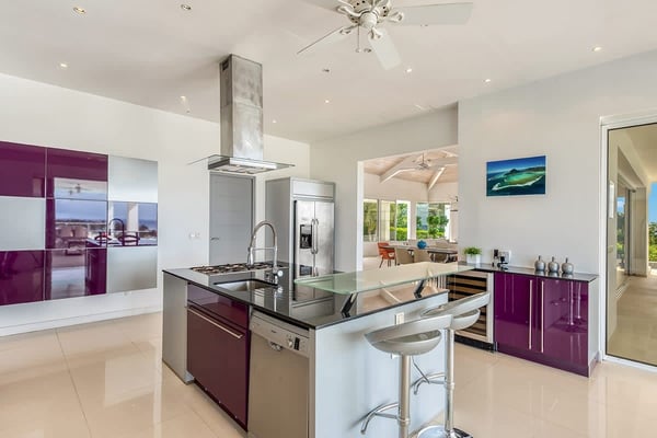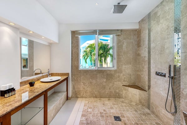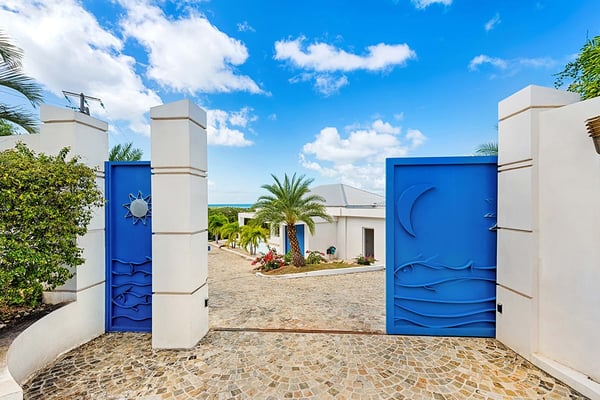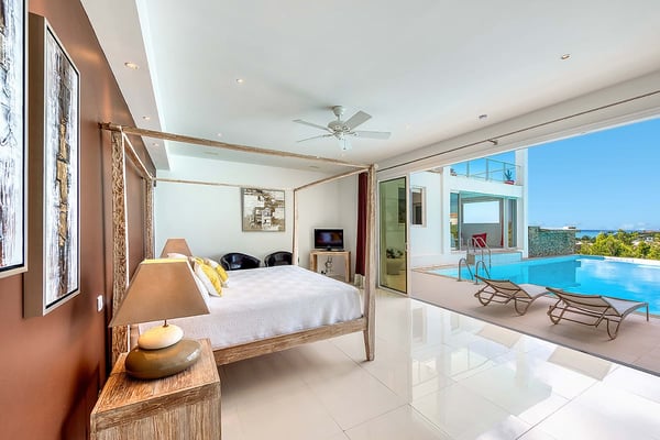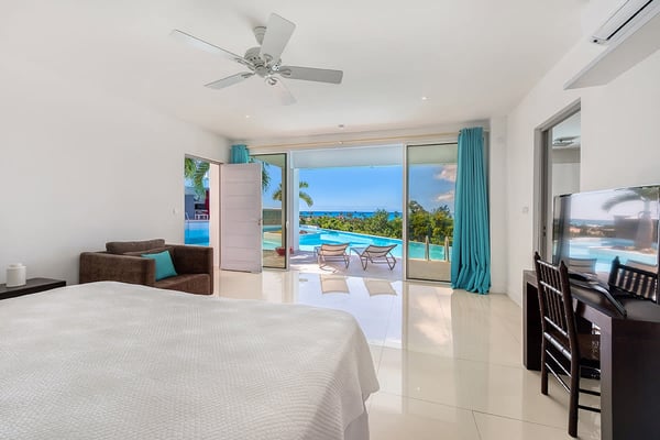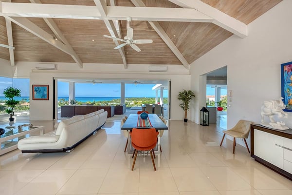 A vibrant blue gate sets the stage for mesmerizing sea views, photogenic sunsets, unique water features, and stylish tropical living straight out of a design magazine. Entering through the courtyard, a pebbled tropical stream flows invitingly around the upper level. Walk through the blue front door, and a panoramic vision in brilliant greens and blues flows all the way from the turquoise pool to the sea and beyond to the horizon. The scene is dramatic, magical, and serene. Open, airy interior and exterior rooms, with high vaulted ceilings and creamy stone floors, blend seamlessly to create a chic and contemporary, comfortable space. Expansive floor-to-ceiling glass walls and sliding glass doors open wide to the sea view, the upper pool, and spacious outdoor terraces for alfresco dining and lounging. Soft white walls, colorful modern art and accessories, plus sleek furniture in off-white and taupe are complemented by dark woods for an inviting and relaxing style. Off the dining area, facing the sea, is a modern, open kitchen in white, grey, steel, and black granite. The four bedrooms are housed in two wings. Every bedroom is equal in size with sea and lower pool views. The interiors are sleek and tranquil in whites and neutrals accented with color pops; each room is distinctive in blue, turquoise, brown, and red. The beautiful spa-style marble and stone bathrooms feature spacious walk-in showers with sea and pool views; one has a private outdoor shower. Three bedrooms are off the main space. The upper bedroom terrace has views of the sea and a beautiful lower pool. Downstairs are two pool-level bedrooms, each with views, private terraces, and ladders so you can dip in the pool from your room. The fourth bedroom, with direct lower pool access, is across the upper-level 'river' and downstairs with its own private entry just off the upper-level pool. Can be rented as a two, three, or four bedroom villa. The Lowlands is the location of some spectacular beaches: Baie Longue and Baie aux Prunes (Long Beach and Plum Beach) are secluded, have public parking, but no services. Neither beach is ever crowded. Baie Rouge is set amongst some dramatic red cliffs. The elegant homes in Terres Basses are sitting on generous lots, most of them with gorgeous views of either the Lagoon or the ocean, or both. By car it's about 10 minutes away from Marigot, and 15 minutes away from the Airport.