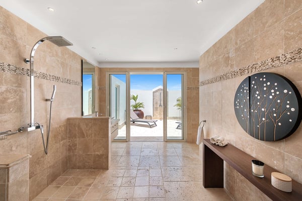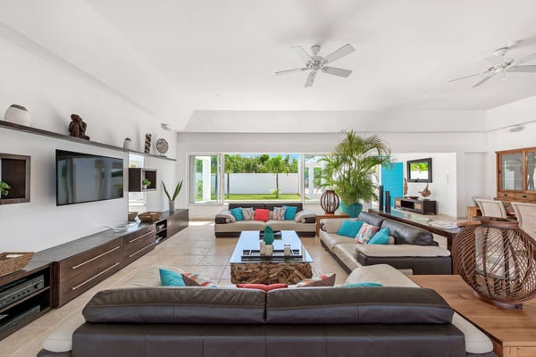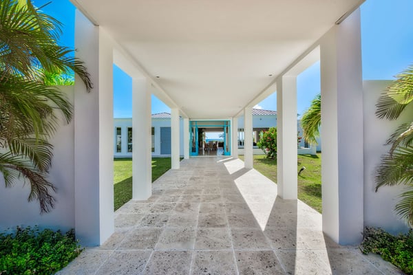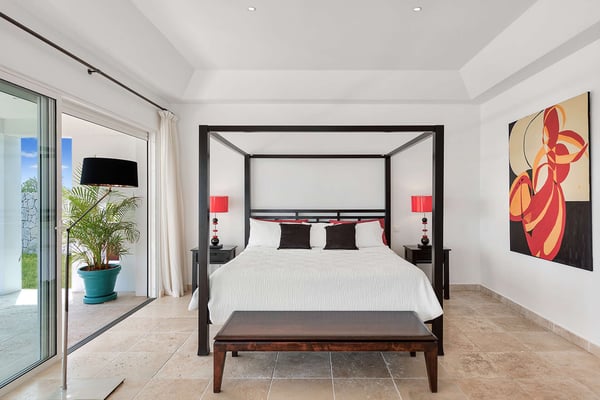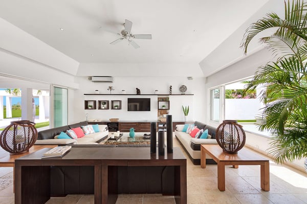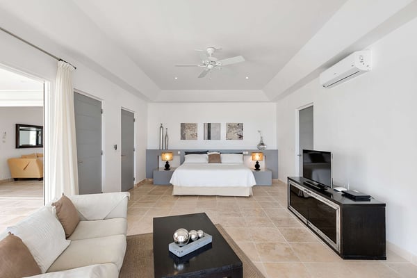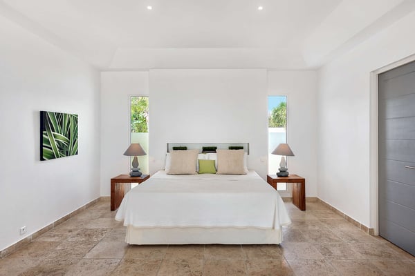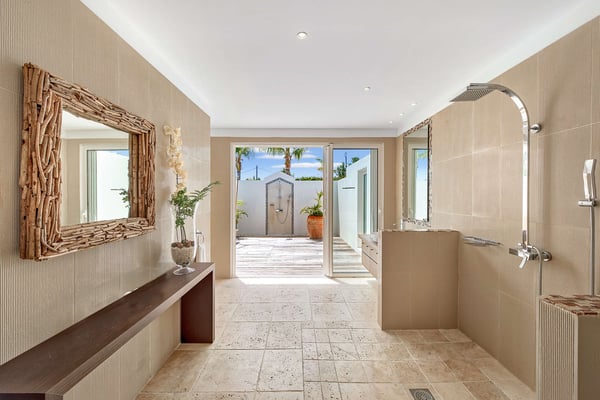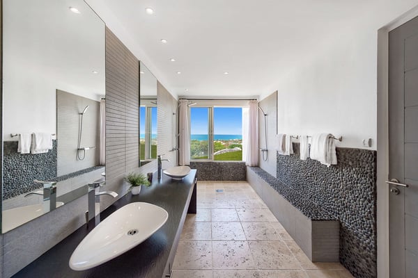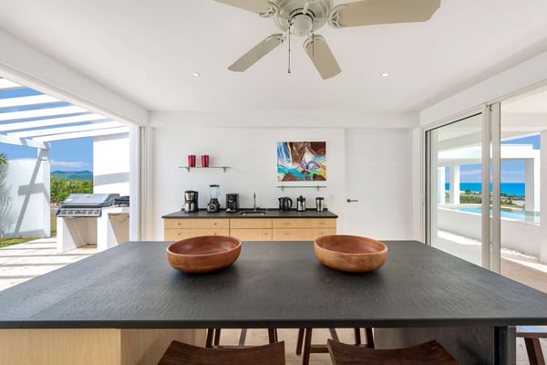 This extraordinary estate-style villa enchants the moment you enter the gate. The long, palm-lined drive brings you to a large private courtyard and garden. Beyond the front door is a stunning house and one of the most dazzling ocean views on the island. Panoramic vistas flow from every room and terrace. The colors are magical. An expansive stretch of sapphire sea is framed by the villa's gardens and the rich blue sky. The large contoured pool edges overlap the lawn, adding crystal blue tones to the scene. The house is open, airy, and spacious; a perfect villa for an extended family, weddings, or company retreat. It has everything you need to enjoy the day from dawn until dusk. The overall decor is sleek, elegant, and contemporary but never boring. The large interior living room, perfect for conversation or entertainment, tastefully mixes natural elements and rich tones: dark wood and teak, wicker, cream, and pops of color. Pocket doors disappear into the walls, enhancing the view. Although sea views and breezes abound, the great room is fully air-conditioned. The interior dining room sits adjacent to the unique kitchen area. Divided into two rooms, half the space is devoted to a gorgeous chef's kitchen with a flat-screen TV. The other half is a fabulous gathering space with a bar and seating. A cozy al fresco dining area sits in the courtyard just off the bar. Deep-covered terraces and open sundecks surround the house, the main pool, and the lap pool. Comfortable lounges and dining spaces abound. The four equal-sized bedrooms are spacious and comfortable. Two sit on each end of the villa. Villa Ambiance is designed to be inclusive and accessible, making it a welcoming retreat for guests with mobility challenges. The villa features a completely flat, convenient path to the pool area, ensuring a smooth transition throughout the outdoor spaces. Additionally, some bedrooms are fully wheelchair accessible, thoughtfully designed with accessibility in mind to provide comfort and ease of movement. Whether you're enjoying the villa's luxurious amenities or relaxing by the pool, Villa Ambiance offers a seamless and accommodating experience for all guests.