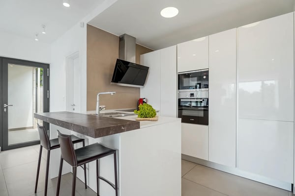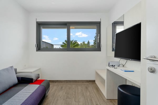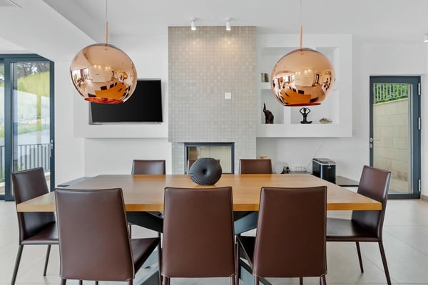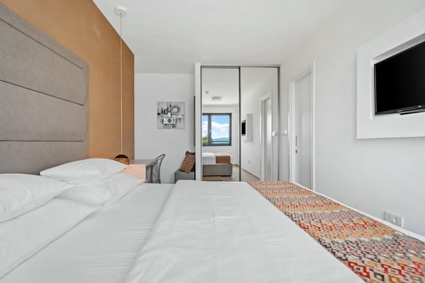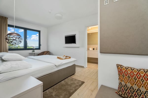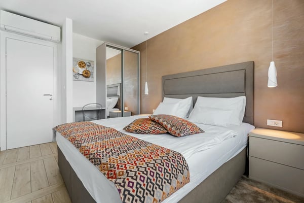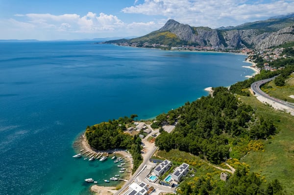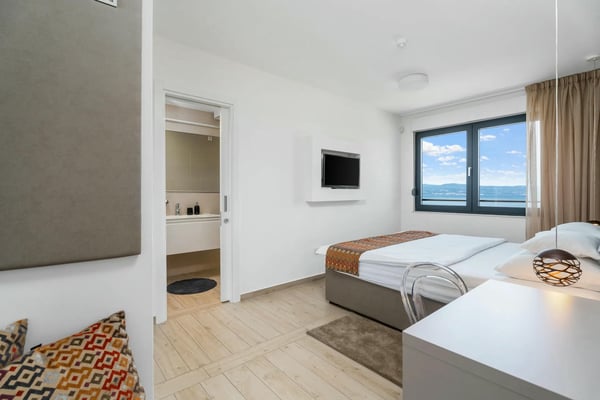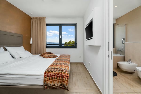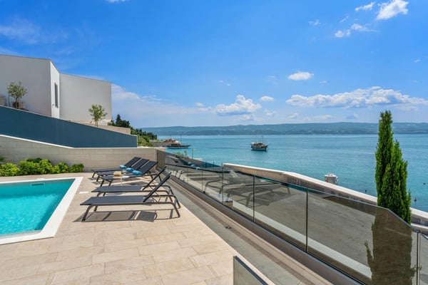 This fabulous villa to rent in Omiš is situated right on the Adriatic coast, with spectacular sea views. The location is just 2 2-minute drive to the town center, where you will find a bakery, supermarket, restaurants and a number of cafes/bars. Villa Mirabela is also just in front of the other beautiful Villa Fortica, so two of the villas can be rented together - the perfect option for large groups of family and friends. Omis is a picturesque town with a true Mediterranean atmosphere, located at the estuary of the Cetina River, just 21 km from the largest Dalmatian city of Split. The Cetina River and its magnificent canyon, a beautiful mountain in the background and a mile-long sandy beach make this part of the Adriatic coast unique and incomparable. Because of the unique location, surrounded by steep cliffs, the river and the sea, the town of Omis can be extremely proud of its extraordinary characteristics, which are impressive, to say the least. A little further afield is the bustling and vibrant city of Split, which combines history and culture with modern entertainment and a fabulous nightlife. Villa Mirabela has been designed with fantastic flair inside and out. It boasts a truly urban appearance and is surrounded by unspoiled greenery. What a setting with its wonderfully undisturbed views of the sea and nature! The villa is located on a property with a total area of 400 m². The villa itself has an area of 280 m² and extends over three floors: lower ground floor, ground floor and first floor. Villa Mirabela has 4 bedrooms, an additional bedroom with a sofa bed and 5 bathrooms and accommodates up to 8 people. You are sure to notice the attention to detail both inside and out with the villa's unique architecture and stylish design. Access to the villa is direct from the coastal road to the main entrance on the ground floor. On the ground floor, you will find a large open-plan living and dining area with a modern and fully-equipped kitchen and floor-to-ceiling windows which open out onto the terrace and swimming pool. On the lower ground floor, there is an air-conditioned gym, shower room, sauna and a smaller bedroom with a sofa bed and TV. The first floor of the Villa Mirabela is connected by stairs from the living room. The first floor features four spacious en-suite bedrooms with a bathtub and a shower, complete with flat-screen TVs. Two of the bedrooms have shared spacious terraces with lounge furniture to enjoy sea views. For those looking to relax, lounging by the outside private heated swimming pool or the beautifully landscaped sun terrace is ideal. On this terrace, you will find peace and quiet, which will enable you all the pleasures of enjoying a morning cup of coffee while listening to the romantic melody of the sea. The warm evenings will reveal the exceptional beauty of romantic sunsets, which only nature is capable of creating. Whether you are relaxing by the pool or enjoying gourmet delicacies from the outdoor grill, this is an experience that you'll remember for a long time. You will surely be eager to come here again.