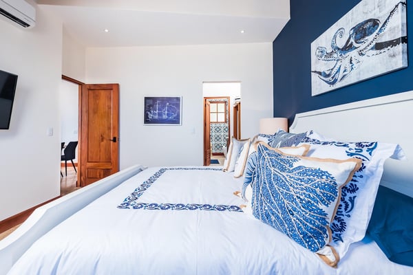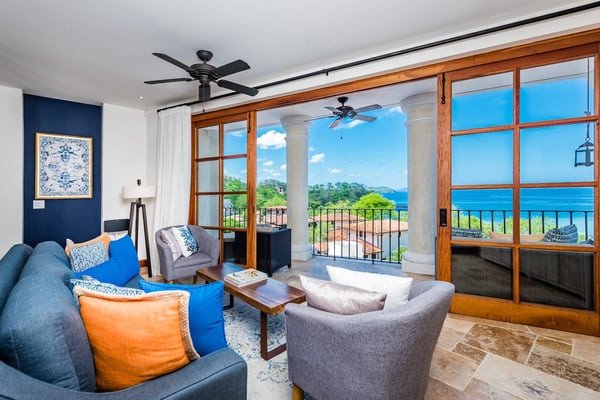 Nearby construction may result in noise disturbances. For further details on how this might affect your stay, please reach out to a villa specialist. Nestled in the heart of the charming coastal town of Las Catalinas, Costa Rica, this exquisite flat offers an idyllic retreat for those seeking luxury and comfort. Situated on a single floor, this residence boasts a contemporary design and panoramic views of the town and the mesmerizing ocean. The flat is adorned with ample natural light, creating a vibrant and welcoming atmosphere. Each bedroom is generously sized, ensuring comfort and privacy, while the four bathrooms provide convenience for all guests. The building also has an elevator for easy access. With a maximum occupancy of 7 people, this home features three thoughtfully designed bedrooms to ensure a restful stay. The master bedroom offers an elegant escape with a king-sized bed and a full bathroom featuring a stand-alone shower while offering breathtaking ocean views. The second bedroom, also a primary, features a king-sized bed, a full bathroom with a stand-alone shower, and a partial ocean/partial town view. The third bedroom, a cozy bunk room, offers a bunk bed, a queen-sized bed, and a single-sized bed, providing a delightful view of El Prado. An open living room seamlessly blends with the modern kitchen and dining area, creating a perfect space for socializing and relaxation. The kitchen, with its ocean view, is fully equipped and complements the stylish dining area, which accommodates six guests. A covered balcony extends from the living room, featuring a rattan sofa—a perfect spot to unwind while enjoying the surrounding beauty. So, whether relaxing on the terrace or entertaining in the living space, every moment in this Las Catalinas flat is a celebration of luxury and tranquility.