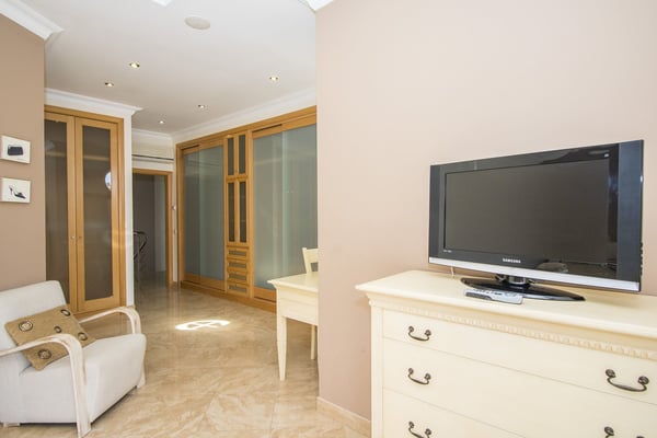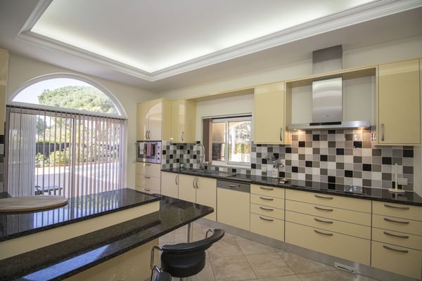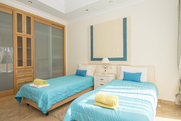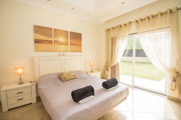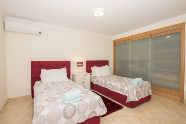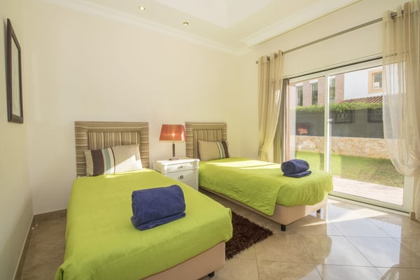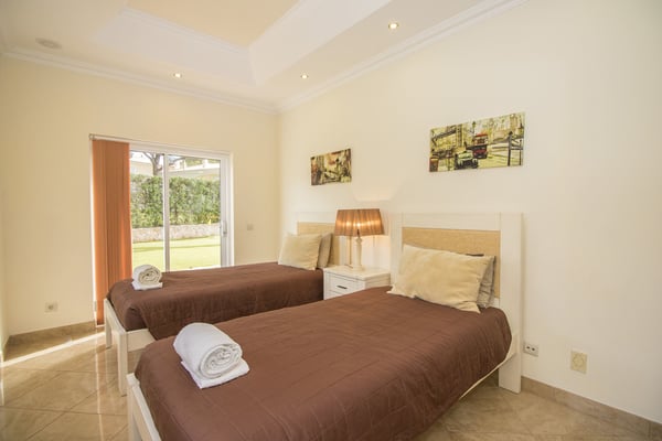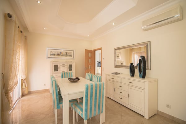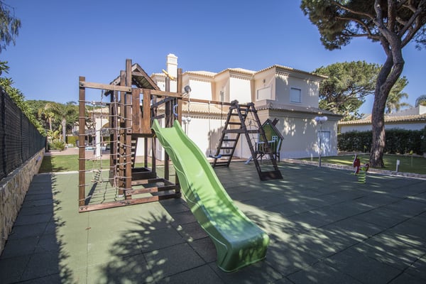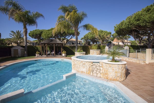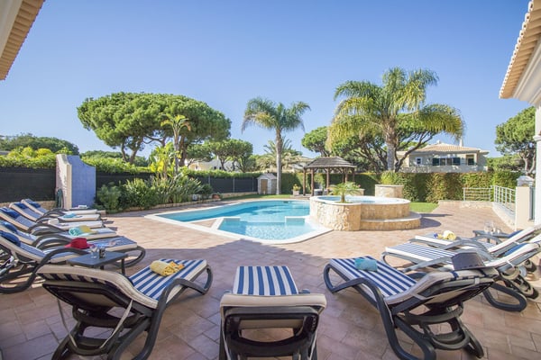 Enjoy the lush beauty of the surrounding Pinhal golf course whilst relaxing at this well-equipped villa that features outdoor Jacuzzi, cinema and game room and is just 20 minutes' walk from the bustling Vilamoura marina. The property has six bedrooms, all air conditioned and six bathrooms (one with a bathtub and five with a shower) and a further separate WC. The large and well-equipped kitchen features granite countertops, quality appliances and a large built-in oven and includes a capsule coffee machine and a water purifier. The kitchen has access to the pool area and a door that leads directly to the barbecue. The living room has excellent natural light throughout the day and is furnished with leather seating and plush pillows and has a TV above the gas fireplace. The dining area has an extendable dining table and the whole area has sliding windows facing the pool. Further facilities downstairs include a laundry room with a washer dryer, a games area with a pool table, table tennis table, table football and even a small zone to do some exercise. The air-conditioned cinema room has a sofa with chaise longue and several beanbags. The house has a built-in sound system in the living room, bedrooms and some bathrooms. Outside guests can unwind whilst enjoying the climate of the Algarve surrounded by palm and pine trees. There is an outdoor pool which is approximately nine meters long by five wide and 1.4 metres deep at the deep end. Besides the main pool, there is a smaller pool only 80cm deep, perfect for smaller children. The bubbling outdoor Jacuzzi with waterfall and many powerful jets is perfect to help with the rest and relaxation! Facing the swimming pool is a wooden deck with outdoor furniture, shaded by a wooden pergola with a straw roof. Sun loungers are available as well as a large outdoor rattan table with a glass top and chairs. Next to the outdoor dining table, there is an external speaker which is connected to the house sound system. Next to the kitchen lies the built-in charcoal barbecue, a sink and a coffee table with chairs. In the back of the garden, there is a putting green and playground with a rubber floor, equipped with a slide, swings and a wooden house which makes a perfect play area for the younger guests at this villa.