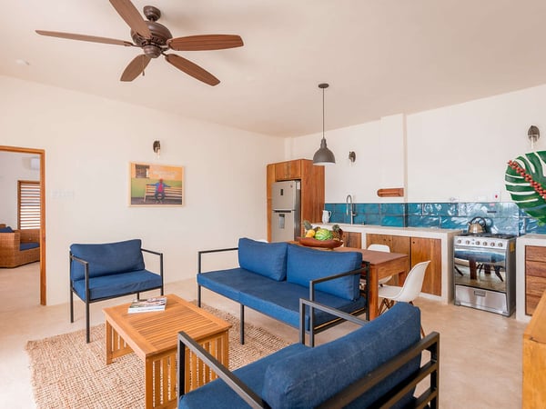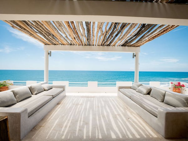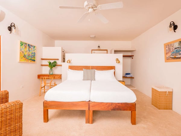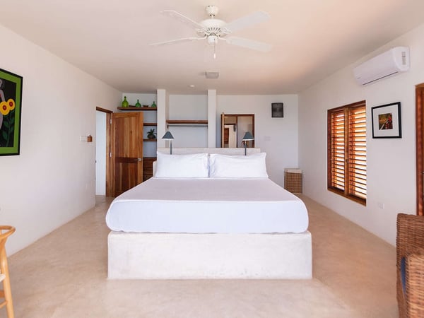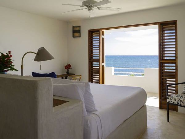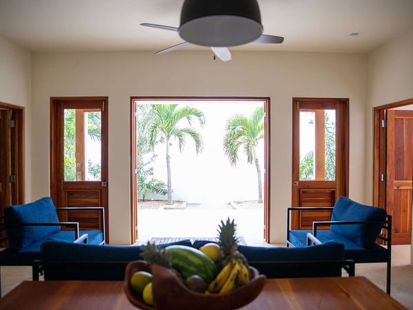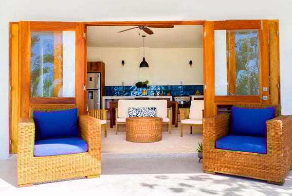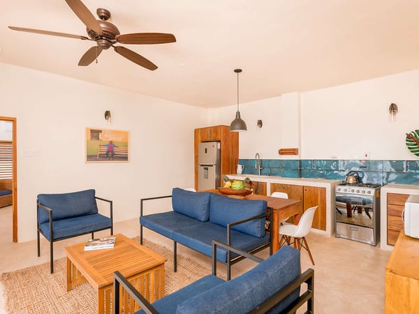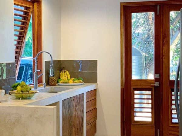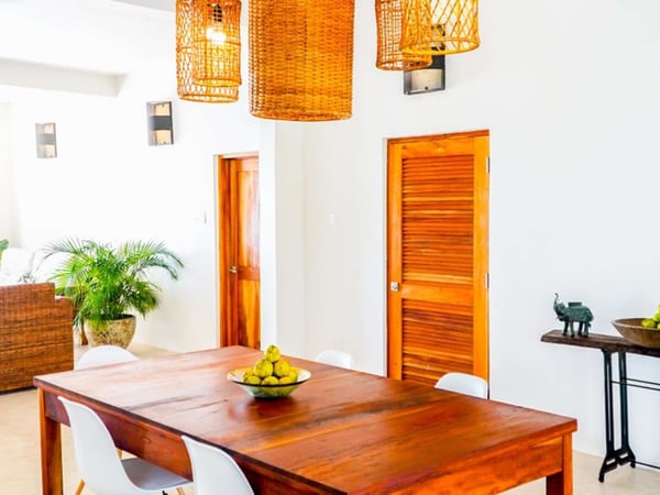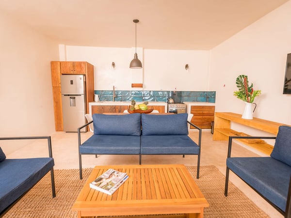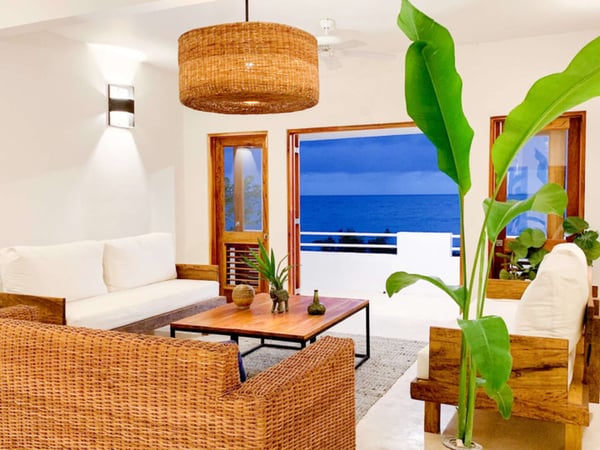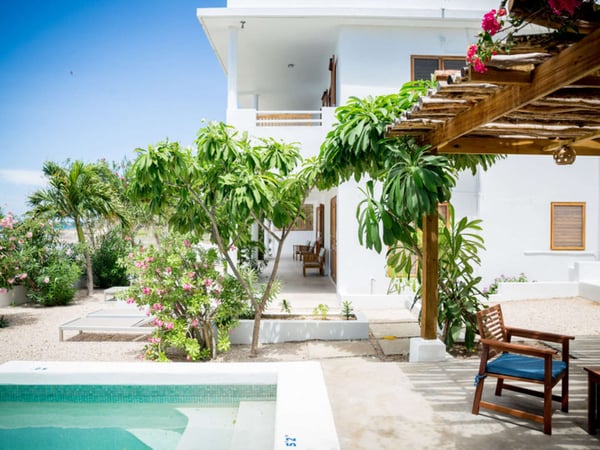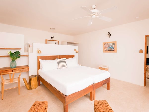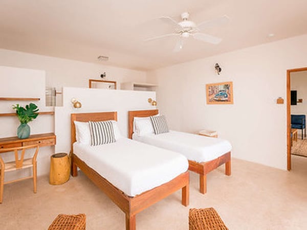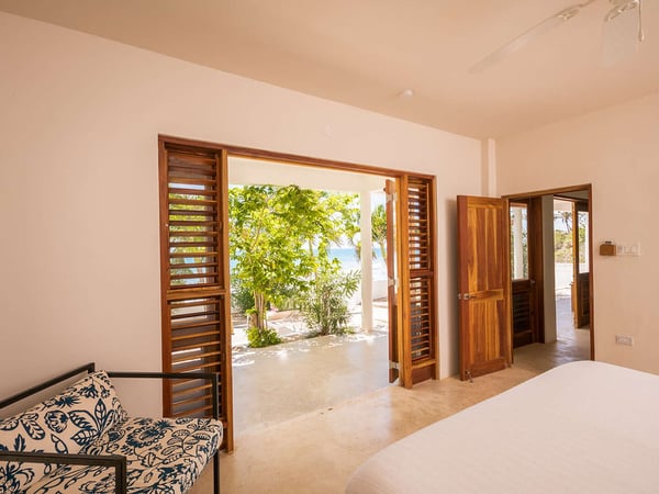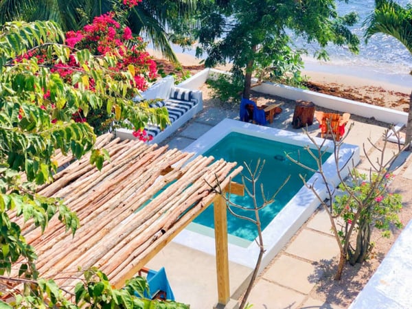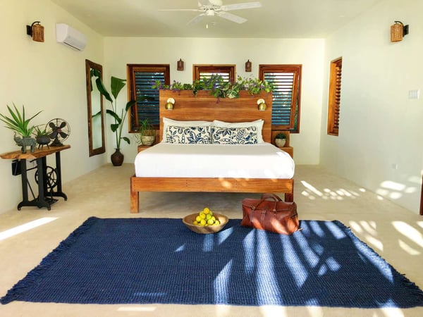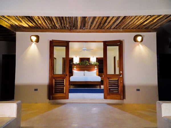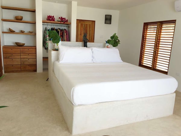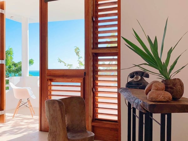 A unique sunset graces each evening sky. Morning swims. Feeling alive and energized, calm and relaxed all at the same time. The South Coast spirit draws you into a new sense of harmony and escape. Kotch’s expansive sea views from every room. The flow of natural energy that follows each swaying palm. It simply takes you away. Kotch’s three levels and five bedrooms are perfect for a family & friend get-away with lots of social spaces to gather or private nooks for retreat. Kotch can be lived in as an entire house or by suite. We say “lived in” because that’s just what it is – a place to live in – even if just for a little while. Each floor has its own kitchen, bedroom space and outdoor terrace. It’s easy to feel free and at ease when you have super comfy and convenient amenities at your fingertips, not to mention attentive staff there to show you the ropes and introduce you to the community. There are lots of cozy corners and sweet spots to chill – under a Neem tree, next to a Dessert Rose blossom, on the beach or beside the pool. Depending on the time of day, you’ll decide which one suits the moment. Discover our great little hangouts and social spaces to have a chat or good meal, play a game, read a book or take a nap. Kotch’s modern-tropical design creates the ideal conditions for the area’s climate and temperatures to work for you, not against you. Rippled wooden-beam pergolas and plush trees create shade over the patio areas and keep the sun at bay, while large wood-louvered swing doors open up living and bedroom walls inviting in a cross breeze that courses through the house. Our rooms’ clean neutral interiors make the outside landscape the focal point, like a painting on a canvas. We have our own wood and welding shop where we make handmade furniture and home fixtures. Working with local carpenters and welders, we design and then re-design each piece until it is the perfect size, shape, texture and colour. Our wood is sustainably sourced from our own private lands and the dolomite in our flooring comes straight from our own quarry. From floor to ceiling, we’ve thought through every detail and creative touch, including conveniently-placed electrical sockets, cozy oversized armchairs, ample closet space, and lush beds that always face the sea. Each room is a lovingly-crafted combination of ultra-modern minimalism with antique touches and the occasional quirky painting.