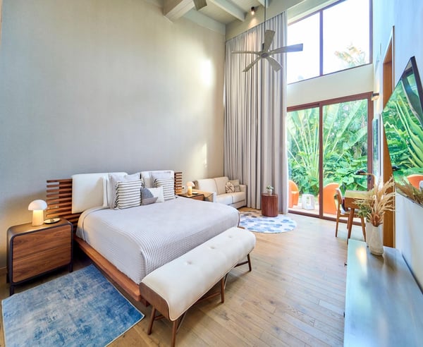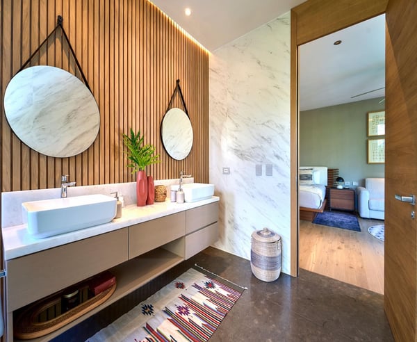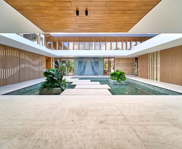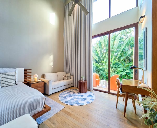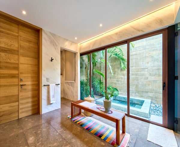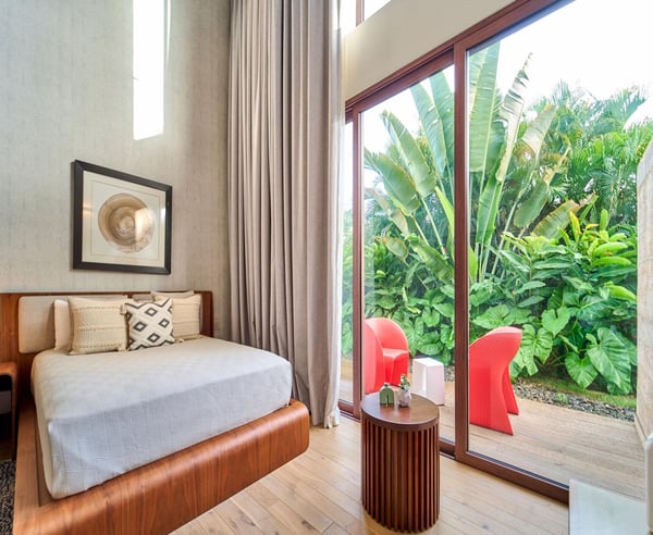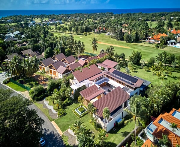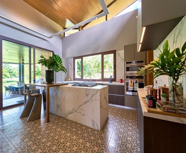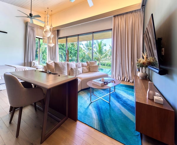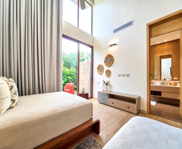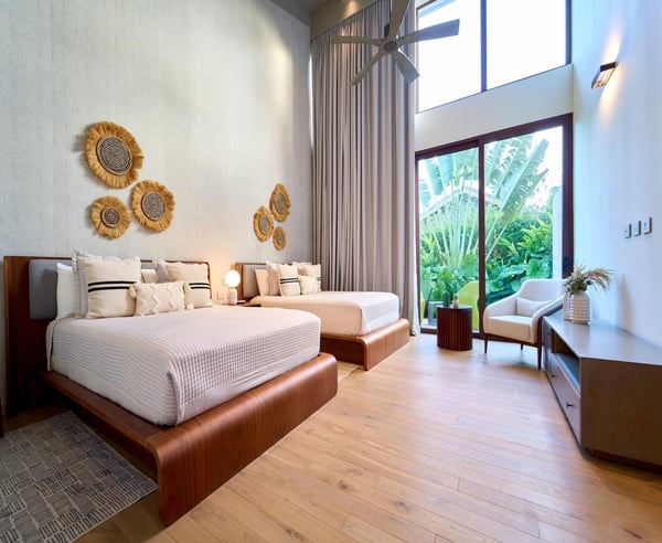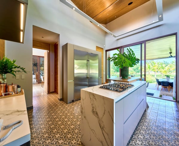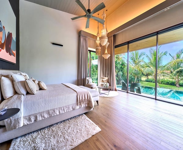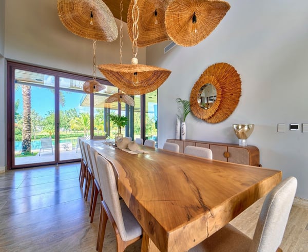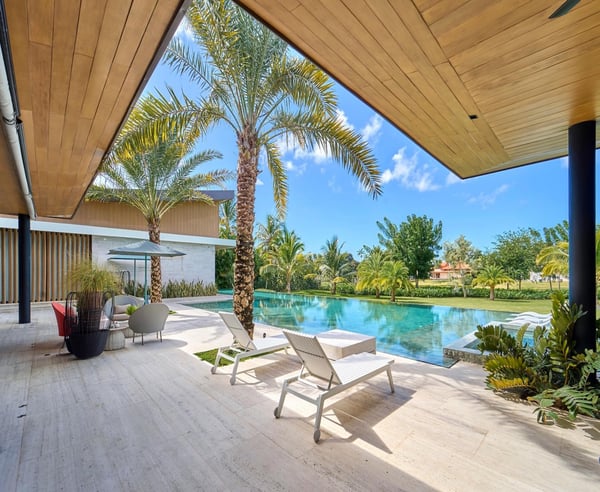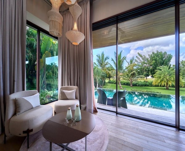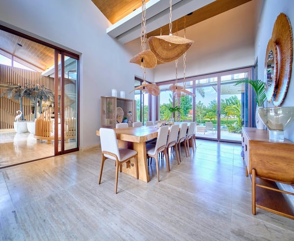 All guests must register with the Casa de Campo Concierge office, and for a small daily fee ($30 per adult per night & $15 per child per night), are granted access to resort areas and amenities. Casa de Campo Resort facilities and amenities include golf courses ($), the fitness centre ($), racquet center ($), restaurants ($) and bars ($). Contact Rental Escapes for more information about pricing. This stunning single-story villa is a masterpiece of contemporary design, seamlessly blending avant-garde architecture with the natural surroundings. The minimalist yet cozy space is flooded with natural light and perfectly positioned to showcase breathtaking views of the 5th hole of the La Romana Country Club golf course. At sunset, the villa’s 30-meter-long swimming pool becomes a captivating focal point, while the spacious heated jacuzzi invites you to unwind and relax in ultimate comfort. The villa features five luxurious bedrooms with double-height ceilings and warm wooden floors, designed to maximize both comfort and connection with nature. Each room includes a walk-in closet, a private bathroom with lush interior gardens, and terraces with direct access to the garden. Three of the bedrooms also offer outdoor showers for a unique and refreshing experience. The layout includes three bedrooms with king beds and sofa beds, and two bedrooms with two queen beds, all equipped with air conditioning and ceiling fans for added comfort. At the heart of the villa, the dining room features an impressive wooden table for 12, surrounded by lush vegetation and offering direct views of the pool. This air-conditioned space is the perfect setting for memorable meals with family and friends, blending elegance with tranquility. This villa is more than just a home—it’s an architectural masterpiece that balances modern design, functionality, and harmony with nature. Every detail has been crafted to create a space where unforgettable moments unfold effortlessly.