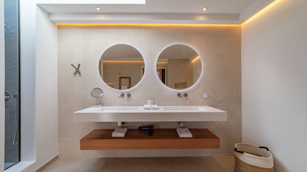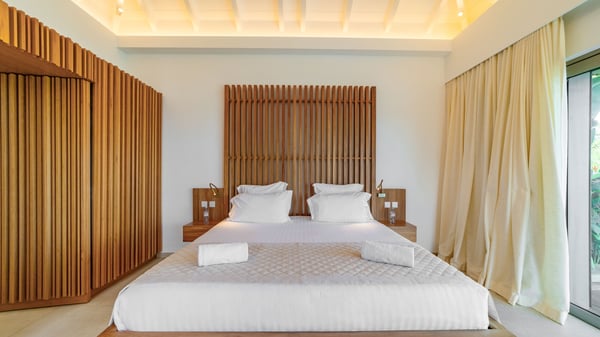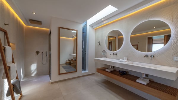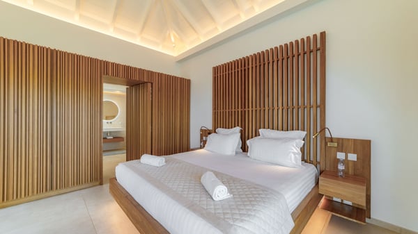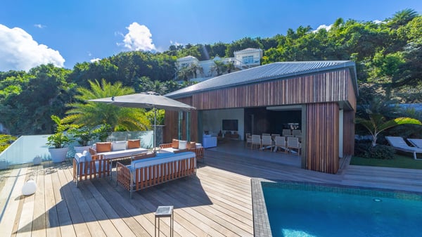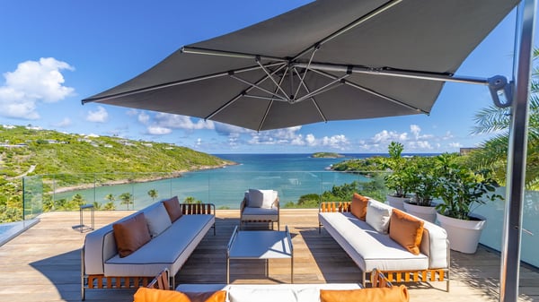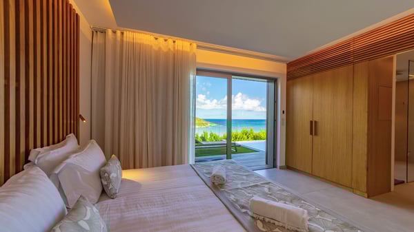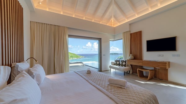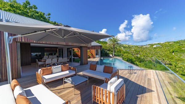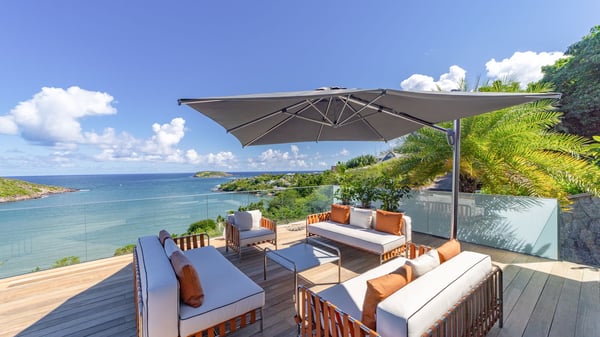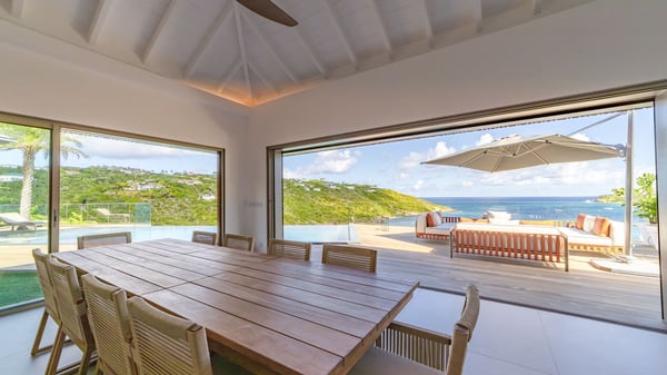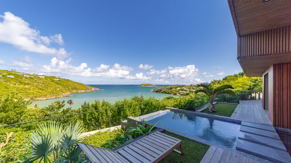 The villa St-Barths Riva is a beautiful four‑bedroom property with two swimming pools, ideally located in Marigot facing the bay. Spacious and filled with natural light, this luxurious St‑Barths villa offers high‑end amenities and noble materials in an intimate and welcoming atmosphere, the perfect place for an unforgettable stay for eight guests in St‑Barths. Built on several levels connected by exterior staircases, the villa St‑Barths Riva opens onto the majestic spectacle of the island’s turquoise waters framed by lush vegetation. Fully open onto the terrace with a pool, the living room features sofas, a flat‑screen TV, and a coffee table in a soft ambiance. The indoor dining area accommodates up to 10 guests next to the fully equipped kitchen with a central island, dining space, and stools. The openings onto the front terrace with ocean view and onto the side garden bring in a soothing light, illuminating the poetic and comfortable decor of this vacation villa. At the front, the terrace of Riva offers the majestic view of the crystal-clear ocean, a breathtaking landscape you’ll love admiring from the outdoor lounge with sofas and armchairs shaded by a large parasol. The pool sparkles under the St‑Barths sun, facing the ocean and the perfect horizon. On the side, the terrace features deckchairs among palm trees, a paradisiacal setting ideal for rest and relaxation. And a second pool is located on the lower level near the bedrooms, in a very private atmosphere and idyllic setting. The villa St‑Barths Riva consists of four air‑conditioned bedrooms with en‑suite bathrooms spread across the property. The master bedroom with a king‑size bed is on the main level and has an additional outdoor shower as well as a terrace with a deckchair facing the view. The three other bedrooms with king and queen‑size beds are on the lower level, accessible via an exterior staircase and a small path. They are connected by an outdoor corridor and offer a true immersion in Caribbean nature with the ocean as backdrop, a setting enhanced by the second pool sparkling under the Caribbean sun. Ideally located in Marigot, the villa St‑Barths Riva is the perfect place for a fantastic vacation for eight guests in the Caribbean.