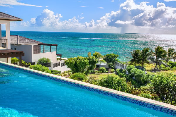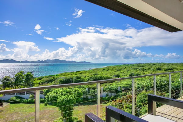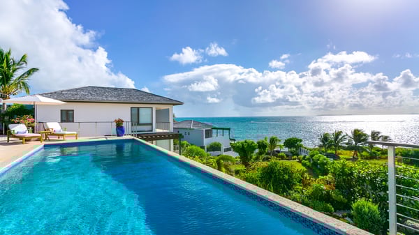 Situated on the south coast of Anguilla, in Lockrum, Villa Odyssey is a modern, four-bedroom luxury retreat offering breathtaking views of a secluded beach cove and the mountains of St. Martin. As one of three villas on the Kamique estate, it's just steps away from a private stretch of pristine white sand, complete with cushioned loungers, a shaded daybed, and a gazebo. The surrounding waters, protected by a reef, provide calm conditions perfect for snorkeling. The Anguilla villa rental features a beautiful infinity pool, perfect for swimming or relaxing. Two outdoor showers provide access to sunlit and shaded areas with views of the clear Caribbean waters. A gas grill is available for enjoyable outdoor dining. Inside, the villa includes a home entertainment system and Wi-Fi. Villa Odyssey's interiors blend modern elegance and island charm, featuring rich woods, stone, and concrete. The design creates a sensual yet contemporary atmosphere with a touch of tropical romance. The ambiance seamlessly blends indoor and outdoor spaces, orchestrating light and shadow to create peaceful oases. The first primary bedroom is located upstairs and features a private bathroom with a freestanding bathtub, indoor and outdoor shower options, and dual sinks. The room has AC, a ceiling fan, and a television. Step outside onto the furnished terrace and enjoy the stunning sea view, with the distant island of St. Martin as a backdrop. The second primary bedroom is also on the upper floor. It includes an en-suite bathroom with a soaking tub, indoor and outdoor showers, and a double vanity. Modern comforts like AC, a ceiling fan, and a television are provided. Guests can relax on the private furnished terrace while enjoying the beautiful sea view and distant glimpse of St. Martin. Situated on the lower level, the third bedroom offers an en-suite bathroom complete with a soaking tub, shower, and dual sinks. This room includes AC, a ceiling fan, and a television. Step outside onto the furnished patio to enjoy the ocean view. This bedroom shares a connecting door with the fourth bedroom. The fourth bedroom is also located on the lower level. It features a private bathroom with a shower. The room has AC, a ceiling fan, and a television. This bedroom provides direct outdoor access and shares a connecting door with the third bedroom. The villa features an outdoor play area on artificial turf and a natural grass area for playing kickball or croquet. This area includes an entertainment space with sofas, a bar, a fire pit, beach stools, and an outdoor screen with a projector for movie nights. For those with extra energy, beach bocce and tetherball are available, or guests can swim in the waters behind the villa, protected by a natural coral reef. Villa Odyssey is conveniently located near the beach and ocean with its renowned neighbor villa, the Triton Villa at Kamique Villa, the town and grocery stores, and the Aurora Resort and Golf Club. Close to Sandy Ground, known as "the entertainment capital of Anguilla," it transforms from a tranquil village during the day to a lively hub at night with imaginative beach bars and nightlife spots. History enthusiasts can visit the Heritage Museum or the Amerindian Ceremonial Site to glimpse the island's rich past.