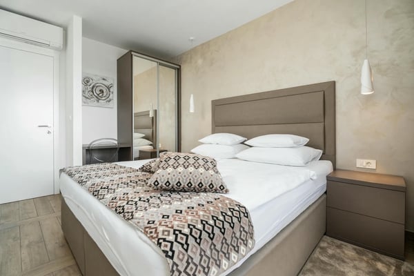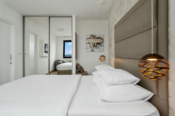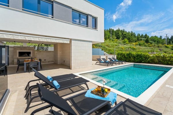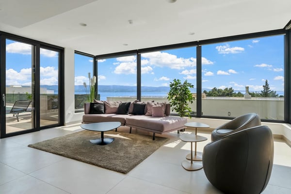 This fabulous villa to rent in Omiš is situated right on the Adriatic coast, with spectacular sea views. The location is just a 2 2-minute drive to the town center, where you will find a bakery, supermarket, restaurants and a number of cafes/bars. Villa Fortica is also just above the other beautiful Villa Mirabela, so two of the villas can be rented together - the perfect option for large groups of family and friends. Omis is a picturesque town with a true Mediterranean atmosphere, located at the estuary of the Cetina River, just 21 km from the largest Dalmatian city of Split. The Cetina River and its magnificent canyon, a beautiful mountain in the background and a mile-long sandy beach make this part of the Adriatic coast unique and incomparable. Because of the unique location, surrounded by steep cliffs, the river and the sea, the town of Omis can be extremely proud of its extraordinary characteristics, which are impressive to say the least. A little further afield is the bustling and vibrant city of Split, which combines history and culture with modern entertainment and a fabulous nightlife. This modern villa has been designed with fantastic flair inside and out. It boasts a truly urban appearance and is surrounded by unspoiled greenery. What a setting with its wonderfully undisturbed views of the sea and nature! The villa is located on a property with a total area of 400 m². The villa itself has an area of 280 m² and extends over three floors: lower ground floor, ground floor and first floor. Villa Fortica has 4 bedrooms, one smaller room with a sofa, 5 bathrooms and accommodates up to 8 people. You are sure to notice the attention to detail both inside and out with the villa's unique architecture and stylish design. Access to the villa is direct from the coastal road to the main entrance on the ground floor. On the ground floor, you will find a large open-plan living and dining area with a modern and fully-equipped kitchen and floor-to-ceiling windows which open out onto the terrace and swimming pool. On the lower ground floor, there is an air-conditioned gym, shower room, sauna and a smaller bedroom with a sofa bed and TV. The first floor of the Villa Fortica is connected by stairs from the living room. The first floor features four spacious en-suite bedrooms with a bathtub and shower, complete with a flat-screen TV. Two of the bedrooms have shared spacious terraces with lounge furniture to enjoy sea views. For those looking to relax, lounging by the outside private heated swimming pool or the beautifully landscaped sun terrace is ideal. On this terrace, you will find peace and quiet, which will enable you all the pleasures of enjoying a morning cup of coffee while listening to the romantic melody of the sea. The warm evenings will reveal the exceptional beauty of romantic sunsets, which only nature is capable of creating. Whether you are relaxing by the pool or enjoying gourmet delicacies from the outdoor grill, this is an experience that you'll remember for a long time. You will surely be eager to come here again.