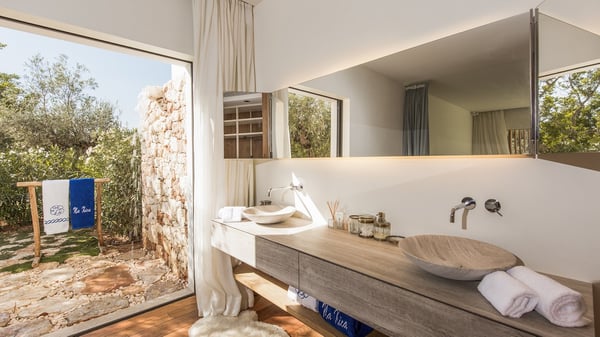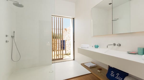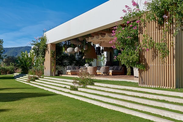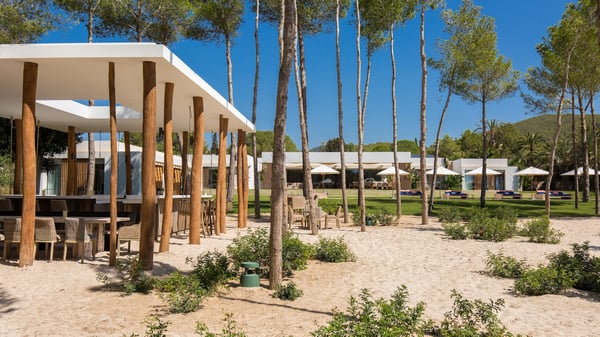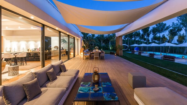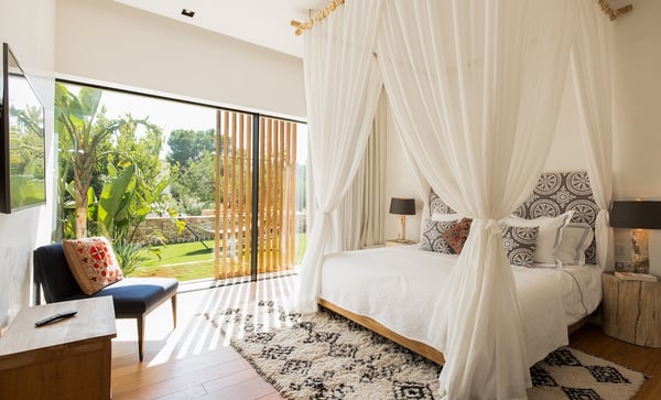 This stylish Ibizan villa occupies a secluded spot between San José and the beach of Cala Jondal and its famous Blue Marlin beach bar. Villa Eden's sleek straight lines and low rooflines are softened by the tall palms and pines that surround the property to create a feeling of exclusive privacy. Glimpses of the blue Mediterranean flash through the trees and sculptured lawns line the 25-metre infinity pool, which draws its water from the property’s own well. The pool, which can be heated during the winter months, is the centrepiece of this property and each room features sparkling pool views. Beyond the pool, the manicured grounds hide contemporary artworks, a large jacuzzi for up to ten people surrounded by shady palms, a pétanque pitch, and Villa Eden’s unique outdoor cinema. The exterior terrace boasts wide corner seating and an extended dining table with views across the pool to the silvery sands which are Villa Eden’s other al-fresco lounge area. This white sand beach under tall pines features a professional bar and seating for up to 30 people. Inside this villa, quirky contemporary styling and polished natural wood floors lift the modern design to creates coziness and warmth within the bright modern interior. Each bright, airy bedroom maintains guest privacy, and each has a modern en-suite with the same original blend of natural materials and high-end design. The master en-suite includes a shower, bath, Hammam, and private access to the jacuzzi and a private chill-out area. A stylish and contemporary approach to the Ibizan super villa. License Number: 2017004801
