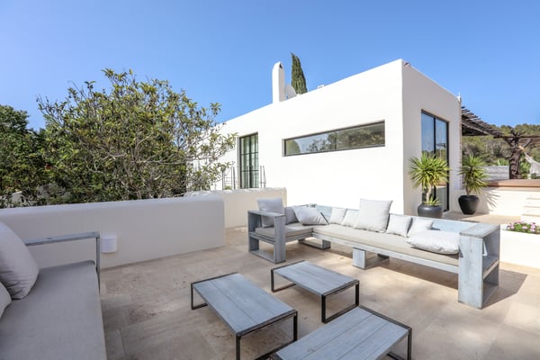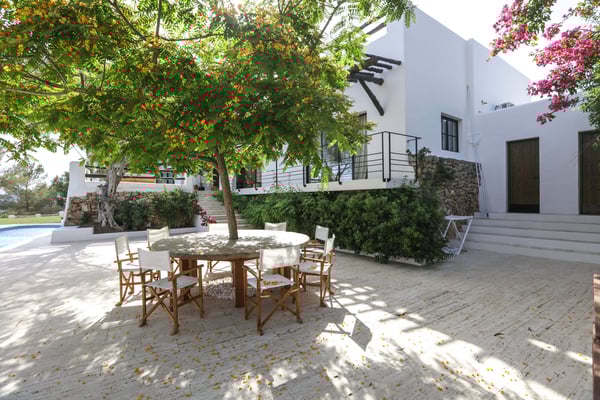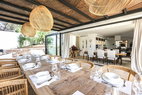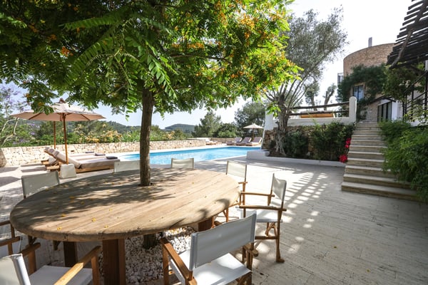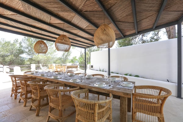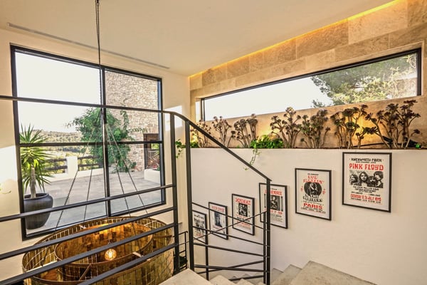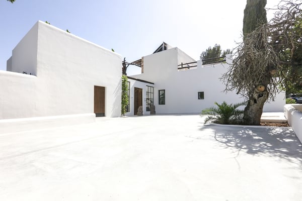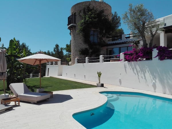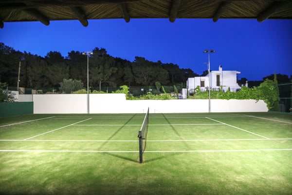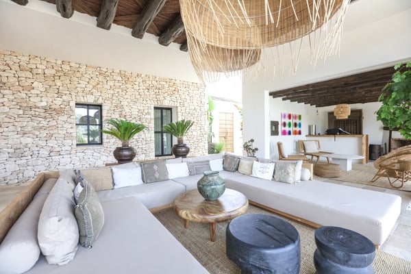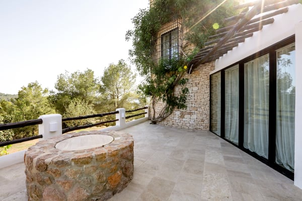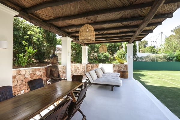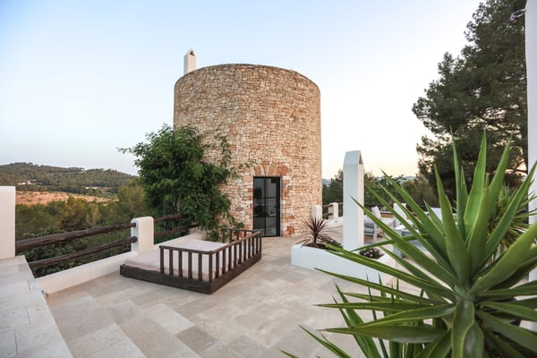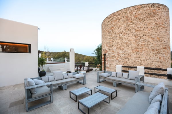 Can Gerbera is a luxurious dream residence Near Ibiza Town. Nestled just 8 to 10 minutes from the vibrant heart of Ibiza Town, Can Gerbera epitomizes luxurious living. This dream villa is a haven of elegance and sophistication, offering unparalleled amenities designed to delight and inspire. At the core of Can Gerbera lies its exquisite kitchen, a sanctuary for entertaining and accommodating large gatherings with ease. Floor-to-ceiling sliding windows open to breathtaking views of verdant farmlands on one side and seamlessly connect to the indoor and outdoor dining patios on the other. These spaces lead to a fully equipped outdoor kitchen, lushly manicured gardens, expansive lawns, a shimmering pool, a professional tennis court, and a refined pavilion. Adjoining the main kitchen is an expansive chef’s pantry, thoughtfully outfitted with a second dishwasher, an additional oven, a third sink, two refrigerators, a tall freezer, and an impressive wine fridge. It is a space meticulously designed for hosting and catering on a grand scale. From the kitchen, step into the ground floor’s architectural stone tower, where you’ll discover a striking circular home theatre and living room. This unique space, with its soaring double-height ceiling, plush furnishings, and grand fireplace, has been curated exclusively for indulgent comfort and relaxation. Centrally located within the villa is a magnificent covered summer lounge. This expansive room features a sumptuous U-shaped sofa, perfectly positioned to frame the villa’s awe-inspiring views. Adjacent to the lounge is an elegant annex building, home to a sophisticated bar and lounge area. Here, a professional-grade drinks fridge, ice maker, and sink ensure every gathering is a seamless celebration. Can Gerbera boasts a cutting-edge Loxone Domotic system, delivering effortless control of 10 audio zones, air conditioning, underfloor heating, lighting, a centralised alarm, and even front gate access—all via a convenient app or in-house iPad controls. For added luxury, every faucet and shower benefits from a de-calcification water softening system, while an advanced osmosis system guarantees pure, crystal-clear drinking water and ice. Every detail of Can Gerbera has been designed to create an exquisite blend of modern sophistication and timeless elegance, offering its residents an extraordinary lifestyle of ease and opulence. License Number: ETV-1187-E