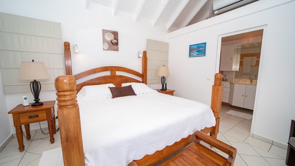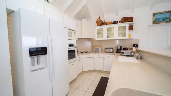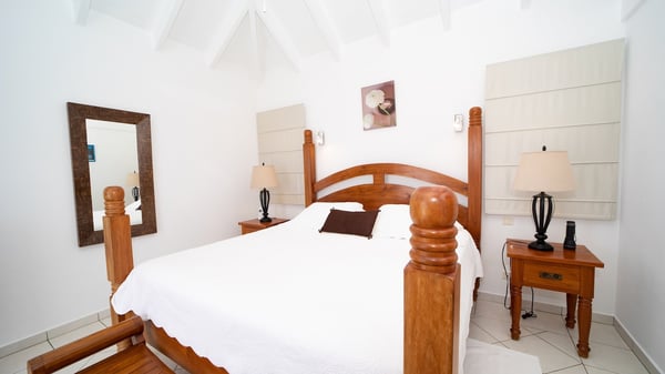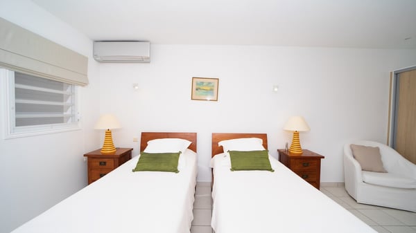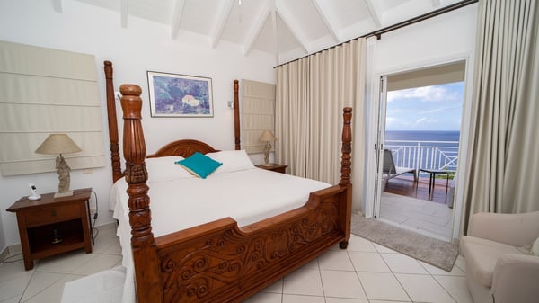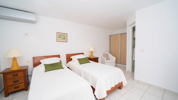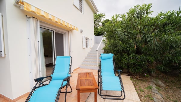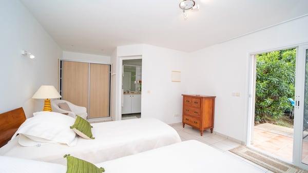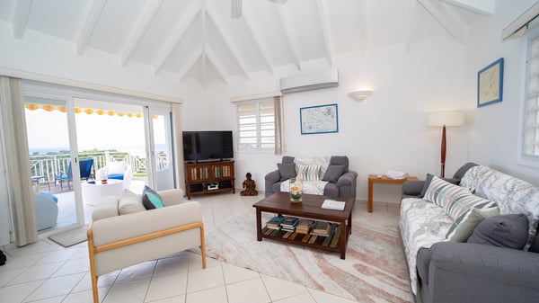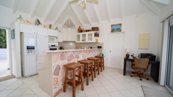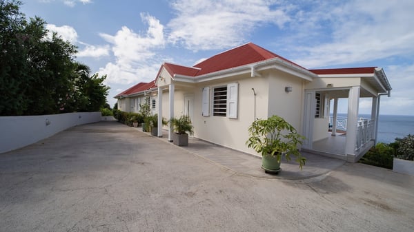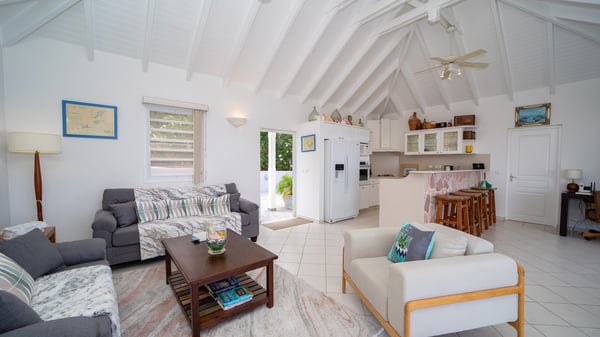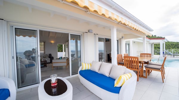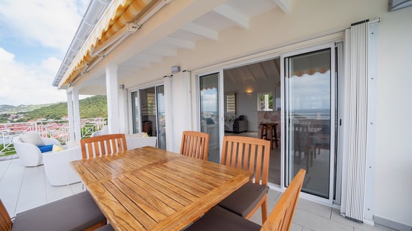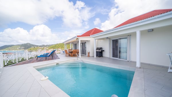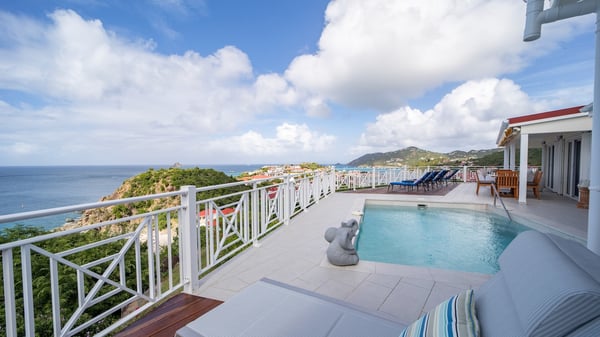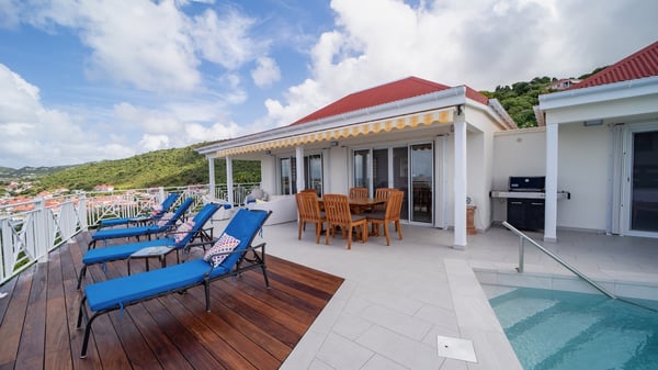 The vacation villa Grand Galet in St-Barths is the perfect place for an idyllic Caribbean vacation with friends or family. Ideally located in Lurin only a few minutes from Gustavia and the beach, this charming home faces the ocean, Shell Beach and Gustavia Harbour. Built-in a typical and Caribbean style, this elegant property has been renovated to be fully air-conditioned while conserving the essence of the island's creole huts. As soon as you come in, the airy and open-plan living room offers a spacious and welcoming lounge opening onto the terrace and the stunning view. A very nice kitchen is well equipped to prepare and cook meals, with a breakfast bar and stools, an ideal set up for snacks or talk over a coffee or a drink. On the expansive and sunny terrace of villa Grand Galet, there is a beautiful swimming pool surrounded by lounge chairs facing the breathtaking view and the tropical environment. The glorious spectacle of the splendid sunsets of St-Barths is strikingly beautiful. The covered outdoor dining area can accommodate up to six guests for succulent outdoor barbecued meals, while an outdoor lounge space with sofas and soft cushions is set up for relaxing in the gentle trade winds. This charming St-Barts vacation home has three spacious, air-conditioned bedrooms with en-suite bathrooms and ocean views. Two of them have king-size beds, and the third one has twin beds that can be converted into a king. Two bedrooms are located on the main level and open onto the terrace, while the third one is located on the lower level with a private terrace and a small view over the ocean and tropical garden.