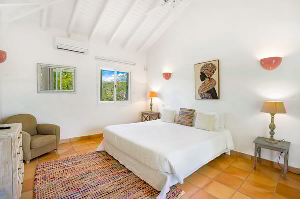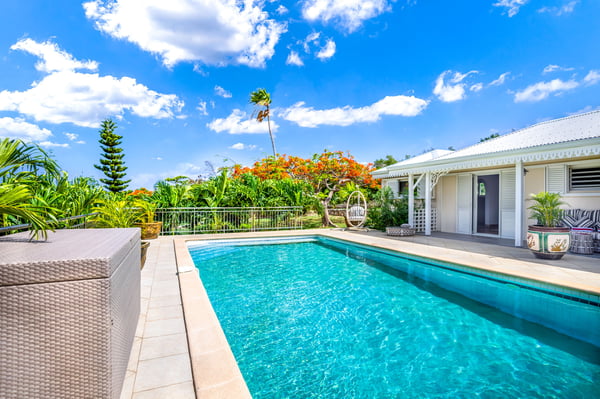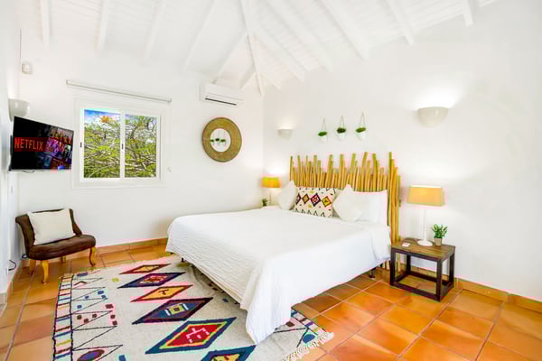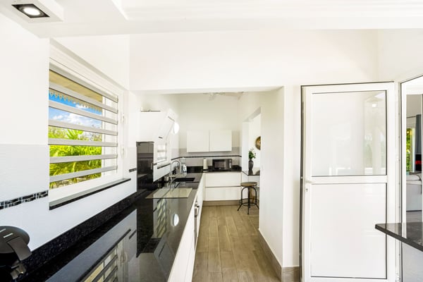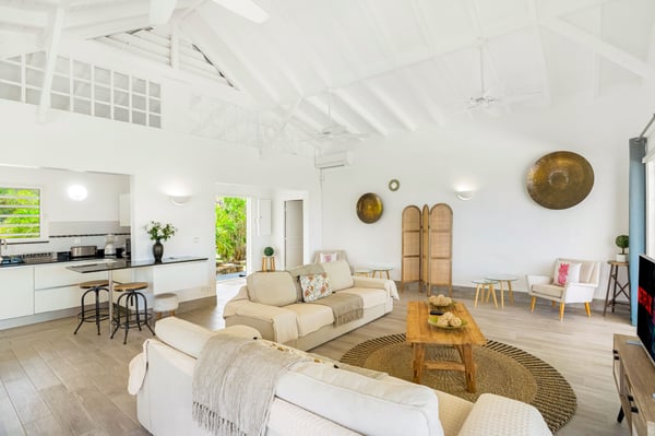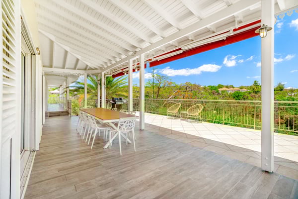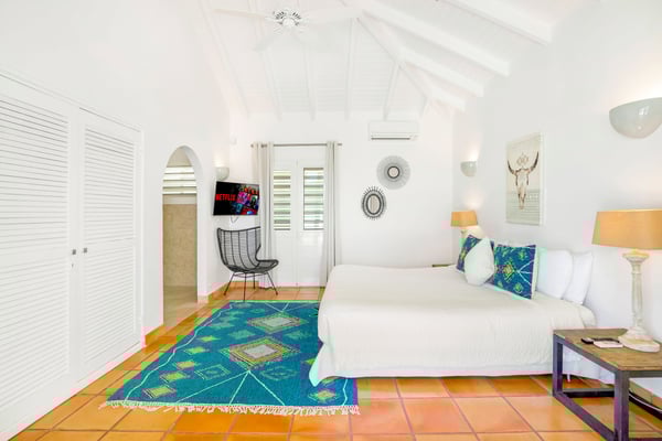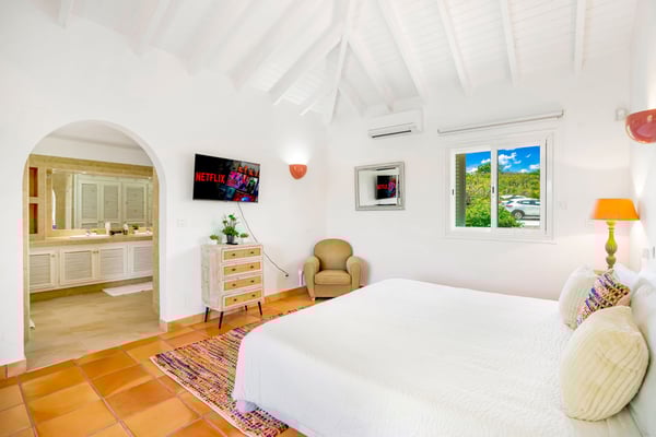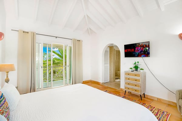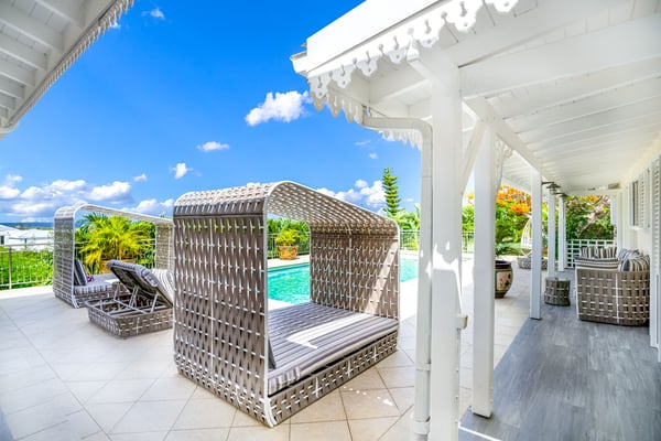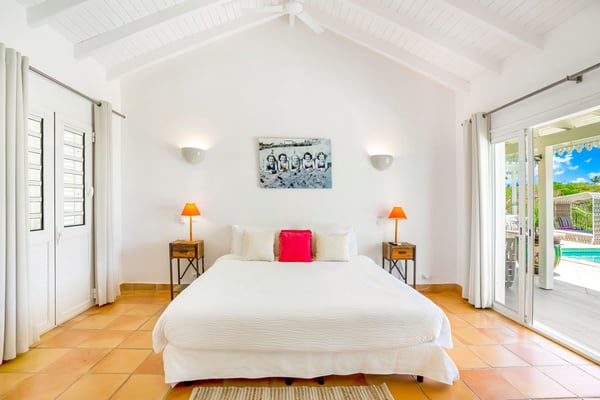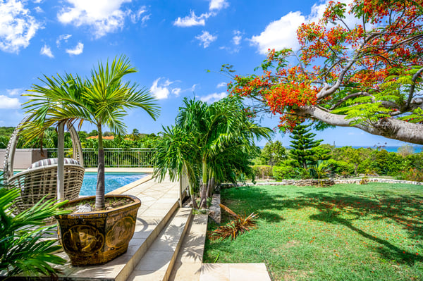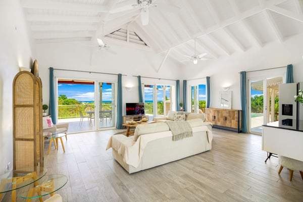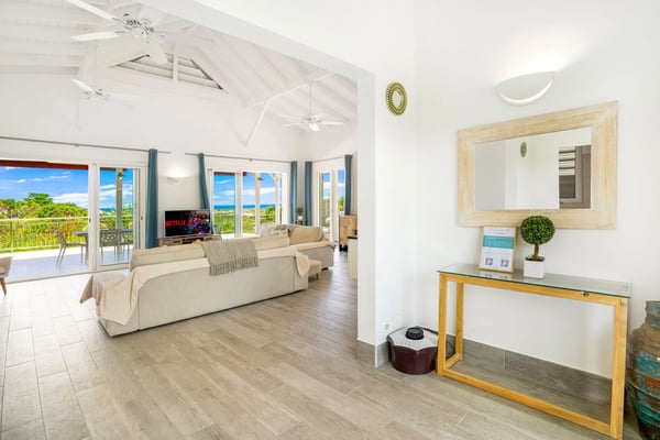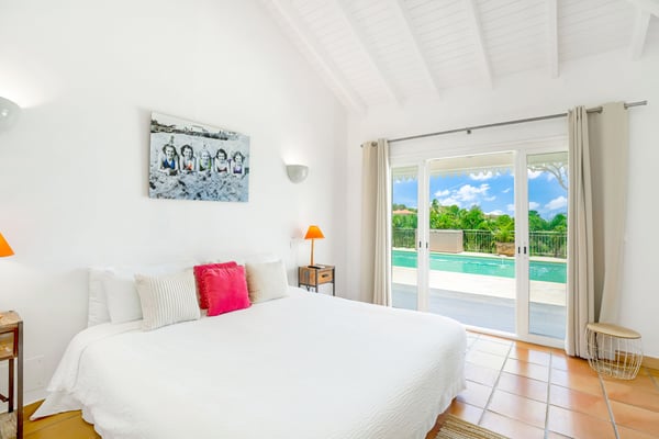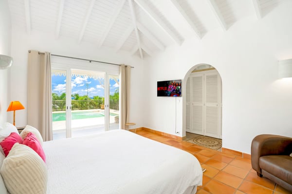 Madras is a luxurious Caribbean villa situated in Terre-Basses, a private gated community area in French St Martin. As you enter the villa and out to the terrace, the richly variegated scenery expands into a panoramic view filled with a profusion of colour and texture. The blues of the Caribbean and tropical sky are accented by white clouds. Below are the elegant villas and gardens of Terres Basses. At dusk, brilliant sunsets create colourful backdrops for evening entertainment. This newly renovated four-bedroom property is located in the heart of the exclusive Terres Basses area and within a few minutes walk of the beautiful beach of Plum Bay. All the bedrooms have a king bed, a ceiling fan, air conditioning, and a large en-suite bathroom. The living area is air-conditioned and has U.S. satellite Television. Outside the great room are spacious exterior areas for relaxing, dining al fresco, and swimming. Inspired by the view’s shades of blue, the stunning custom pool. Surrounding the pool are plentiful spaces to lounge, relax, and enjoy the view and sun. The Lowlands are the location of some spectacular beaches: Baie Longue and Baie aux Prunes (Long Beach and Plum Beach) are secluded, have public parking, but no services. Neither beach is ever crowded. Baie Rouge is set amongst some dramatic red cliffs. The elegant homes in Terres Basses are sitting on generous lots, most of them with gorgeous views of either the Lagoon or the ocean, or both. By car it's about 10 minutes away from Marigot, and 15 minutes away from the Airport.