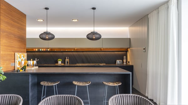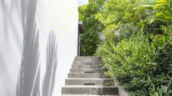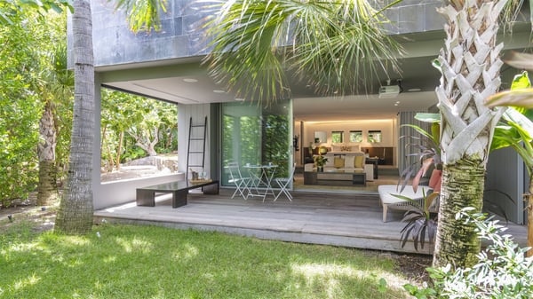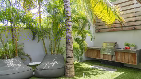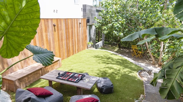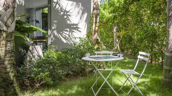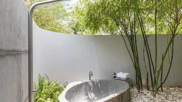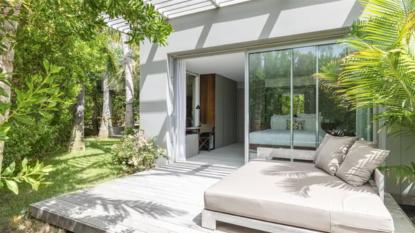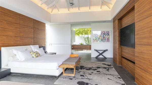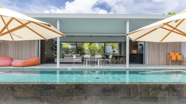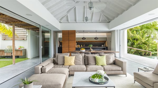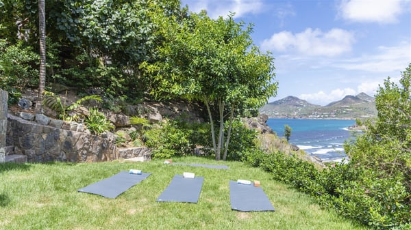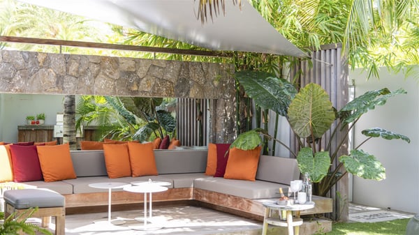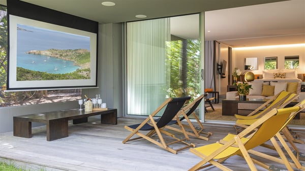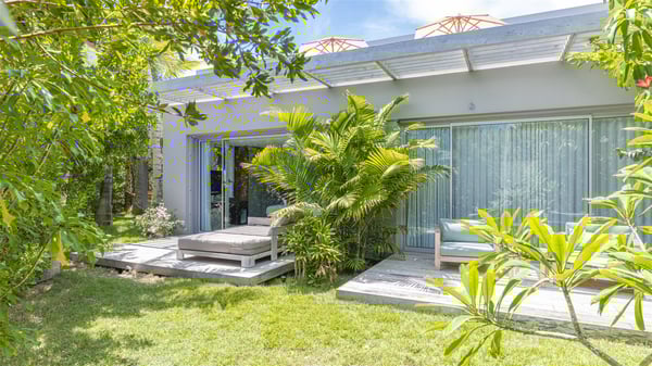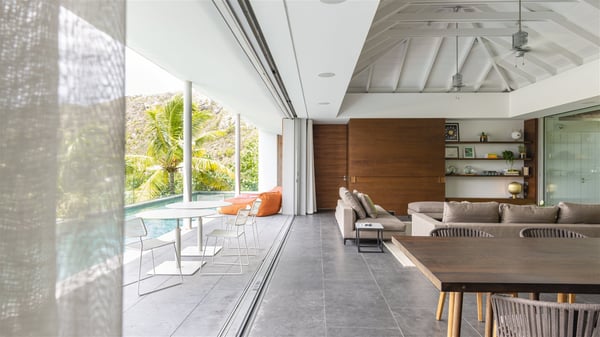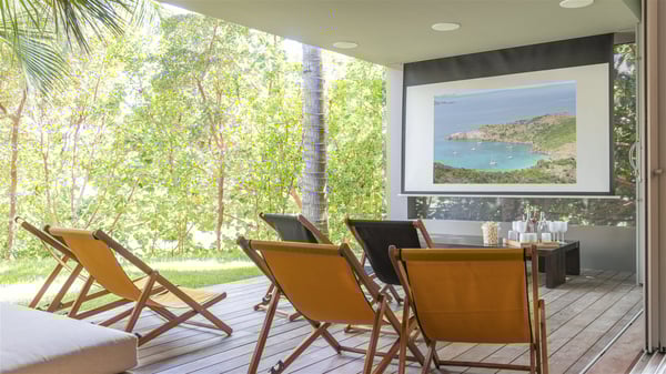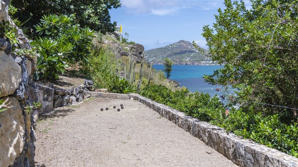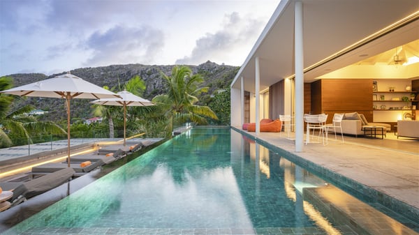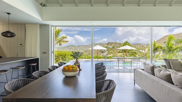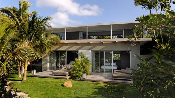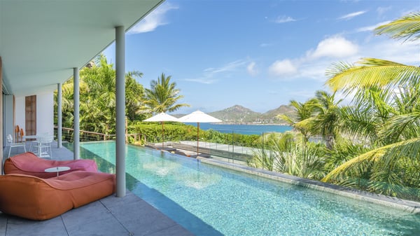 The vacation rental villa Bakea is a contemporary property located on the heights of Anse des Cayes in front of beautiful hills and ocean views. Surrounded by a tropical garden and gently blown by the trade winds, this vacation home with a heated swimming pool welcomes groups of up to eight people in utmost luxury for an unforgettable stay in St. Barths. Built over two levels, Villa Bakea was built in a modern architecture and a sleek decor. Under the high vaulted ceilings, the spaces are bright in a refined decor. Furnished with large sofas and coffee tables, the living room is swept by the island’s mild air and opens onto the terrace with a pool Through the bay windows, guests can admire the vegetation of St-Barths’ rolling hills. The dining room which can accommodate eight guests is located in the same open space close to the well-equipped kitchen with a breakfast bar. A few hints of wood create a soothing atmosphere, ideal for enjoying the beauty of Villa Bakea's surroundings. At the front of the villa, there is a long, heated swimming pool in front of the green hills and the sparkling ocean. Under the covered area, comfy sunbathing areas, tables and chairs create a relaxing environment in the gentle trade winds. An outdoor living room is also set up at the back of the house, with large benches covered with orange cushions, coffee tables and a nice lawn, the perfect and very private place to rest. A barbecue is available in this outdoor space, perfect for cooking while enjoying the mild St. Barths’ air. Between palm trees and local shrubs, the lush vegetation that surrounds Villa Bakea creates a fresh and poetic atmosphere. The vacation rental villa Bakea consists of four air-conditioned bedrooms with en-suite bathrooms. The master bedroom is located near the living room and has a private outdoor bath. The other three bedrooms are on the lower level accessible via an outside staircase, one of which features a private terrace and garden and the other two have their own private terraces. A petanque ground is also available to Bakea’s guests. In the heart of a green environment, the holiday rental villa Bakea offers high-quality services for an eight-person stay in St-Barths.